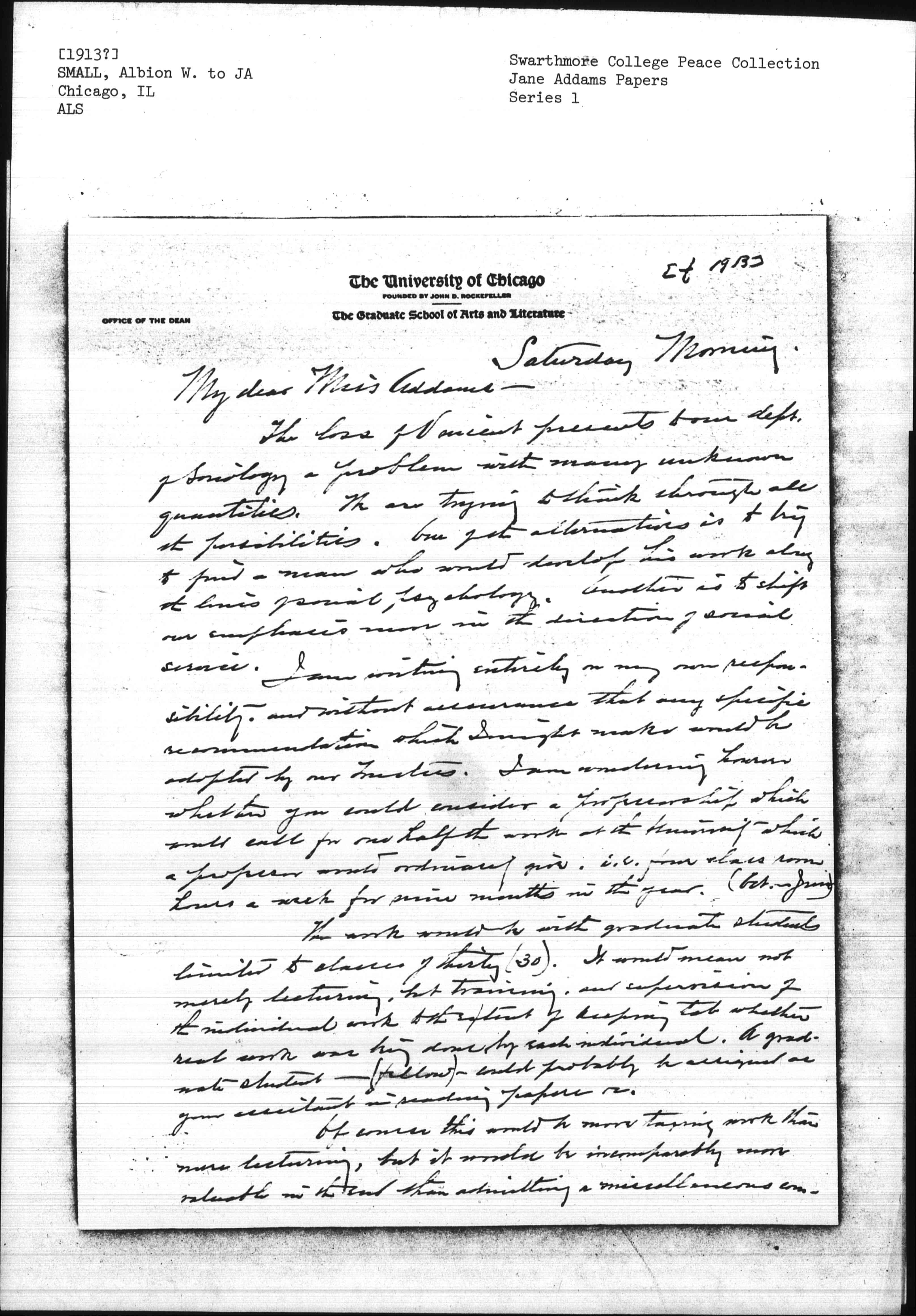 The loss of Vincent presents to our dept. of Sociology a problem with many unknown quantities. We are trying to think through all the possibilities. One of the alternatives is to try to find a man who would develop his work along lines of social psychology. Another is to shift our emphasis more in the direction of social service.