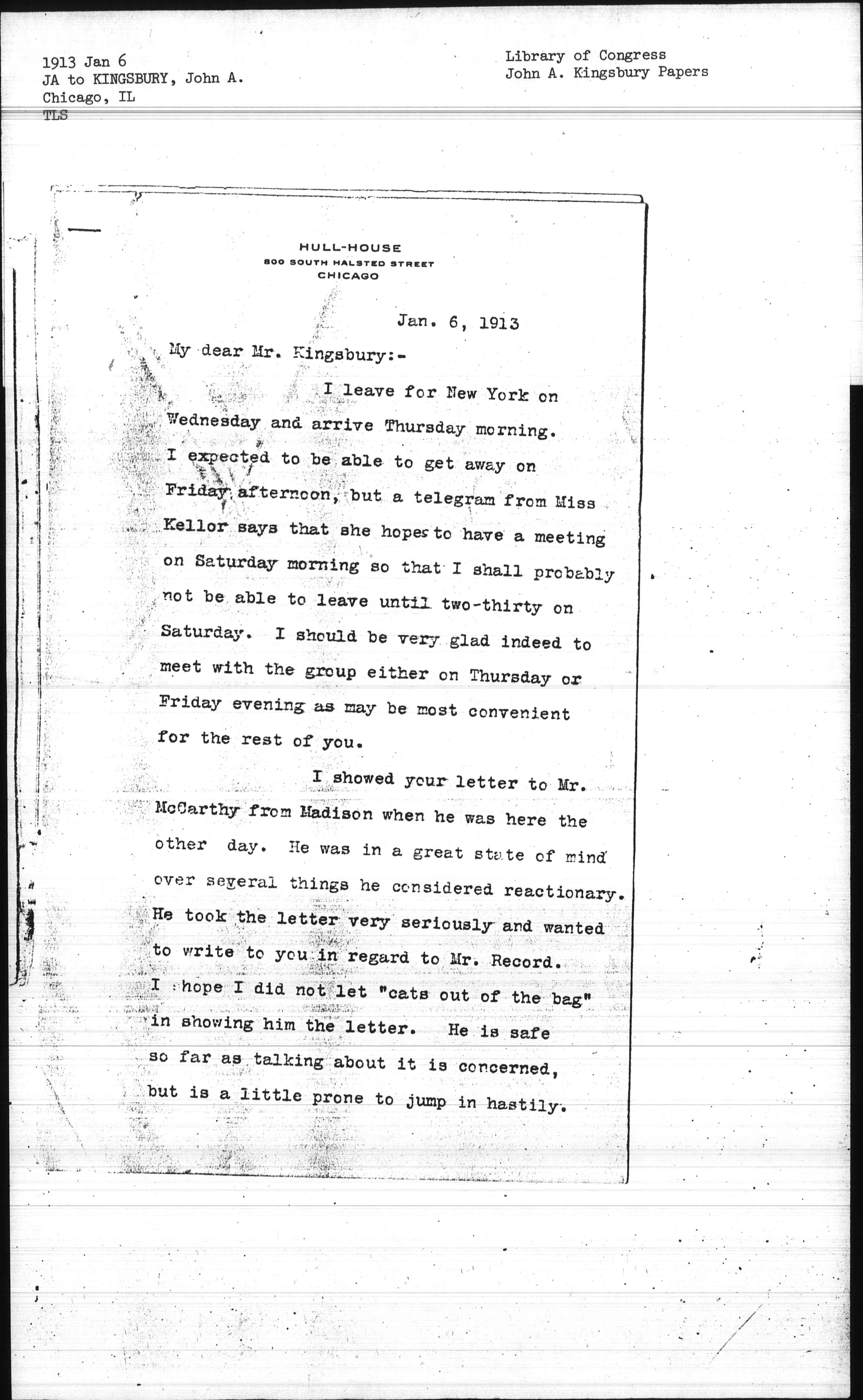 I showed your letter to Mr. McCarthy from Madison when he was here the other day. He was in a great state of mind over several things he considered reactionary. He took the letter very seriously and wanted to write to you in regard to Mr. Record. I hope I did not let "cats out of the bag" in showing him the letter. He is safe so far as talking about it is concerned, but is a little prone to jump in hastily. [page 2] I will probably be at The Hotel Belmont or with Miss Wald, but letters of course would reach me c/o Miss Kellor.