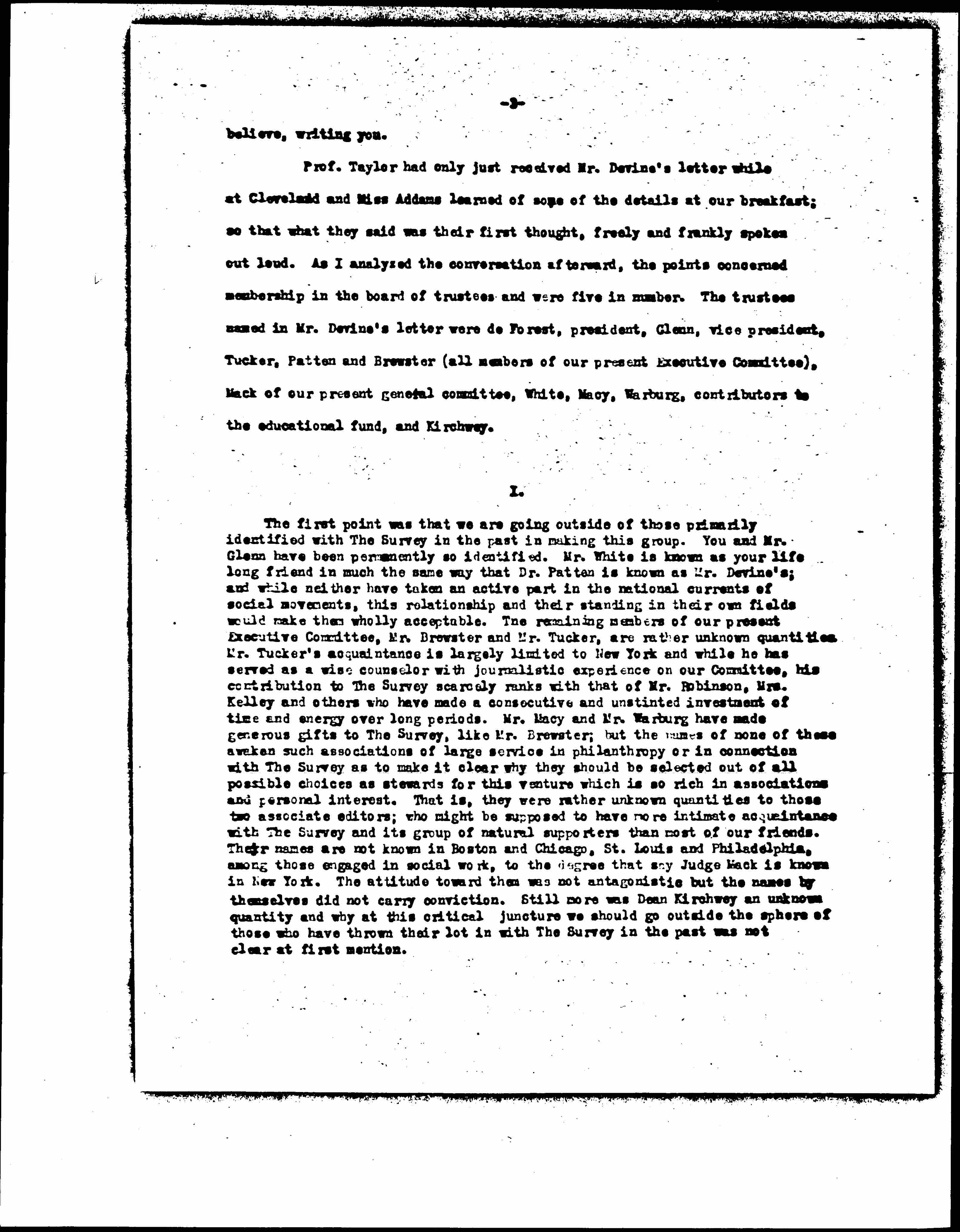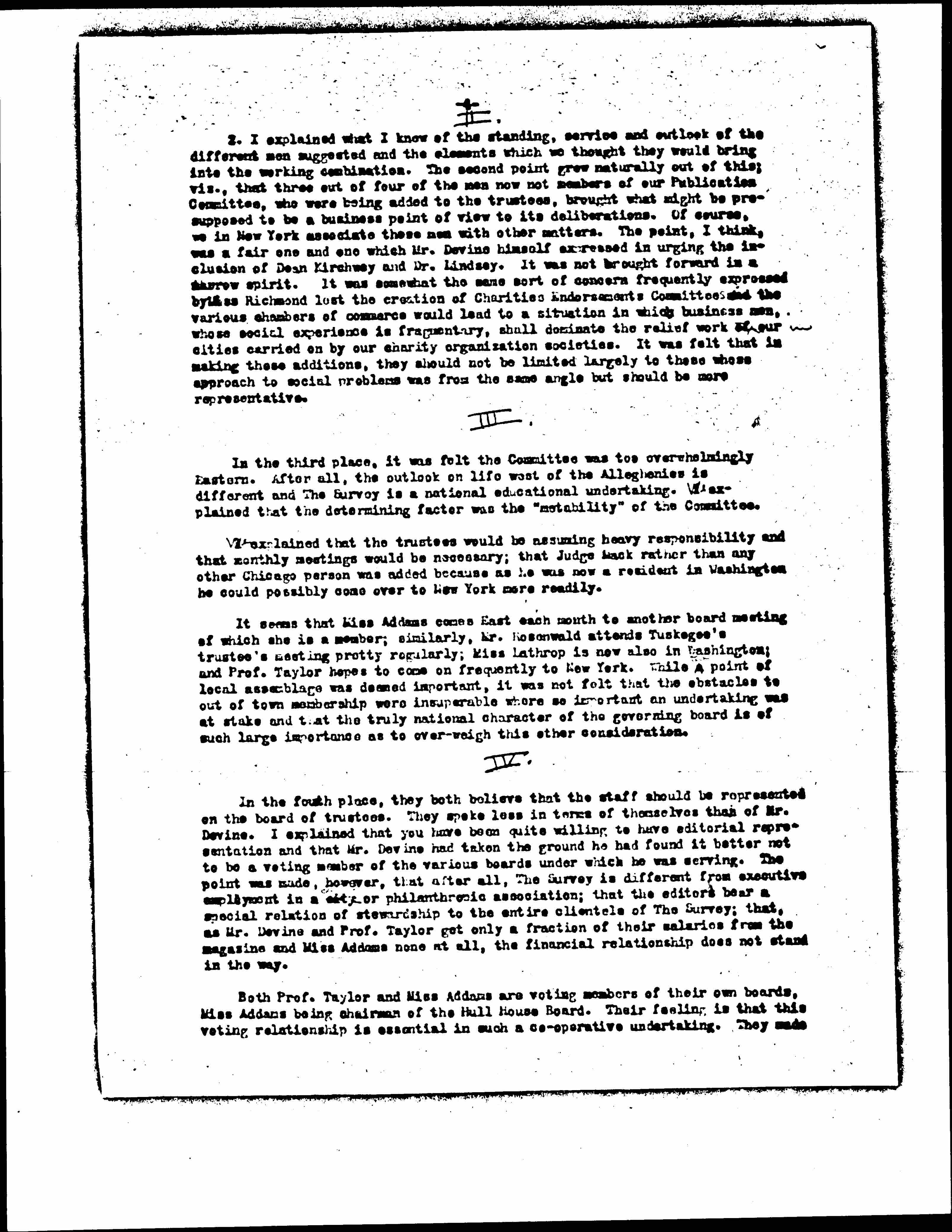 To meet those five points I have one very simple suggestion to make and one which I can make quite freely in that it does not concern myself. It is this: Add Mr. Devine, Prof. Taylor and Miss Addams to the voting board. Whether this should be done by dropping some of those already considered [page 6] or by increasing the size of the board to thirteen, you would be in the best position to judge. These three editors will not bring money resources into the board of trustees like some of the proposed new members; but their ability to raise money has been demonstrated in the past as it will in the future. Like [you] and Mr. Glenn, they would bring resources both of means and mind to the responsible group. They, above all others, have and are investing themselves steadfastly in The Survey. They stand for it in people's minds. They will bring to its councils distinctly the point of view of those whose daily work is with human needs and democratic aspiration -- is with people; they are all three Westerners, yet they will be able to meet monthly with fair regularity, while only one out of ten of the board named are Westerners. They will hold joint membership in the editorial and legislative groups; and they are social workers of the first caliber.