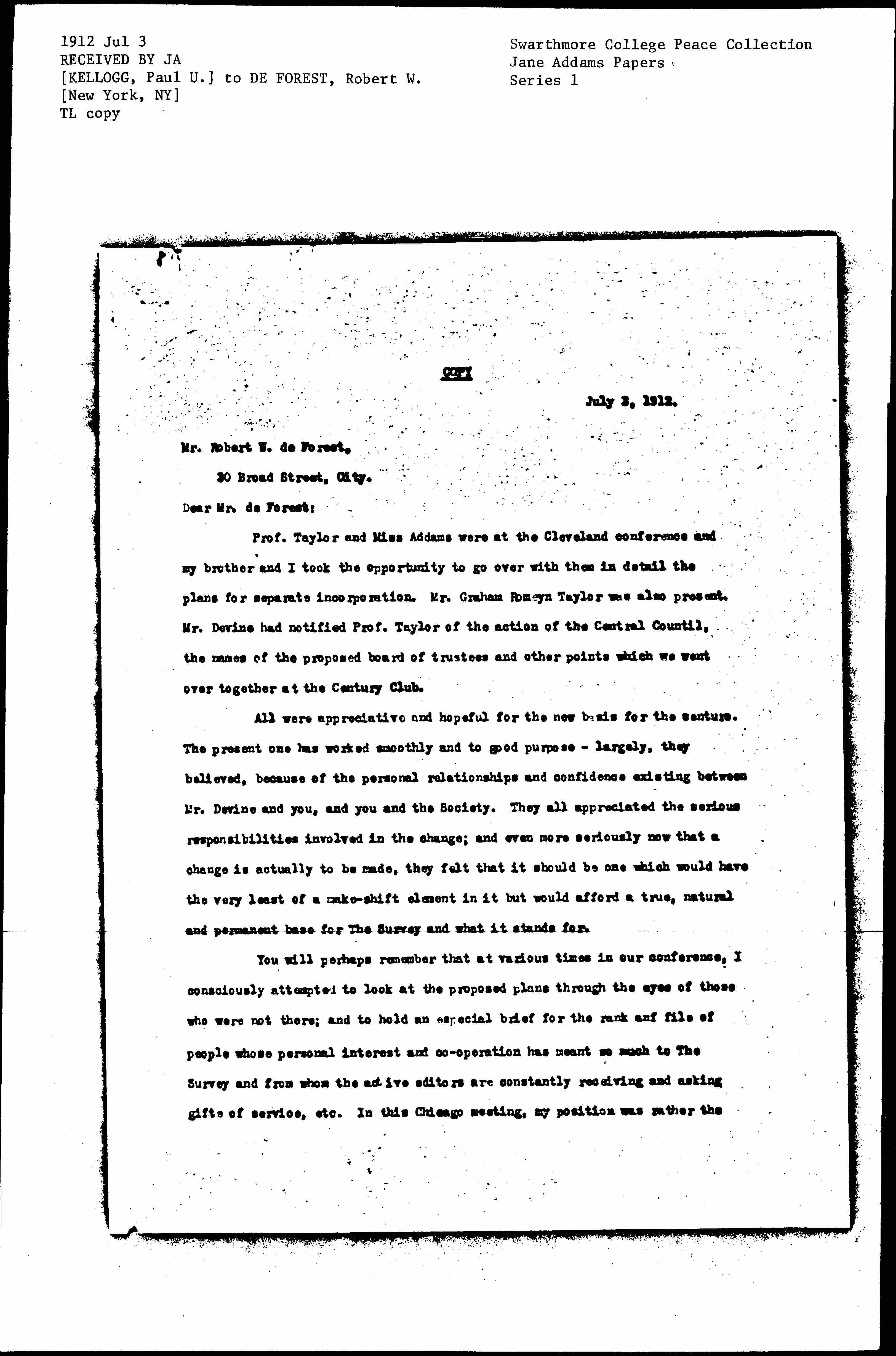 Prof. Taylor and Miss Addams were at the Cleveland conference and my brother and I took the opportunity to go over with them in detail the plans for separate incorporation. Mr. Graham Romeyn Taylor was also present. Mr. Devine had notified Prof. Taylor of the action of the Central [Council], the names of the proposed board of trustees and other points which we went over together at the Century Club.