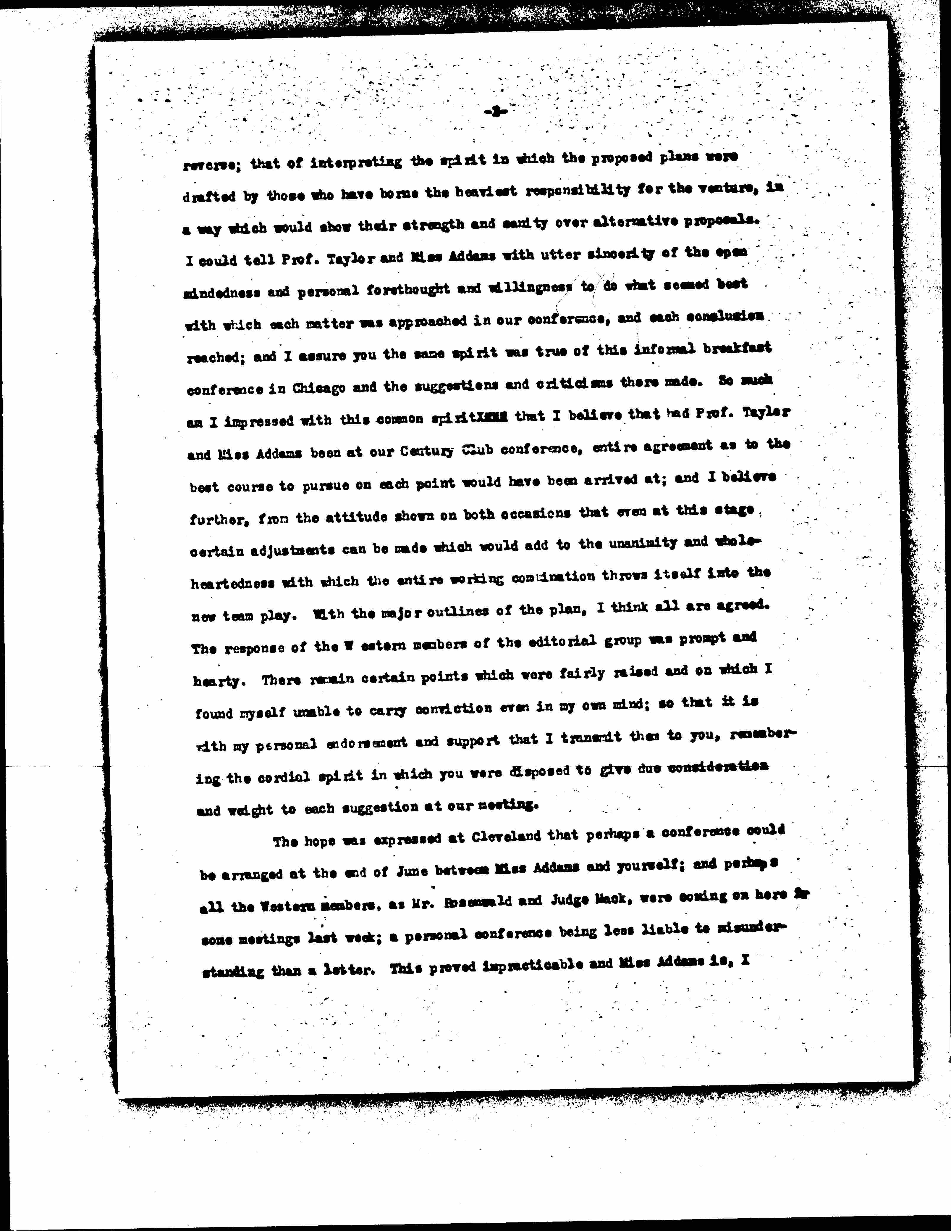 You will perhaps remember that at various times in our conference, I consciously attempted to look at the proposed plans through the eyes of those who were not there; and to hold an especial brief for the rank and file of people whose personal interest and [cooperation] has meant so much to The Survey and from whom the active editors are constantly receiving and asking gifts of service, etc. In this Chicago meeting, my position was rather the [page 2] reverse; that of interpreting the spirit in which the proposed plans were drafted by those who have borne the heaviest responsibility for the venture, in a way which would show their strength and sanity over alternative proposals. I could tell Prof. Taylor and Miss Addams with utter sincerity of the open mindedness and personal forethought and willingness to do what seemed best with which each matter was approached in our conference, and each conclusion reached; and I assure you the same spirit was true of this informal breakfast conference in Chicago and the suggestions and criticisms there made. So much am I impressed with this common spirit that I believe that had Prof. Taylor and Miss Addams been at our Century Club conference, entire agreement as to the best course to pursue on each point would have been arrived at; and I believe further, from the attitude shown on both occasions that even at this stage certain adjustments can be made which would add to the unanimity and wholeheartedness with which the entire working combination throws itself into the new team play. With the major outlines of the plan, I think all are agreed. The response of the Western members of the editorial group was prompt and hearty. There remain certain points which were fairly raised and on which I found myself unable to carry conviction even in my own mind; so that it is with my personal endorsement and support that I transmit them to you, remembering the cordial spirit in which you were disposed to give due consideration and weight to each suggestion at our meeting.