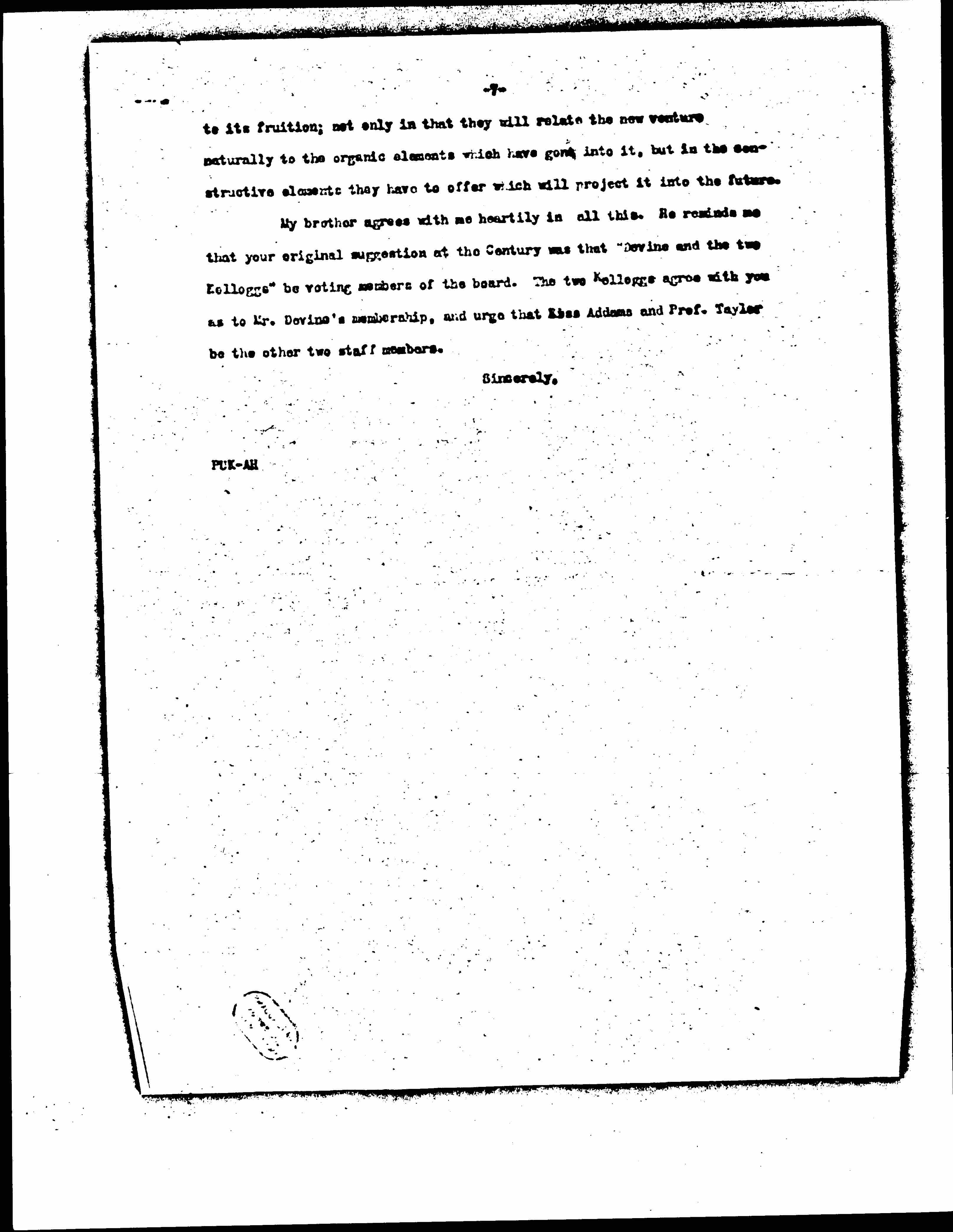 My brother agrees with me heartily in all this. He reminds me that your original suggestion at the Century was that "Devine and the two Kelloggs" be voting members of the board. The two Kelloggs agree with you as to Mr. Devine's membership, and urge that Miss Addams and Prof. Taylor be the other two staff members.
