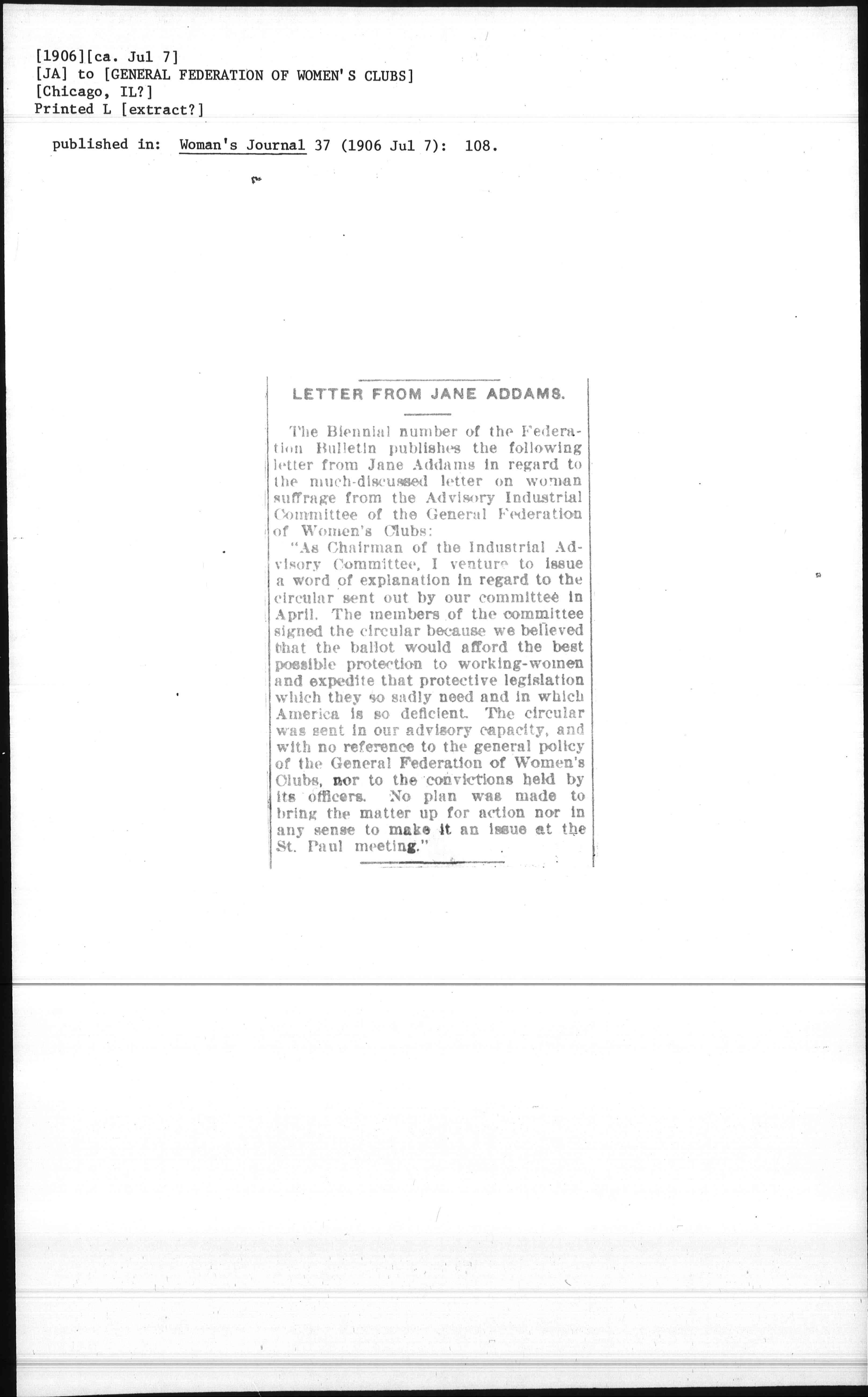 The Biennial number of the Federation Bulletin publishes the following letter from Jane Addams in regard to the much-discussed letter on woman suffrage from the Advisory Industrial Committee of the General Federation of Women's Clubs: