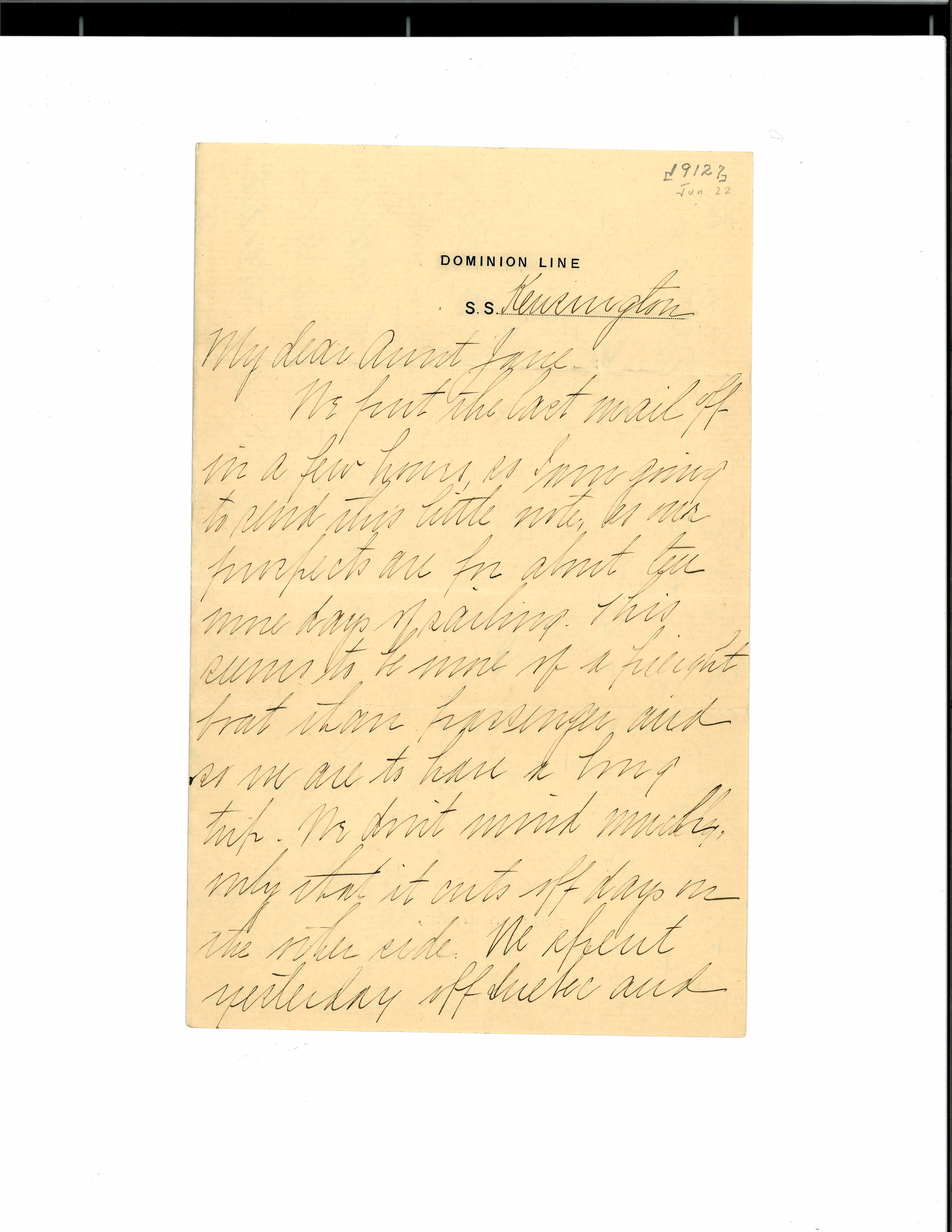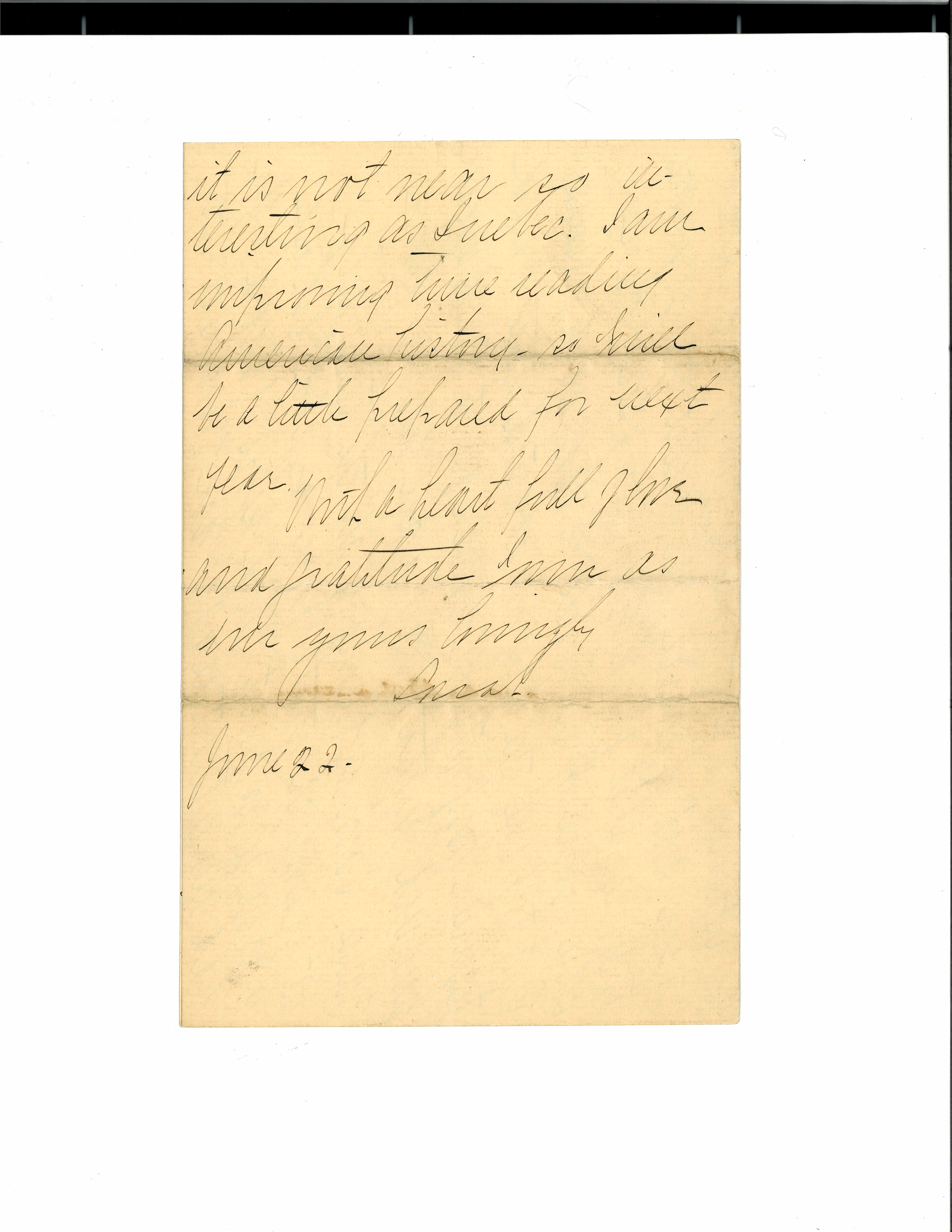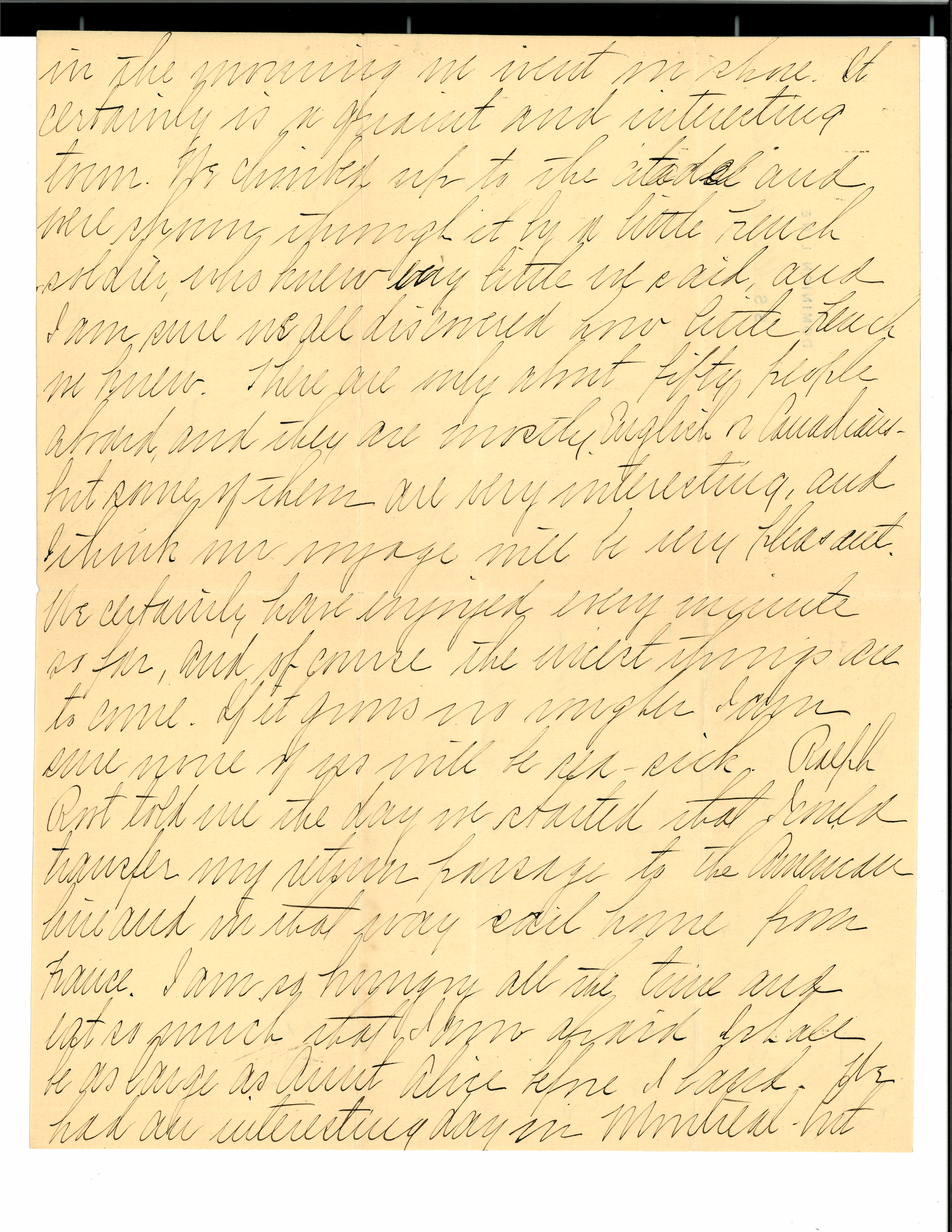 We put the last mail off in a few hours, so I now going to send this little note, as our prospects are for about ten more days of sailing. This seems to be more of a freight boat than passenger and so we are to have a long trip. We don't mind much, only that it cuts off days on the other side. We spent yesterday off Quebec and [page 2] in the [morning] we went on shore. It certainly is a quaint and interesting town. We climbed up to the citadel and were shown through it by a little French soldier, who knew very little he said, and I am sure we all discovered how little French we knew. There are only about fifty people abroad and they are mostly English or Canadian, but some of them are very interesting, and I think the voyage will be very pleasant. We certainly have enjoyed every minute so far, and of course the nicest things are to come. If it grows [illegible] [rough?] I am sure more of us will be sea-sick. Ralph Root told me the day we started that I could transfer my return passage to the American line and in that way sail home from France. I am so hungry all the time and eat so much that I [am] afraid I shall be as large as Aunt Alice before I land. We had an interesting day in Montreal, but [page 3] it is not near so interesting as Quebec. I am improving time reading American history -- so I will be a little prepared for next year.