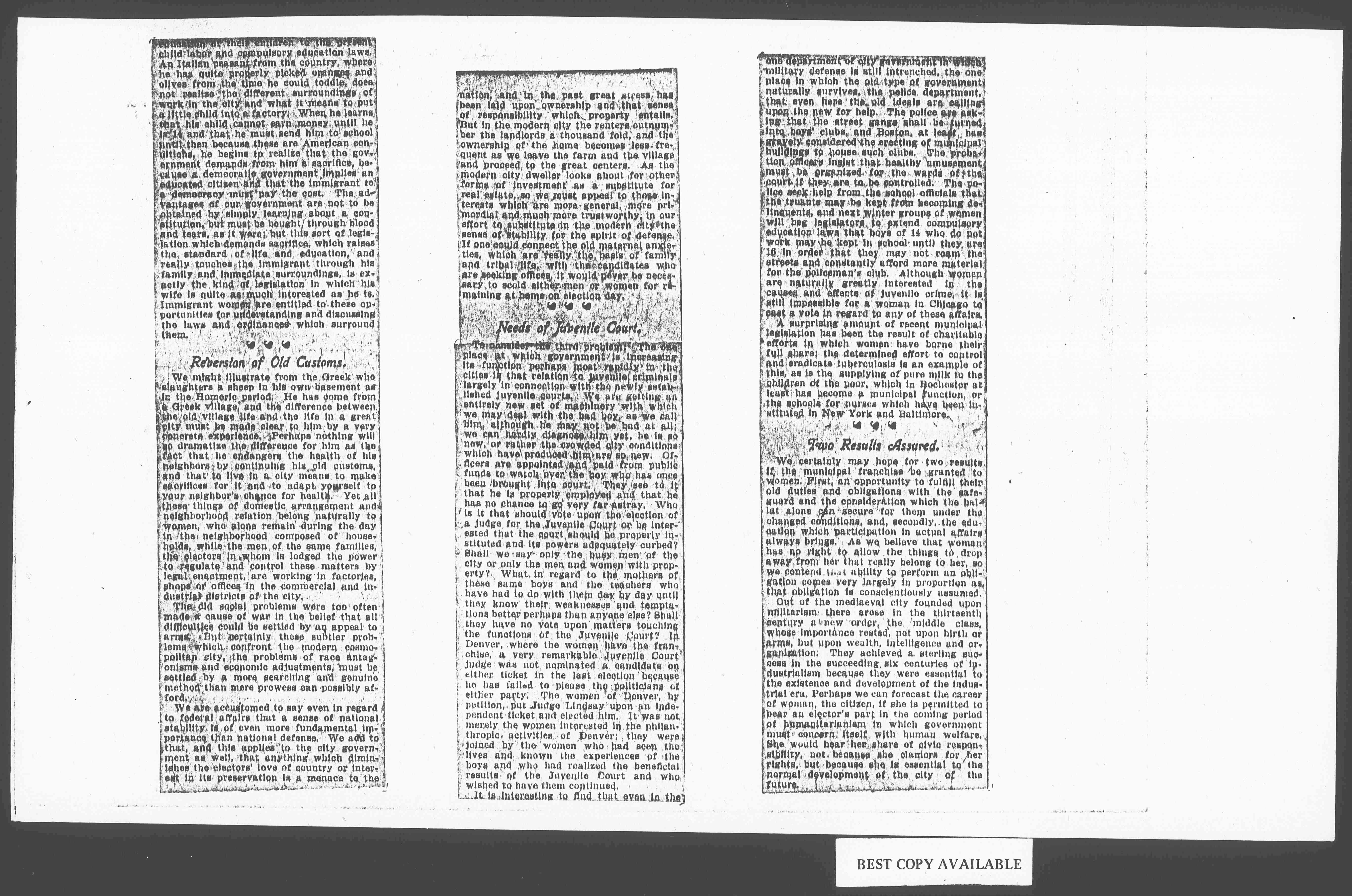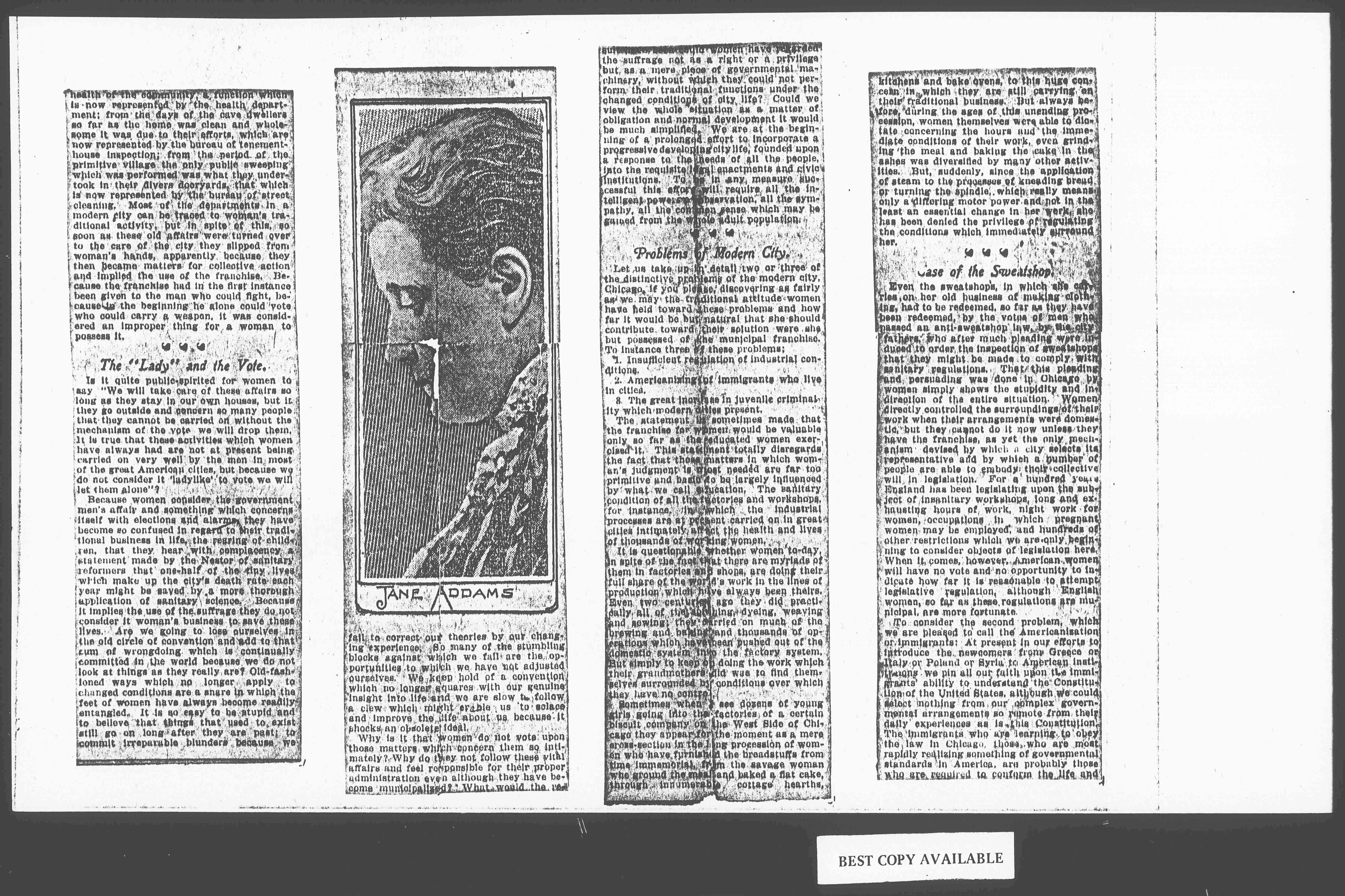 Because all these things have traditionally been in the hands of women, if they take no part in it now they are not only missing the education which the natural participation in civic life would bring to them, but they are losing what they have always had. From the beginning of tribal life they have been held responsible for the [page 2] health of the community, a function which is now represented by the health department; from the days of the cave dwellers so far as the home was clean and wholesome it was due to their efforts, which are now represented by the bureau of tenement-house inspection; from the period of the primitive village the only public sweeping which was performed was what they undertook in their [diverse] dooryards, that which is now represented by the bureau of street cleaning. Most of the departments in a modern city can be traced to woman's traditional activity, but in spite of this, so soon as these old affairs were turned over to the care of the city they slipped from woman's hands, apparently because they then became matters for collective action and implied the use of the franchise. Because the franchise had in the first instance been given to the man who could fight, becuase in the beginning he alone could vote who could carry a weapon, it was considered an improper thing for a woman to possess it.