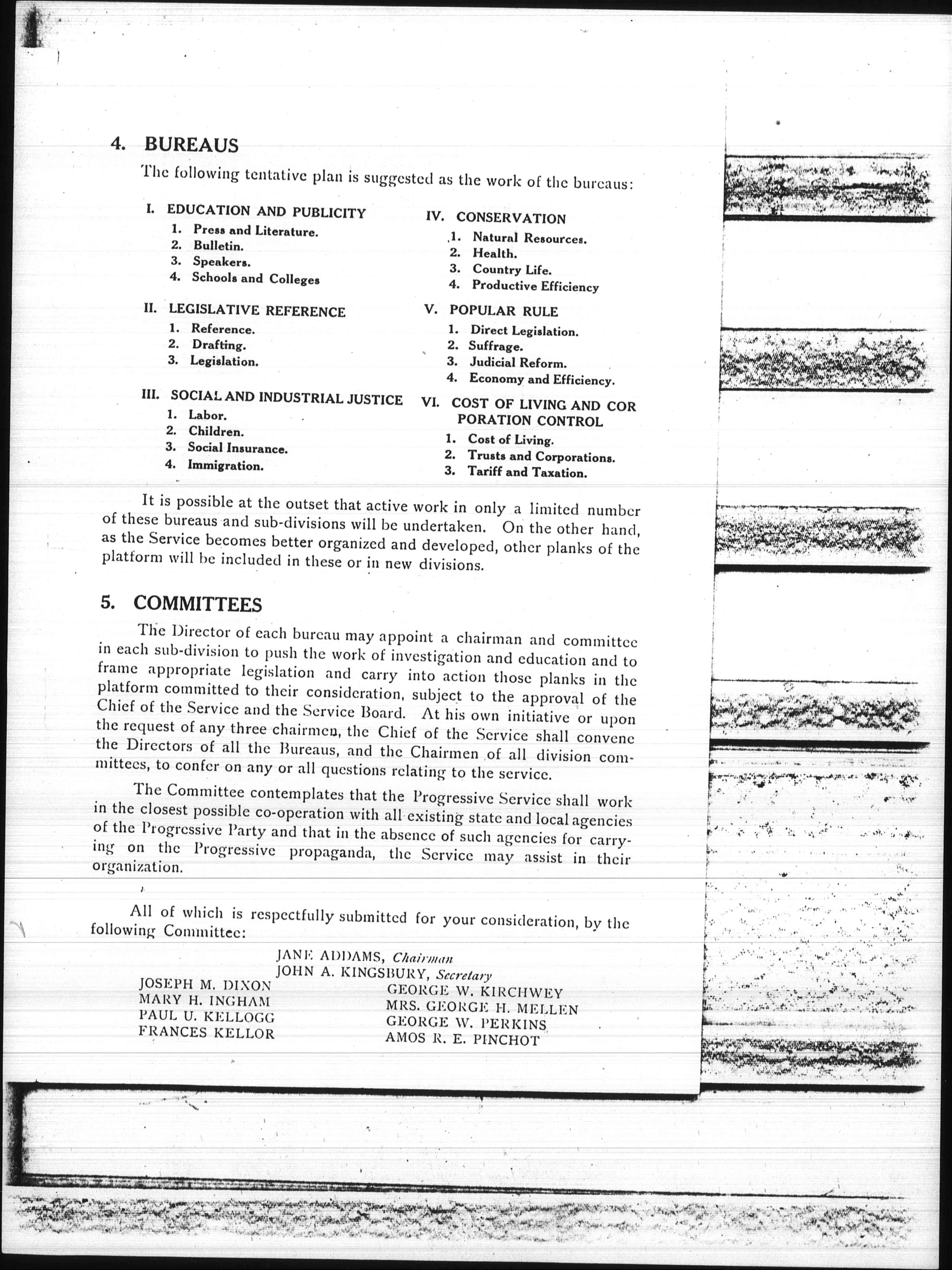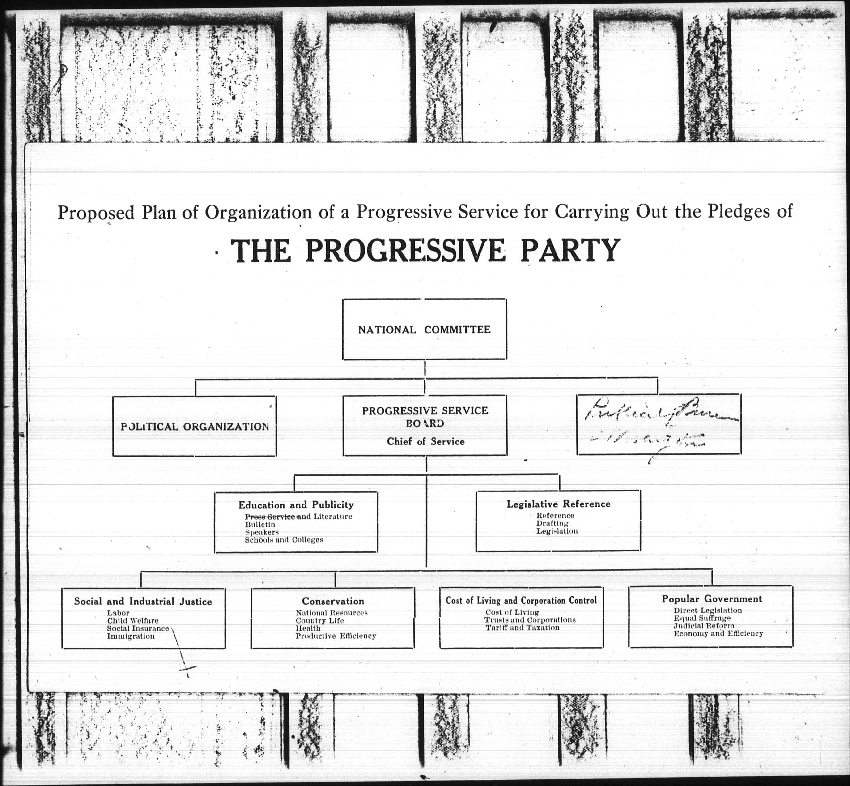 Believing that the pledges of our party are to be redeemed, not only through political organization but through the acceptance by the American people of Progressive principles, and the achievement through legislation of the policies for which the party stands, the Committee recommends the creation of a Progressive Service, responsible directly to the National Committee of the Progressive Party.