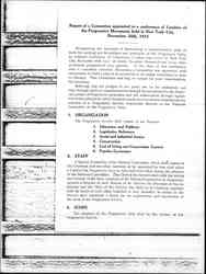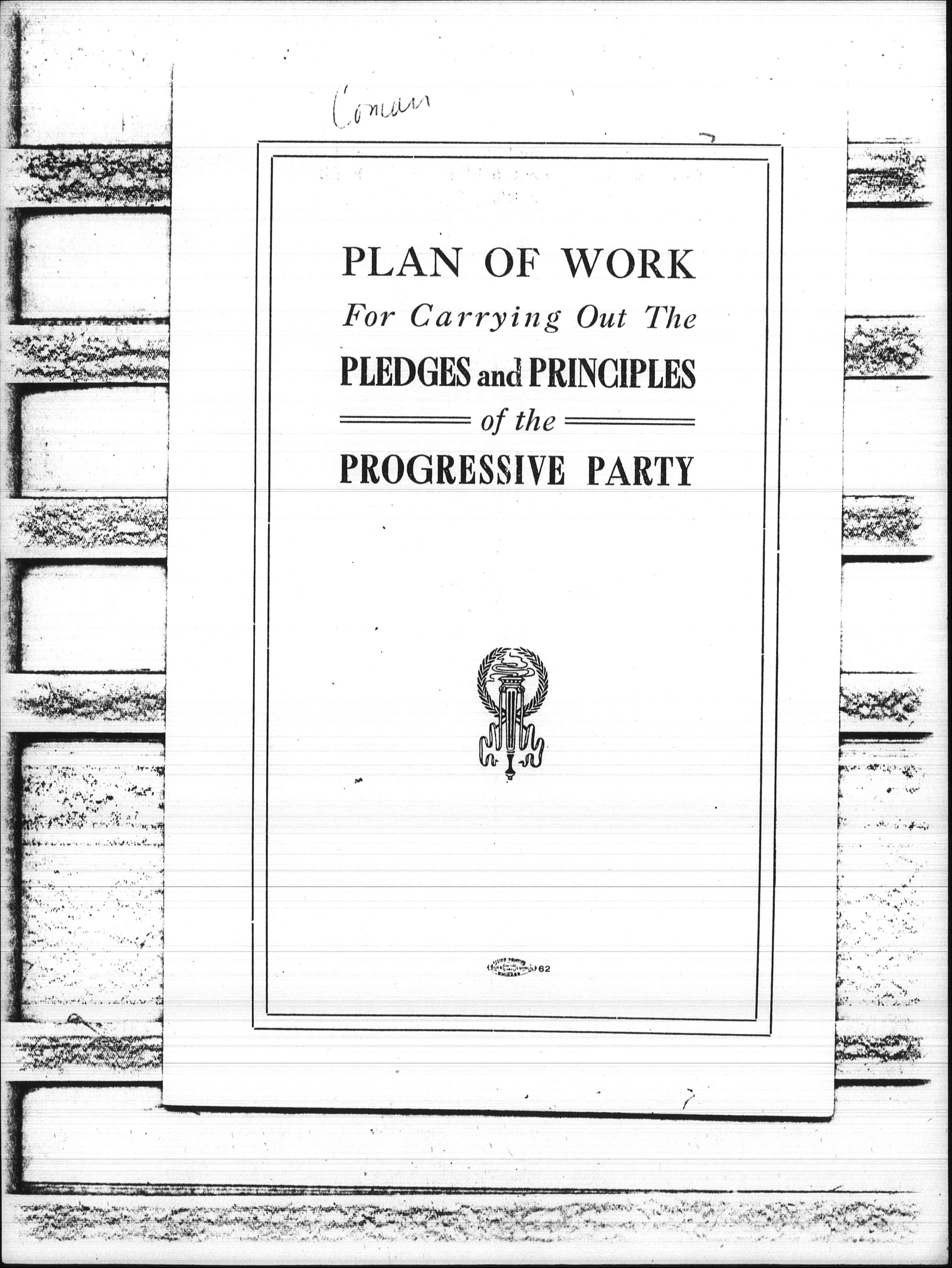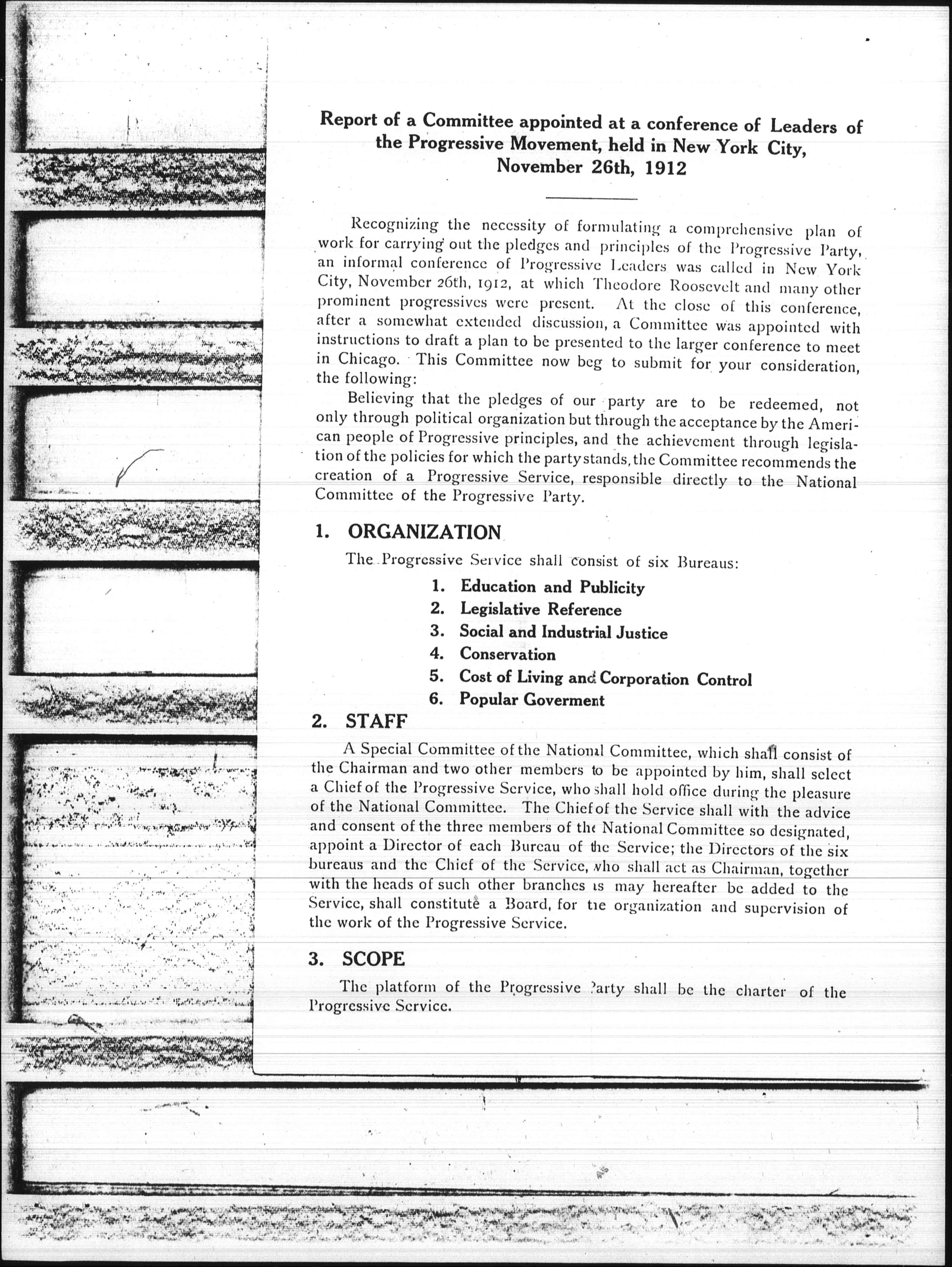 Recognizing the necessity of formulating a comprehensive plan of work for carrying out the pledges and principles of the Progressive Party, an informal conference of Progressive Leaders was called in New York City, November 26th, 1912, at which Theodore Roosevelt and many other prominent progressives were present. At the close of this conference, after a somewhat extended discussion, a Committee was appointed with instructions to draft a plan to be presented to the larger conference to meet in Chicago. This Committee now beg to submit for your consideration the following: