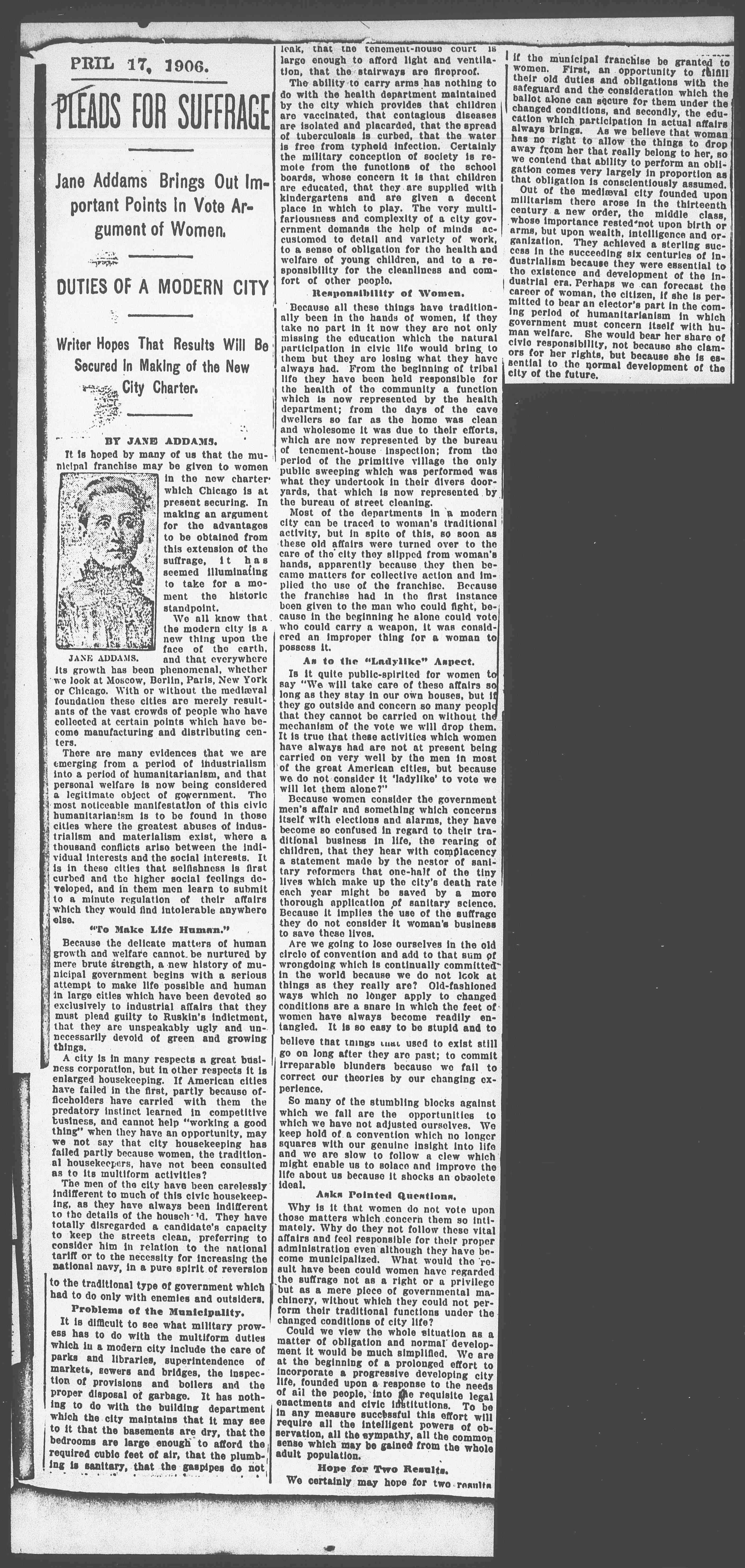 Why is it that women do not vote upon those matters which concern them so intimately. Why do they not follow these vital affairs and feel responsible for their proper administration even although they have become municipalized. What would the result have been could women have regarded the suffrage not as a right or a privilege but as a mere piece of governmental machinery, without which they could not perform their traditional functions under the changed conditions of city life?