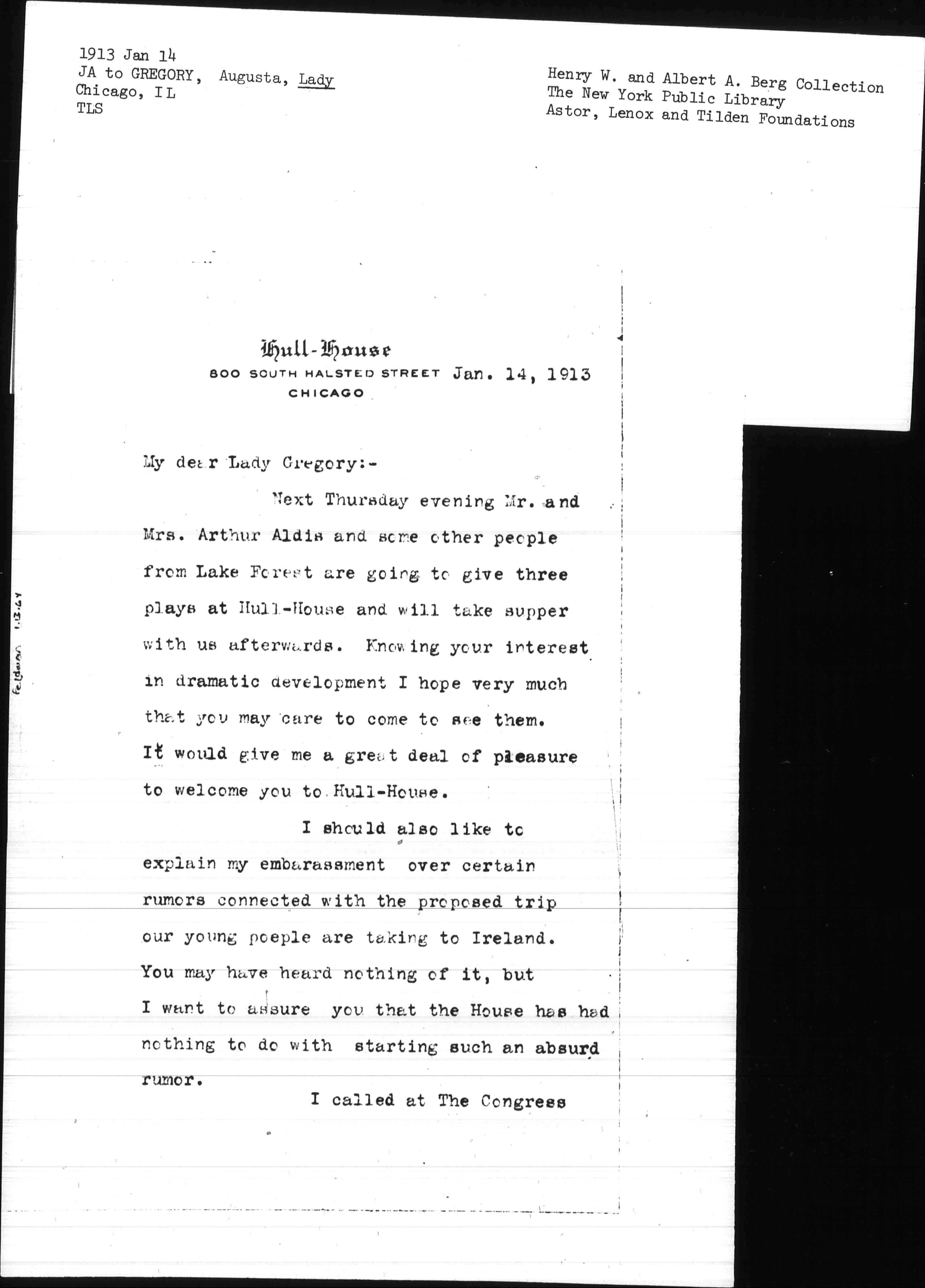 Next Thursday evening Mr. and Mrs. Arthur Aldis and some other people from Lake Forest are going to give three plays at Hull-House and will take supper with us afterwards. Knowing your interest in dramatic development I hope very much that you may care to come to see them. It would give me a great deal of pleasure to welcome you to Hull-House.