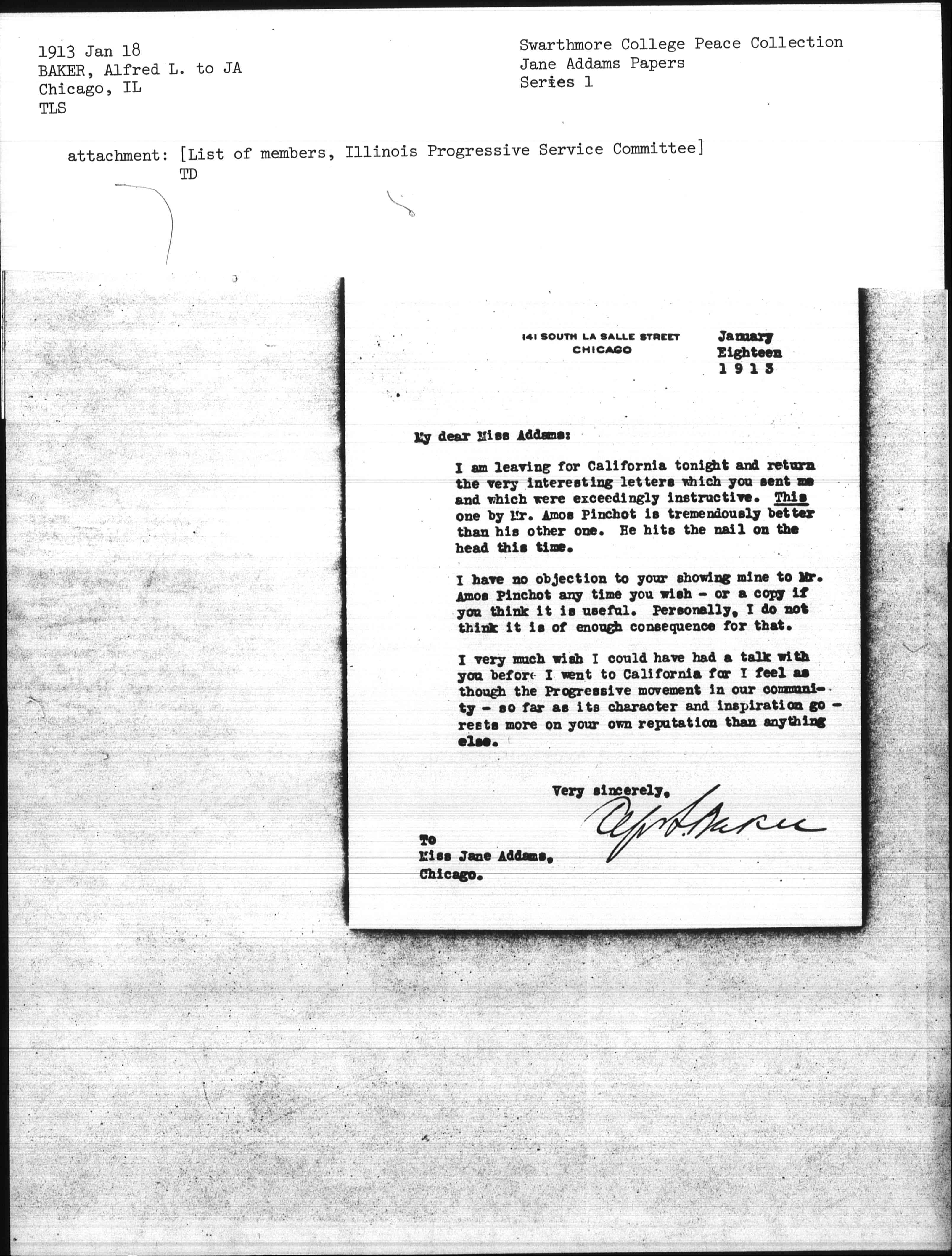 I am leaving for California tonight and return the very interesting letters which you sent me and which were exceedingly instructive. This one by Mr. Amos Pinchot is tremendously better than his other one. He hits the nail on the head this time.