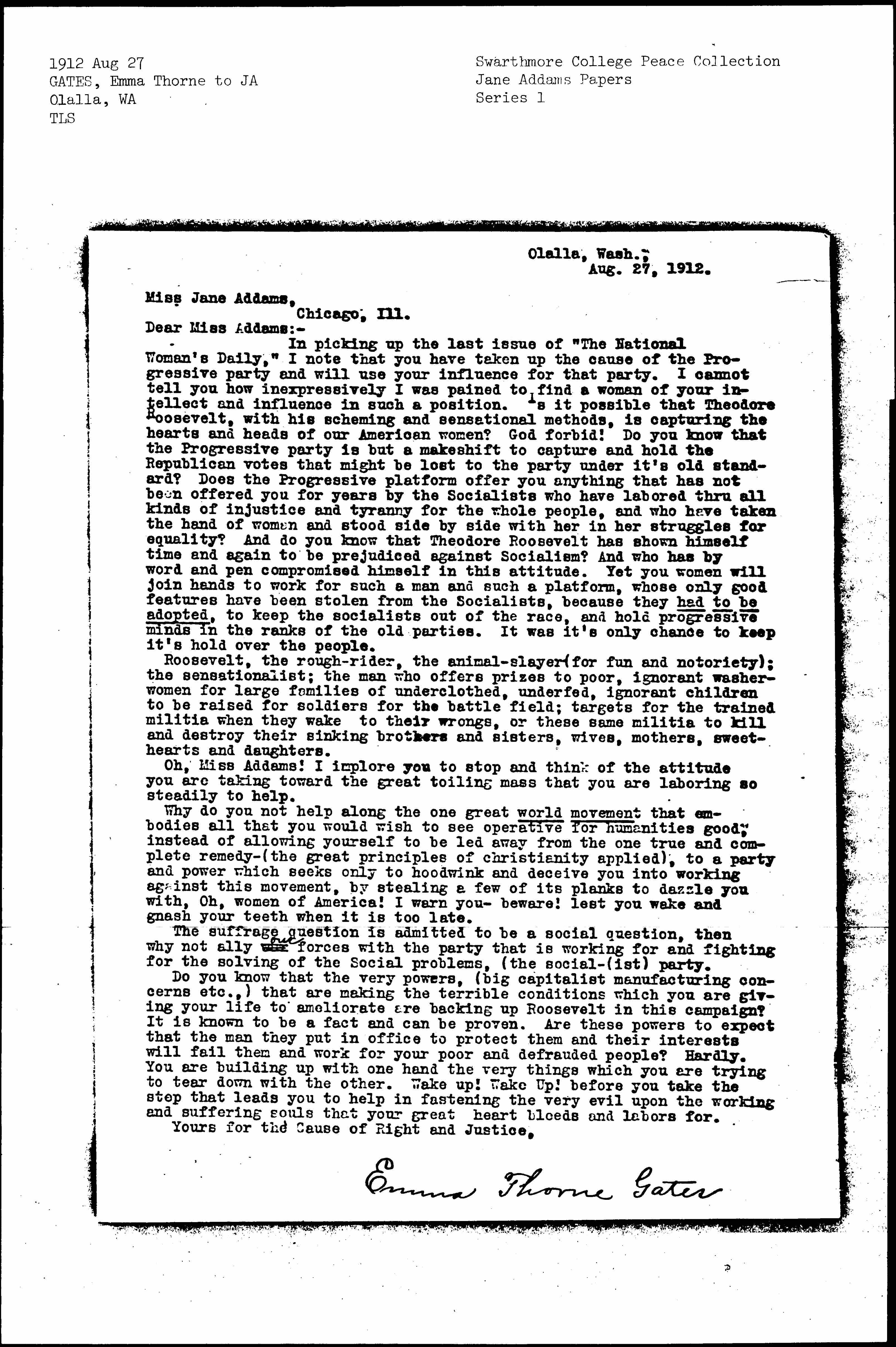 In picking up the last issue of "The National Woman's Daily," I note that you have taken up the cause of the Progressive party and will use your influence for that party. I cannot tell you how inexpressively I was pained to find a woman of your intellect and influence in such a position. Is it possible that Theodore Roosevelt, with his scheming and sensational methods, is capturing the hearts and heads of our American women? God forbid! Do you know that the Progressive party is but a makeshift to capture and hold the Republican votes that might be lost to the party under it's old standard? Does the Progressive platform offer you anything that has not been offered you for years by the Socialists who have labored [through] all kinds of injustice and tyranny for the whole people, and who have taken the hand of women and stood side by side with her in her struggles for equality? And do you know that Theodore Roosevelt has shown himself time and again to be prejudiced against Socialism? And who has by word and pen compromised himself in this attitude. Yet you women will join hands to work for such a man and such a platform, whose only good features have been stolen from the Socialists, because they had to be adopted, to keep the socialists out of the race, and hold progressive minds in the ranks of the old parties. It was it's only chance to keep it's hold over the people.