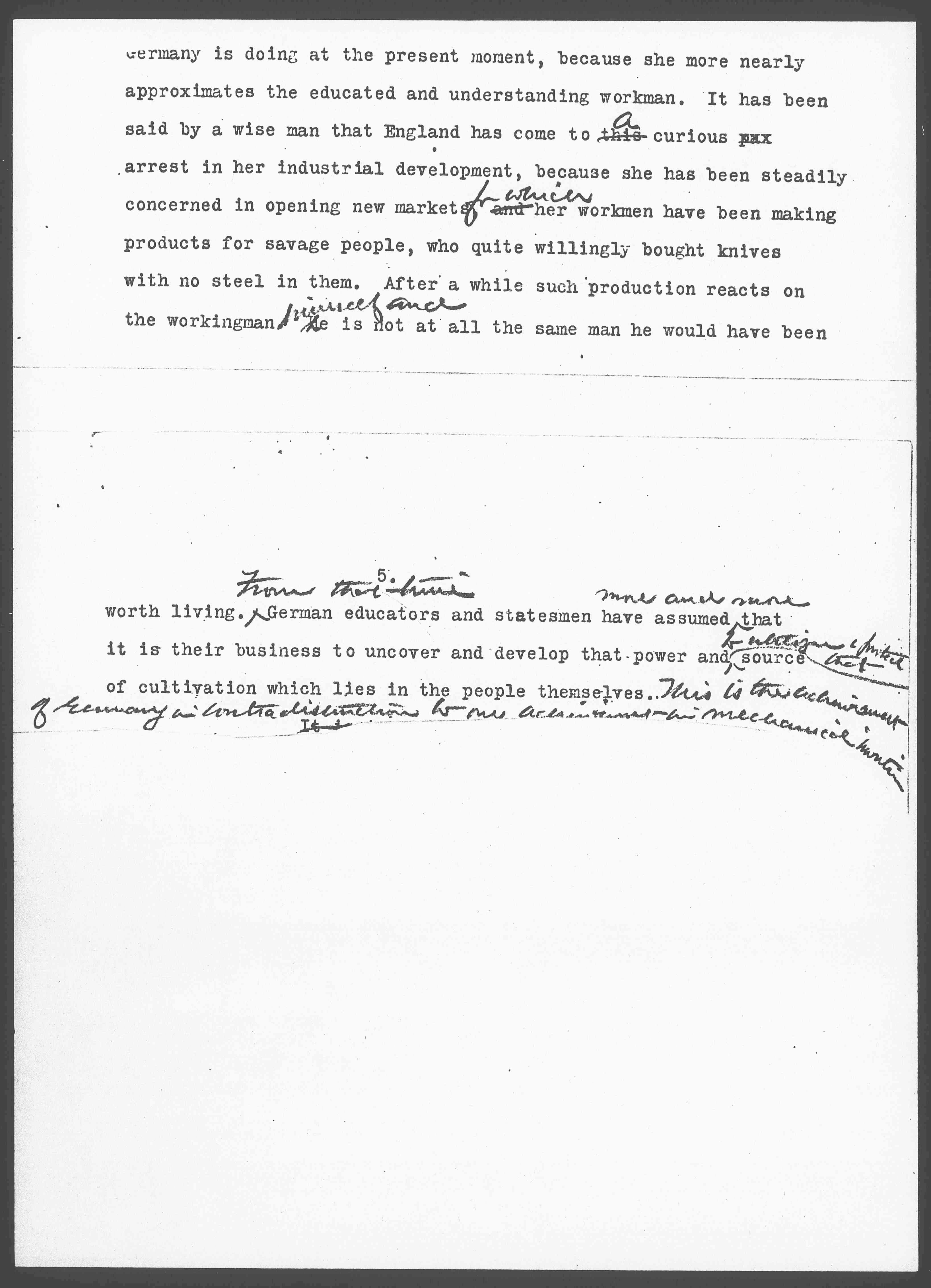 [cut, at top of page] Germany is doing at the present moment, because she more nearly approximates the educated and understanding workman. It has been said by a wise man that England has come to this ↑a↓ curious illegible arrest in her industrial development, because she has been steadily concerned in opening new markets ↑for which↓ and her workmen have been making products for savage people, who quite willingly bought knives with no steel in them. After a while such production reacts on the workingman ↑himself and↓ he is not at all the same man he would have been [page 6]