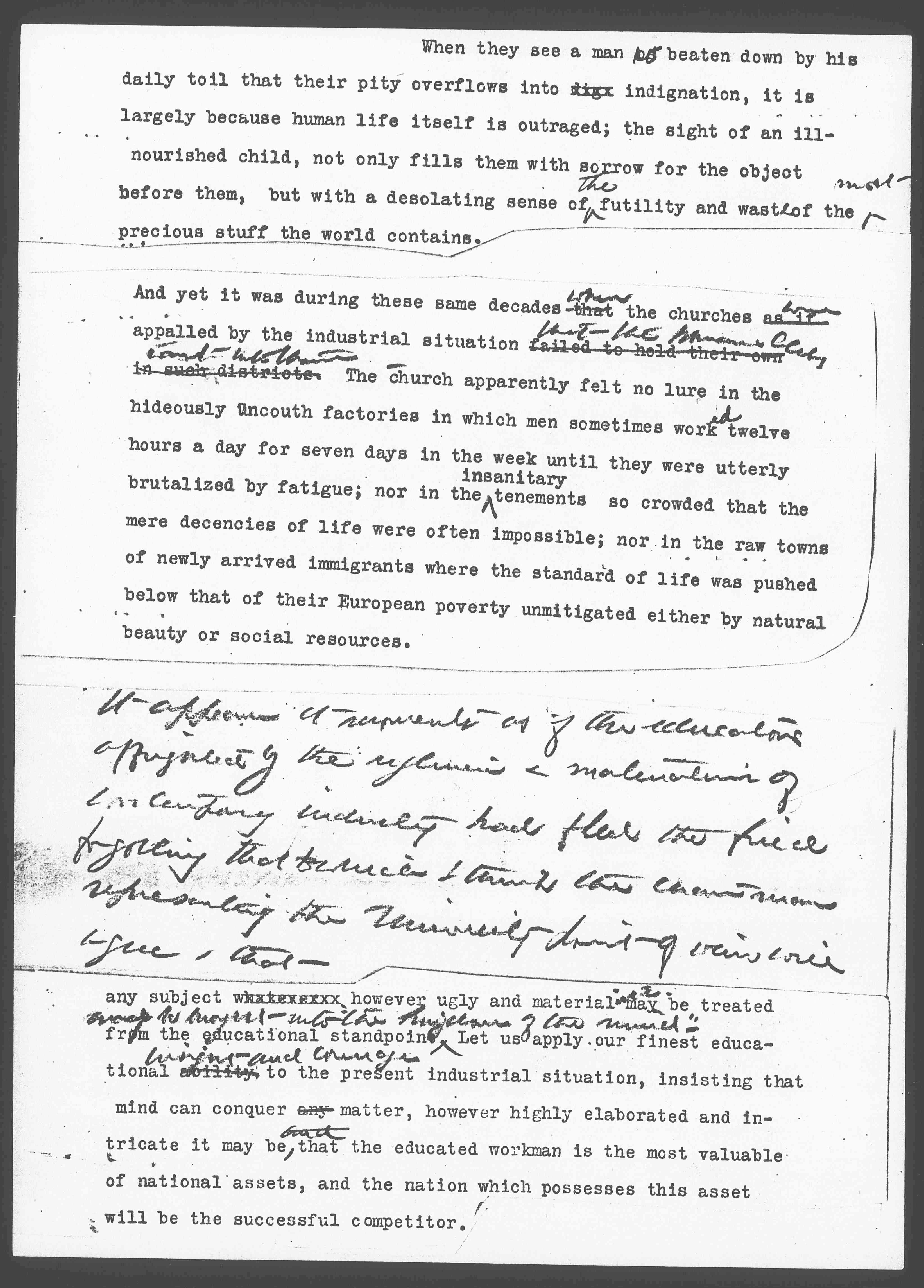 [cut] any subject illegible however ugly and materialistic, may be treated from the educational standpoint ↑may be brought into the "kingdom of the mind."↓ Let us apply our finest educational ability ↑insight and courage↓ to the present industrial situation, insisting that mind can conquer any matter, however highly elaborated and intricate it may be, ↑and↓ that the educated workman is the most valuable of national assets, and the nation which possessed this asset will be the successful competitor.