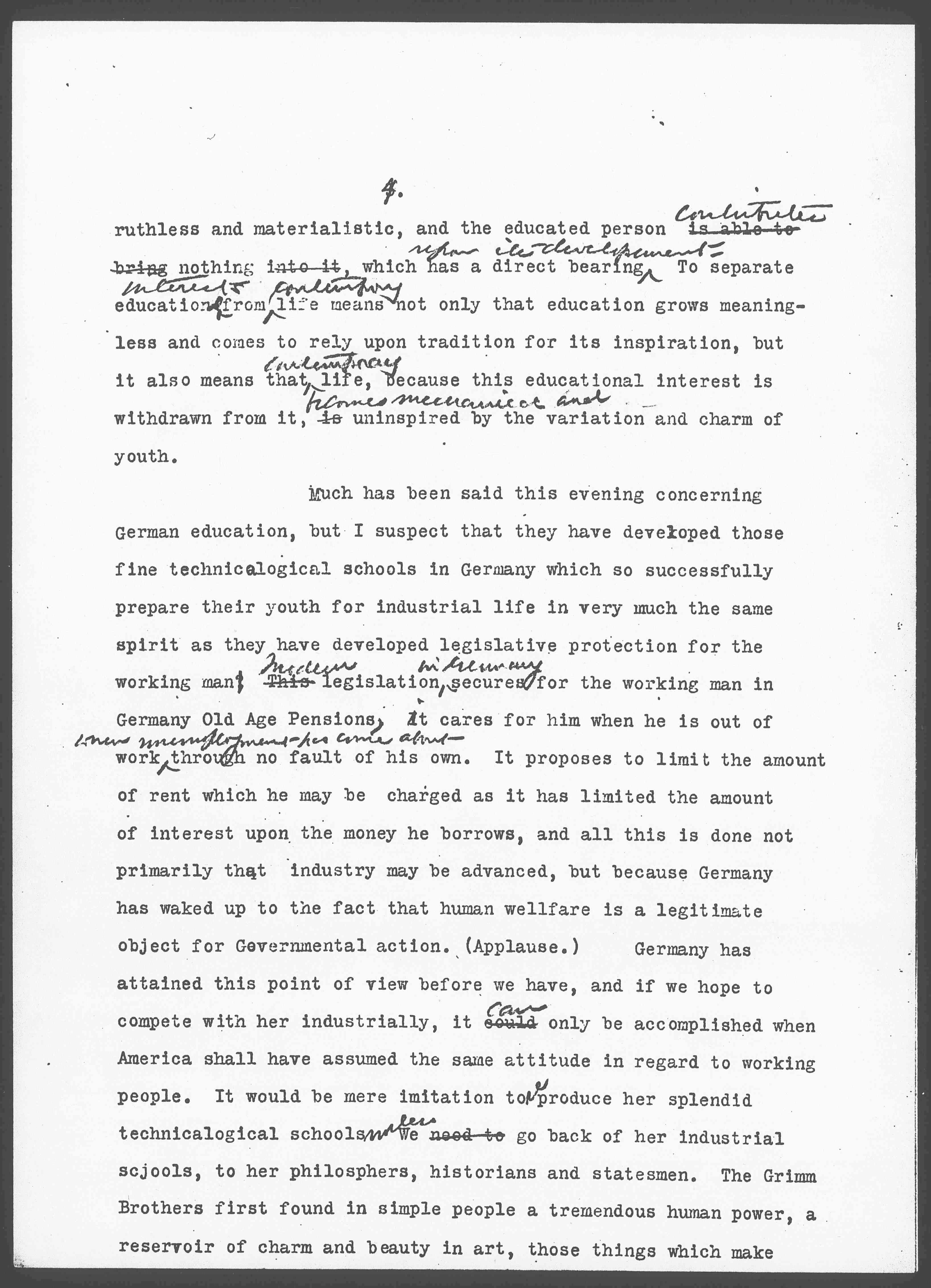 Much has been said this evening concerning German education, but I suspect that they have developed those fine technological schools in Germany which so successfully prepare their youth for industrial life in very much the same spirit as they have developed legislative protection for the working man. This ↑Modern↓ legislation ↑in Germany↓ secures for the working man in Germany Old Age Pensions, it cares for him when he is out of work ↑when unemployment has come about↓ through no fault of his own. It proposes to limit the amount of rent which he may be charged as it has limited the amount of interest upon the money he borrows, and all this is done not primarily that industry may be advanced, but because Germany has waked up to the fact that human [welfare] is a legitimate object for Governmental action. (Applause.) Germany has attained this point of view before we have, and if we hope to compete with her industrially, it could ↑can↓ only be accomplished when America shall have assumed the same attitude in regard to working people. It would be mere imitation to reproduce her splendid technological schools ↑unless↓ we need to go back of her industrial schools, to her philosophers, historians and statesmen. The Grimm Brothers first found in simple people a tremendous human power, a reservoir of charm and beauty in art, those things which make [page 5]