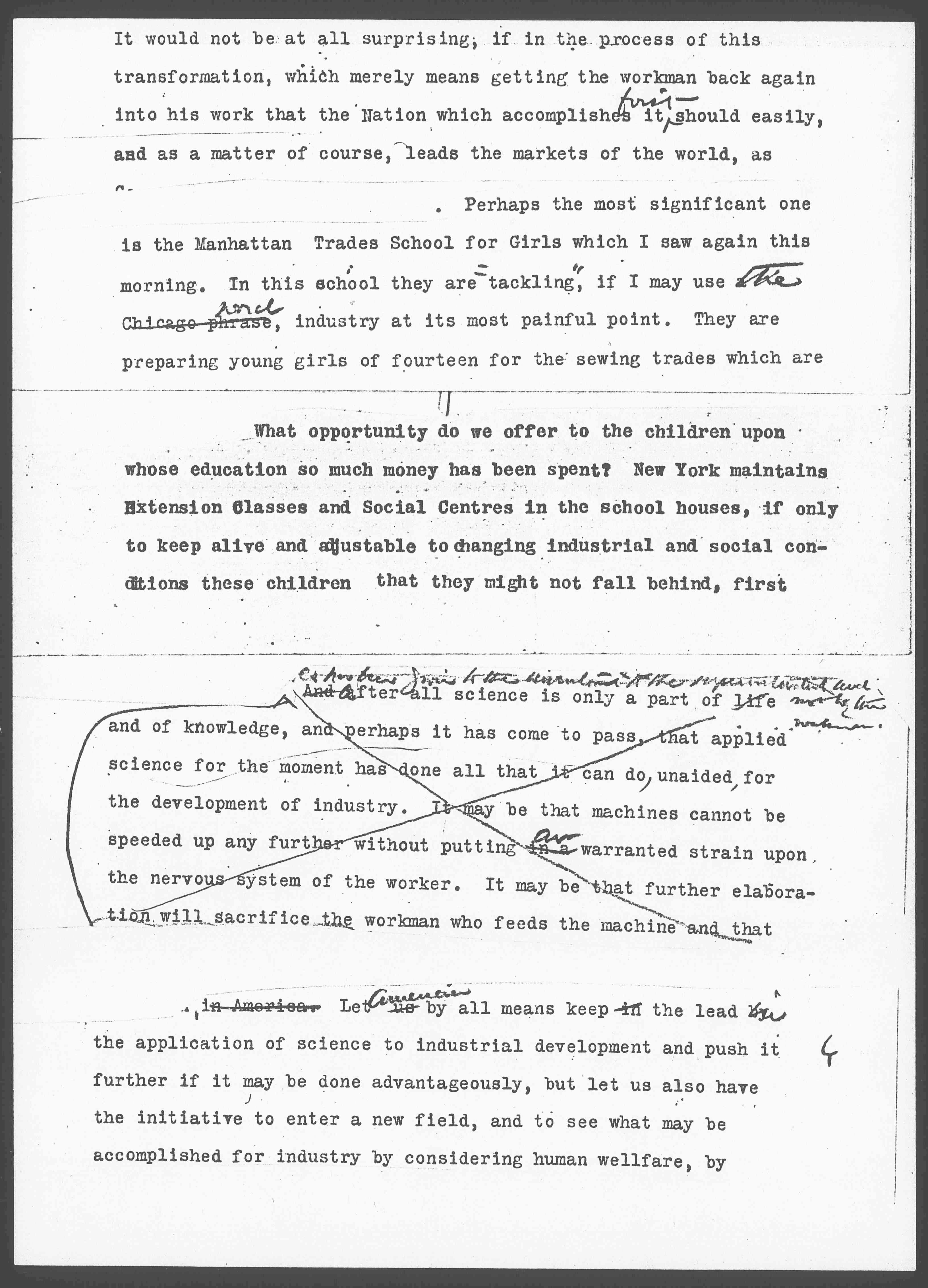 [cut] ↑As has been given to the inventor & to the superintendent and not to the workman.↓ And after all science is only a part of life and of knowledge, and perhaps it has come to pass, that applied science for the moment has done all that it can do, unaided, for the development of industry. It may be that machines cannot be speeded up any further without putting in a ↑an↓ unwarranted strain upon the nervous system of the worker. It may be that further elaboration will sacrifice the workman who feeds the machine, and that