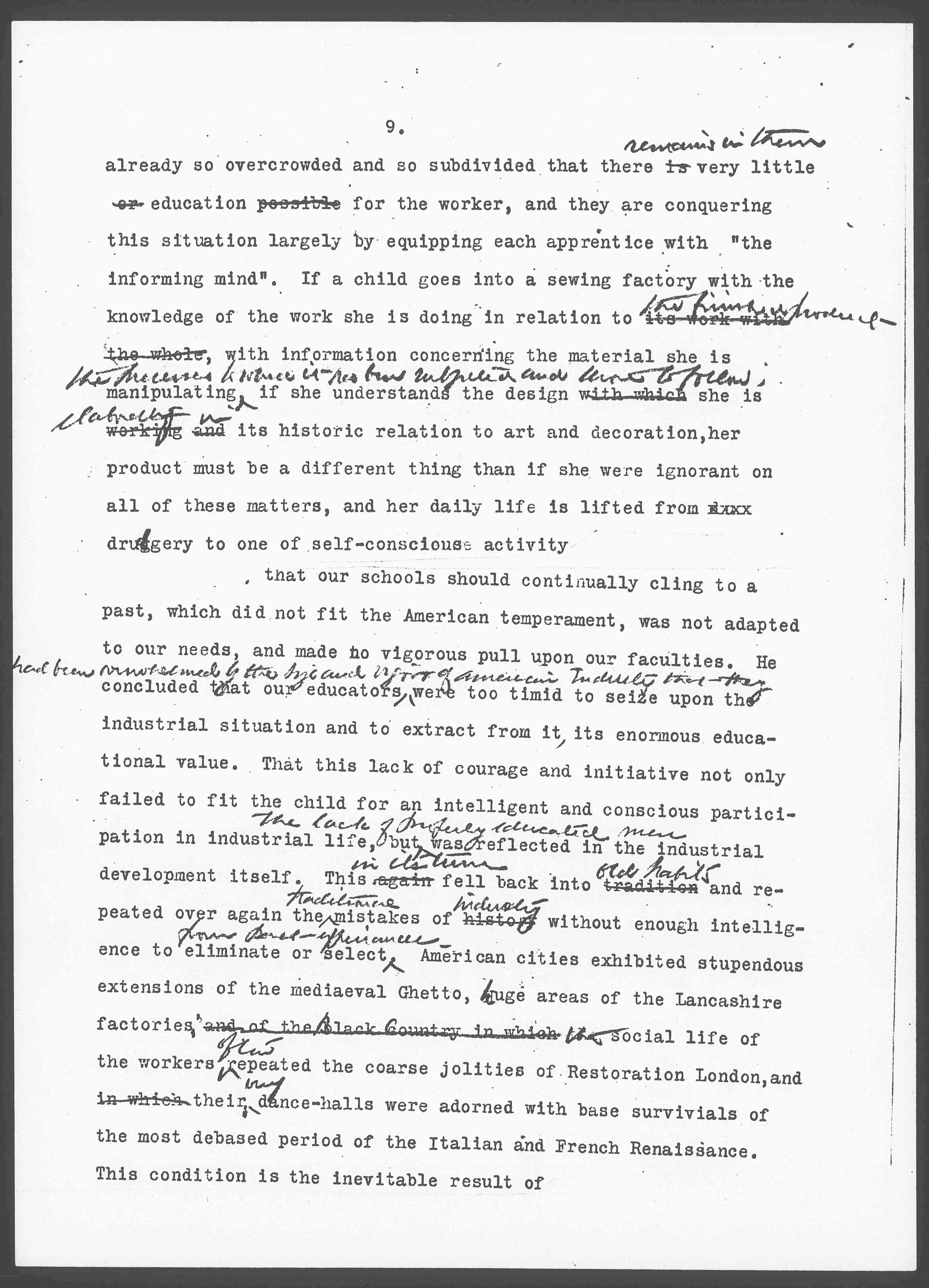 [cut] that our schools should continually cling to a past, which did not fit the American temperament, was not adapted to our needs, and made no vigorous pull upon our faculties. He concluded that our educators ↑had been overwhelmed by the size and vigor of American Industry that they↓ were too timid to seize upon the industrial situation and to extract from it, its enormous educational value. That this lack of courage and initiative not only failed to fit the child for an intelligent and conscious participation in industrial life, but ↑the lack of properly educated men↓ was reflected in the industrial development itself. This again ↑in its turn↓ fell back into tradition ↑old habits↓ and repeated over again the ↑traditional↓ mistakes of history ↑industry↓ without enough intelligence to eliminate or select ↑from past experiences.↓ American cities exhibit stupendous extensions of the [medieval] Ghetto, huge areas of the Lancashire factories, and of the Black Country in which the social life of the workers ↑often↓ repeated the coarse jollities of Restoration London, and in which their ↑very↓ dance-halls were adorned with base survivals of the most debased period of the Italian and French Renaissance. This condition is the inevitable result of [page 8]