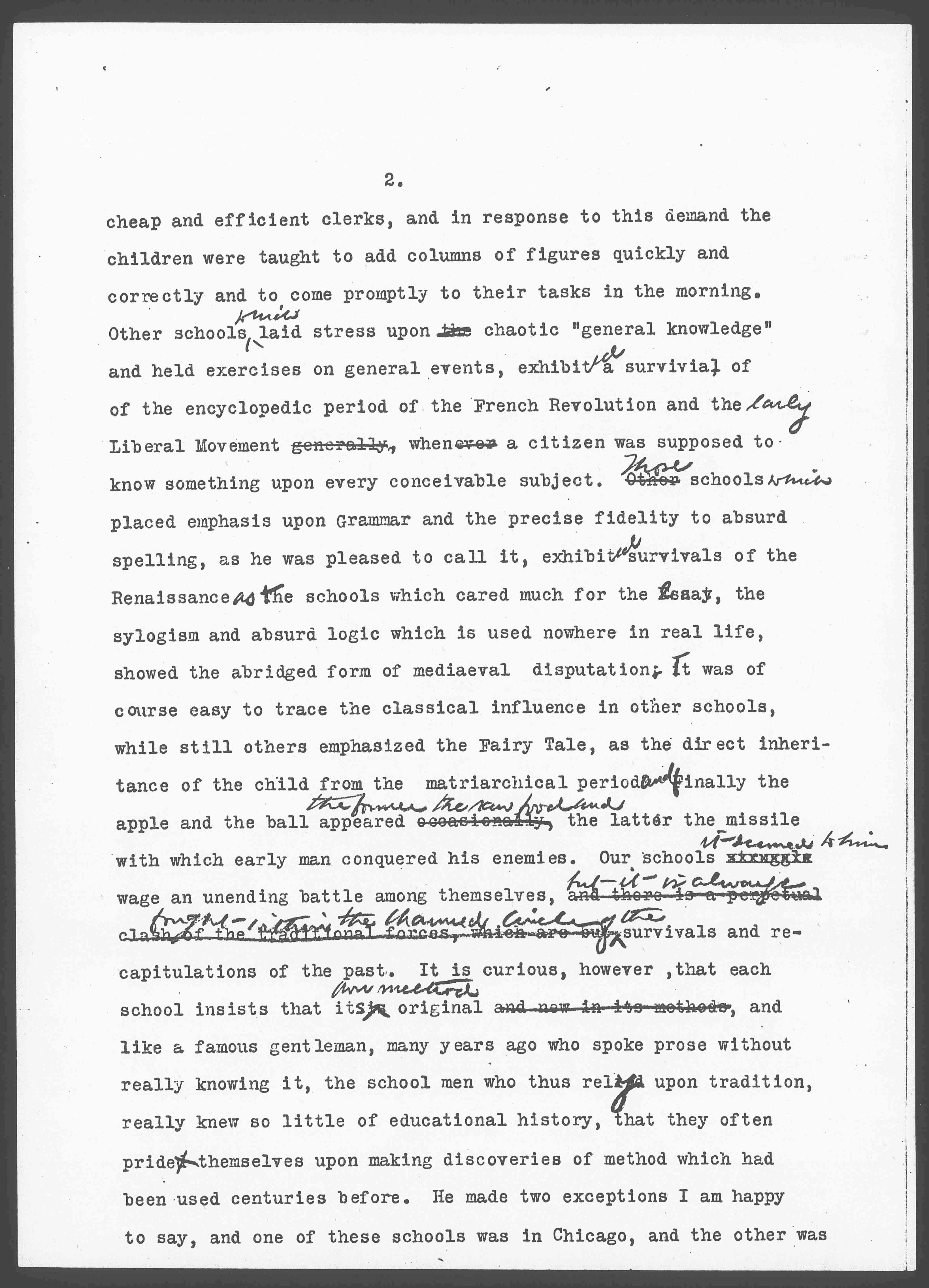 He insisted that this contention, that Americans were unwittingly bound by unknown traditions, could be demonstrated best ↑most readily↓ from their educational methods, and perhaps you will permit me to repeat his illustrations. He said that the ↑American↓ schools as he saw them emphasized first one and then another aspect of education, but they were always traditional aspects. Some schools placed the emphasis on the three hours ↑Rs↓, which was, of course, a result of ↑the recent↓ financial period, when merchants desired [page 2] cheap and efficient clerks, and in response to this demand the children were taught to add columns of figures quickly and correctly and to come promptly to their tasks in the morning. Other schools ↑which↓ laid stress upon the chaotic "general knowledge" and held exercises on general events, exhibited a survival of the encyclopedic period of the French Revolution and the ↑early↓ Liberal Movement generally, when a citizen was supposed to know something about every conceivable subject. Other ↑Those↓ schools ↑which↓ placed emphasis upon Grammar and the precise fidelity to absurd spelling, as he was pleased to call it, exhibited survivals of the Renaissance ↑as↓ the schools which cared much for the essay, the [syllogism] and absurd logic which is used nowhere in real life, showed the abridged form of [medieval] disputation. It was of course easy to trace the classical influence in other schools, while still others emphasized the Fairy Tale, as the direct inheritance of the child from the matriarchal period ↑and↓ finally the apple and the ball appeared occasionally ↑the former the new food and↓ the latter the missile with which early man conquered his enemies. Our schools struggle ↑it seemed to him↓ wage an unending battle among themselves, and there is a perpetual clash of the traditional forces, which are but ↑but it is always fought within the charmed circle of the↓ survivals and recapitulations of the past. It is curious, however, that each school insists that its is ↑own method↓ original and new in its methods, and like a famous gentleman, many years ago who spoke prose without really knowing it, the school men who thus rely upon tradition, really knew so little of educational history, that they often pride themselves on making discoveries of method which had been used centuries before. He made two exceptions I am happy to say, and one of these schools was in Chicago, and the other was [page 3] in New York. He said that throughout the country in only these two schools did he find educators facing the situation which actually existed. Only in these two places were they organizing the child's activities with some reference to the life which he would later lead, and attempting to give him some [clue] as to what to select and what to eliminate when he should come into contact with contemporary social and industrial conditions. [page 4]
