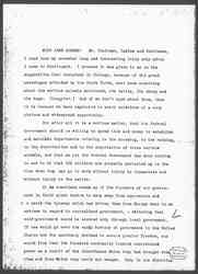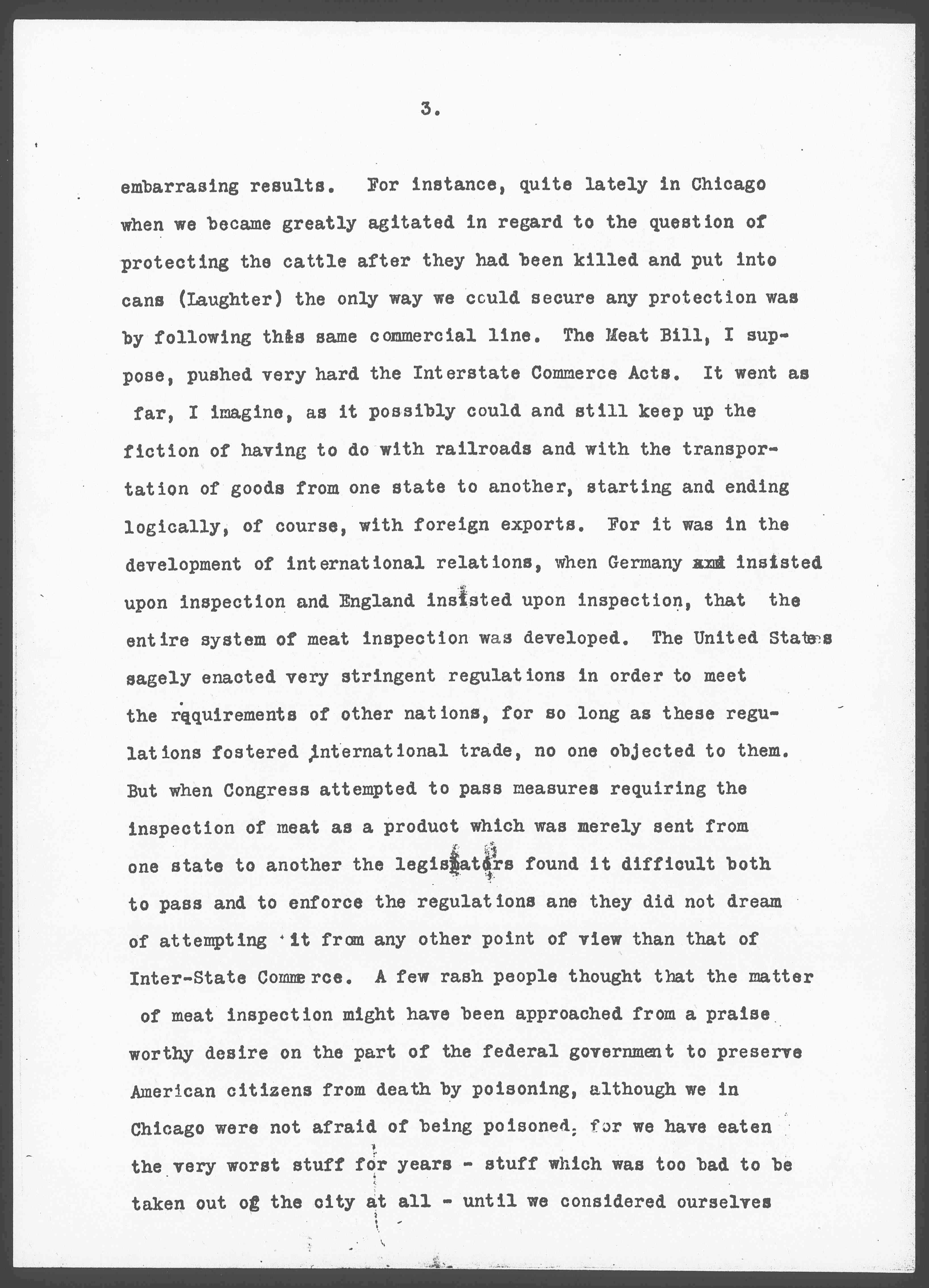 It seemed at last quite natural that hours and hours of discussion in the Congress of the United States should be expended upon commercial questions because they had to do with the relations of the United States to the world outside. It seemed quite right that millions of dollars should be spent that the best sort of grain might be raised and carried to the sea-ports: that elaborate experiment stations should be established upon the seashore that fish might be produced and protected. And during this development at any moment -- I was going to say at the drop of a hat -- the national government was ready to go to war in order to protect the seal or the fisheries interests. In the same spirit animal industries were protected and developed because cattle of the west were a valuable national asset, soldiers were stationed throughout the territories that the ranchmen might be secure in their efforts to enlarge this great industry, which was national in character and which determined in a very large measure our commercial relations to European nations. It was logical <perhaps> that the power of the federal government should develop so exclusively along commercial lines, if one may generalize from this very superficial survey and that any tendency on the part of centralized government, to develop in other directions should be resented by liberty-loving people. This development along one exclusive line has, however, brought some [page 3] [embarrassing] results. For instance, quite lately in Chicago when we became greatly agitated in regard to the question of protecting the cattle after they had been killed and put into cans (Laughter) the only way we could secure any protection was by following this same commercial line. The Meat Bill, I suppose, pushed very hard the Interstate Commerce Acts. It went as far, I imagine, as it possibly could and still keep up the fiction of having to do with railroads and with the transportation of goods from one state to another, starting and ending logically, of course, with foreign exports. For it was in the development of international relations, when Germany [illegible] insisted upon inspection and England insisted upon inspection, that the entire system of meat inspection was developed. The United States sagely enacted very stringent regulations in order to meet the requirements of other nations, for so long as these regulations fostered international trade, no one objected to them. But when Congress attempted to pass measures requiring the inspection of meat as a product which was merely sent from one state to another the legislators found it difficult both to pass and to enforce the regulations [and] they did not dream of attempting it from any other point of view than that of Inter-State Commerce. A few rash people thought that the matter of meat inspection might have been approached from a praise worthy desire on the part of the federal government to preserve American citizens from death by poisoning, although we in Chicago were not afraid of being poisoned, for we have eaten the very worst stuff for years -- stuff which was too bad to be taken out of the city at all -- until we considered ourselves [page 4] quite immune. (Laughter) Chicago citizens were glad to have this Meat Bill passed, however, because only through such a stretch of power of the Federal Government in its commercial relations could protection be afforded to the children, the women and the men who were working in the Stock Yards. It was possible to reach the producer only through the product, it was possible to regulate the product only because it entered into Inter-State Commerce. The Federal Government said, "O yes, we will go along the old path of regulating commerce and if, incidentally, we can protect the women and children, we will do it. If you ask us to protect them directly, we will certainly say no, for that interferes with state rights and we cannot possibly undertake such a thing." (Applause.)
