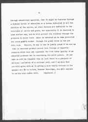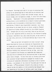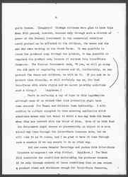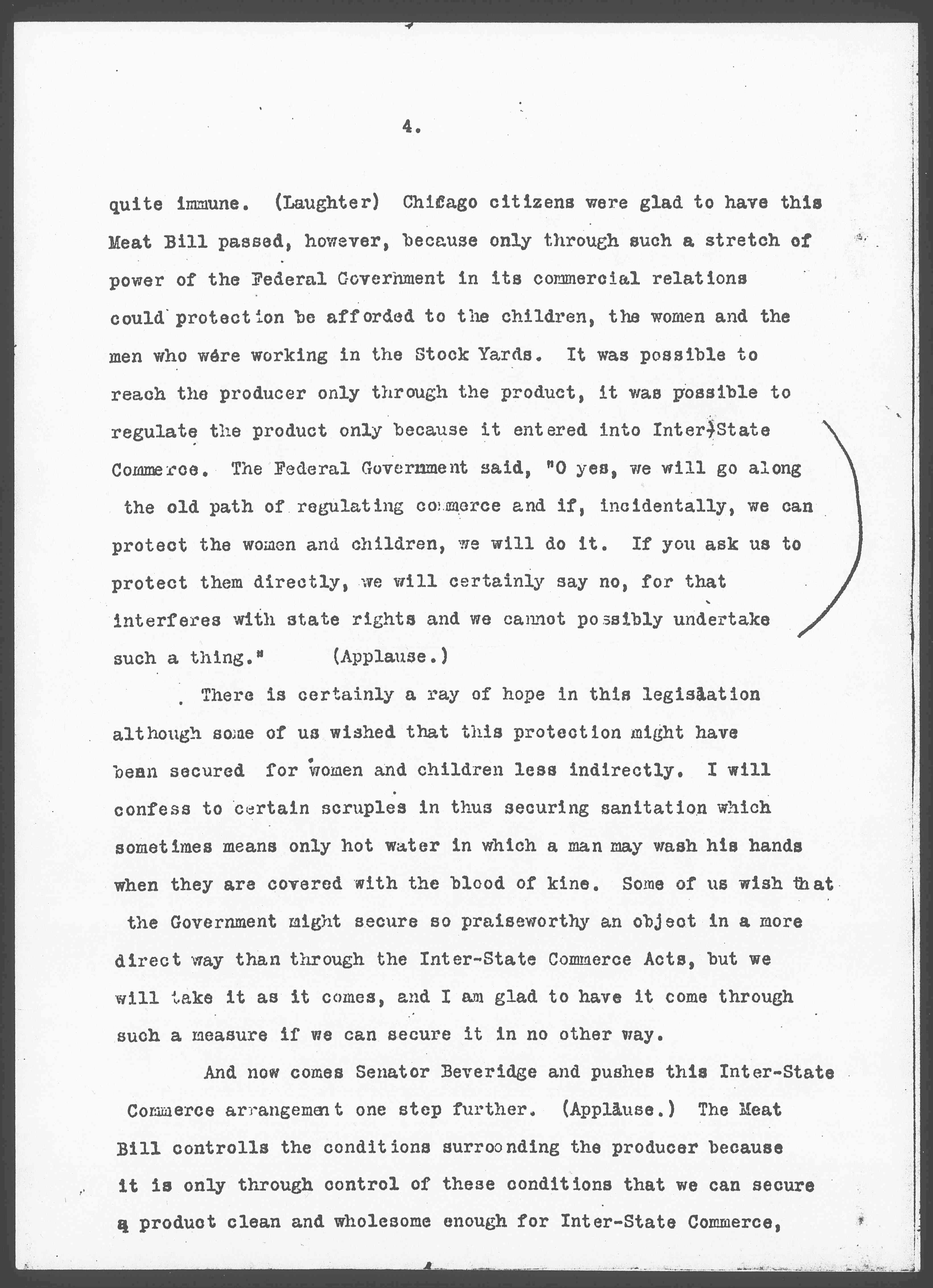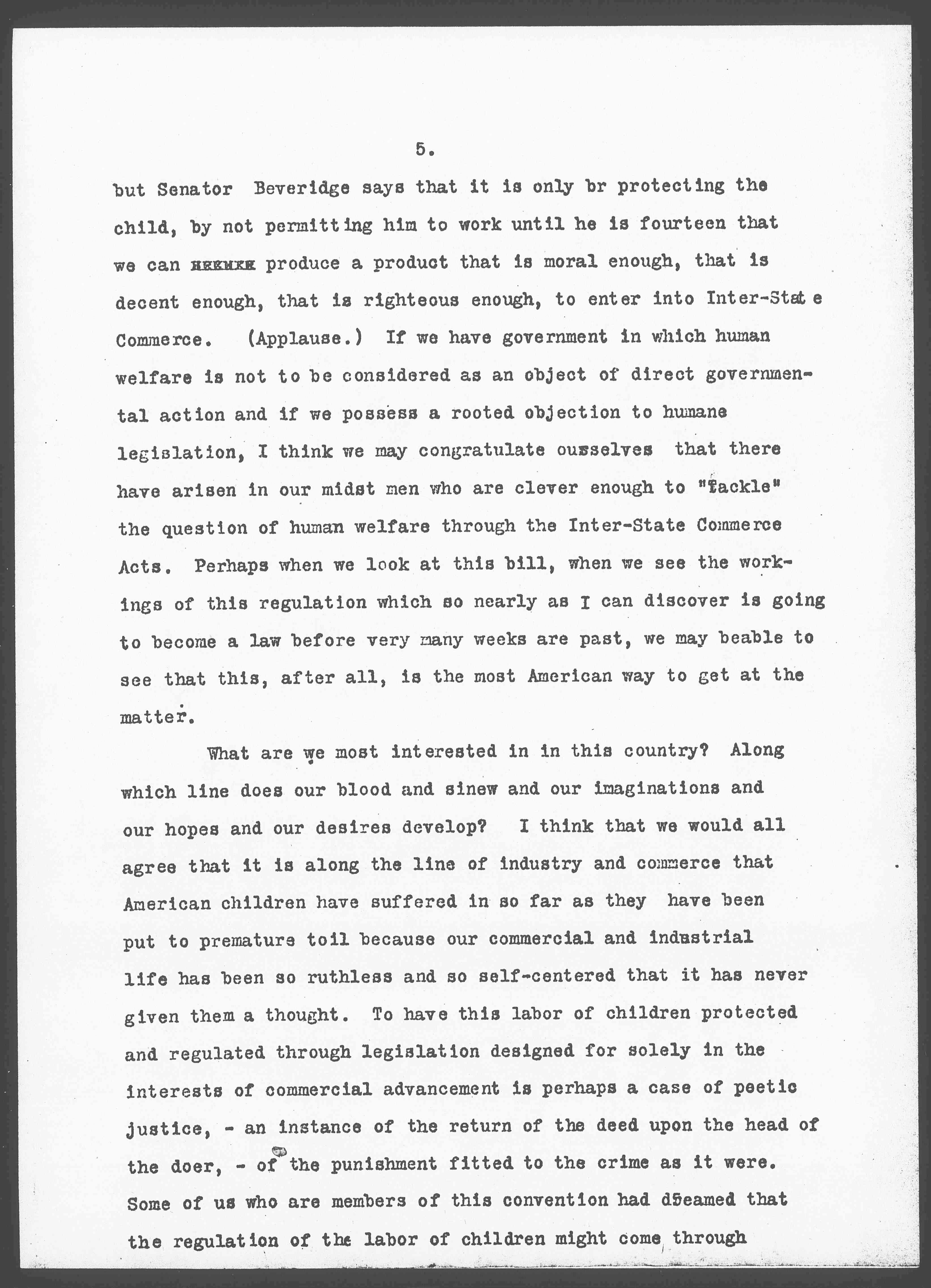 And now comes Senator Beveridge and pushes this Inter-State Commerce arrangement one step further. (Applause.) The Meat Bill [controls] the conditions [surrounding] the producer because it is only through control of these conditions that we can secure a product clean and wholesome enough for Inter-State Commerce, [page 5] but Senator Beveridge says that it is only [by] protecting the child, by not permitting him to work until he is fourteen that we can [illegible] produce a product that is moral enough, that is decent enough, that is righteous enough, to enter into Inter-State Commerce. (Applause.) If we have government in which human welfare is not to be considered as an object of direct governmental action and if we possess a rooted objection to humane legislation, I think we may congratulate ourselves that there have arisen in our midst men who are clever enough to "tackle" the question of human welfare through the Inter-State Commerce Acts. Perhaps when we look at this bill, when we see the workings of this regulation which so nearly as I can discover is going to become a law before very many weeks are past, we may be able to see that this, after all, is the most American way to get at the matter.