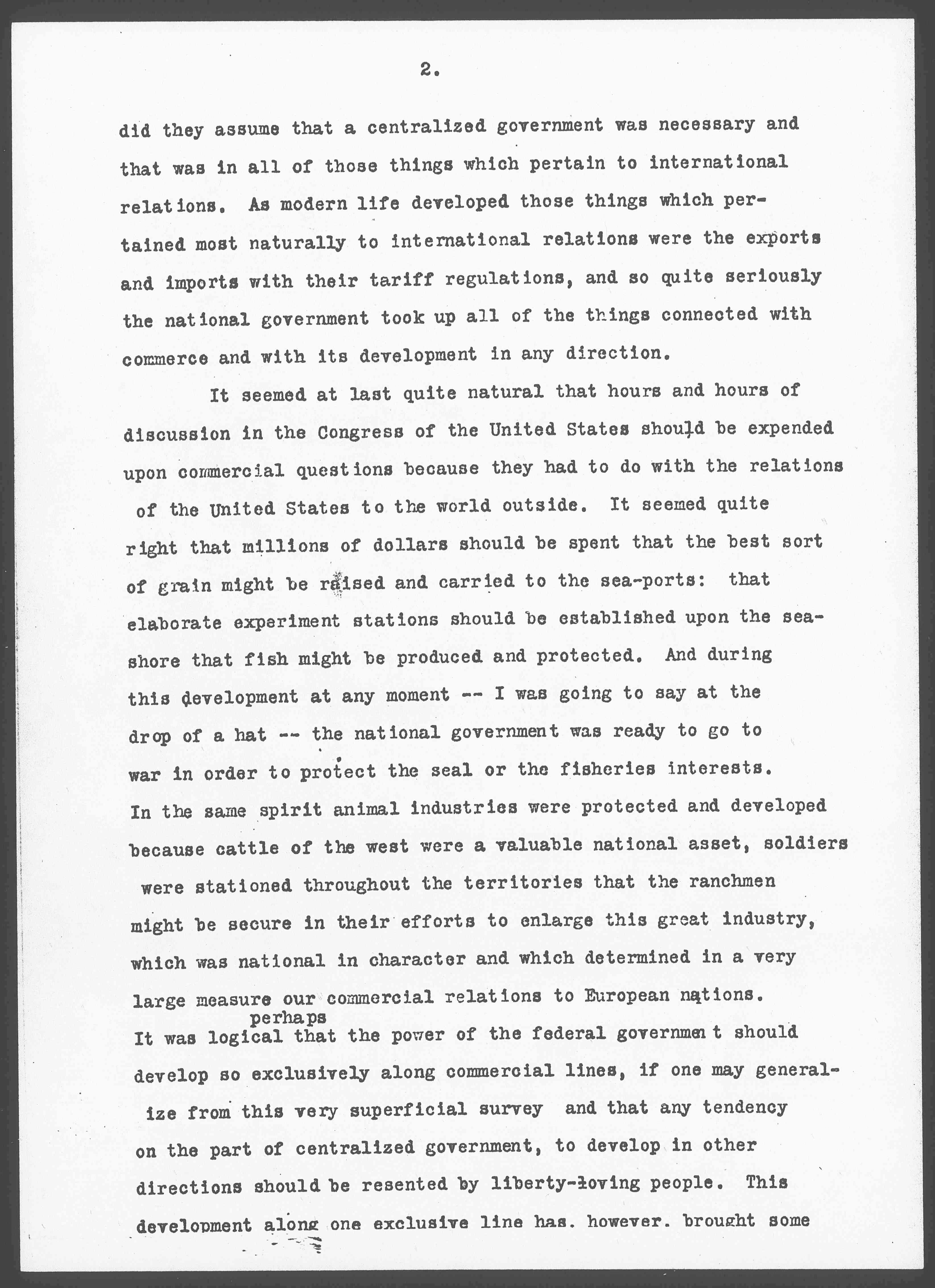 It is sometimes seems as if the founders of our government in their great desire to keep away from oppression and to avoid the tyranny which had driven them from Europe [went] to an extreme in regard to centralized government, -- believing that self-government could be secured only through local government. If one would go over the early history of government in the United States and the machinery devised to secure greater freedom, one would find that the founders constantly trusted centralized power as a result of the inheritance which they had brought with them and from which they could not escape. Only in one direction [page 2] did they assume that a centralized government was necessary and that was in all of those things which pertain to international relations. As modern life developed those things which pertained most naturally to international relations were the exports and imports with their tariff regulations, and so quite seriously the national government took up all of the things connected with commerce and with its development in any direction.