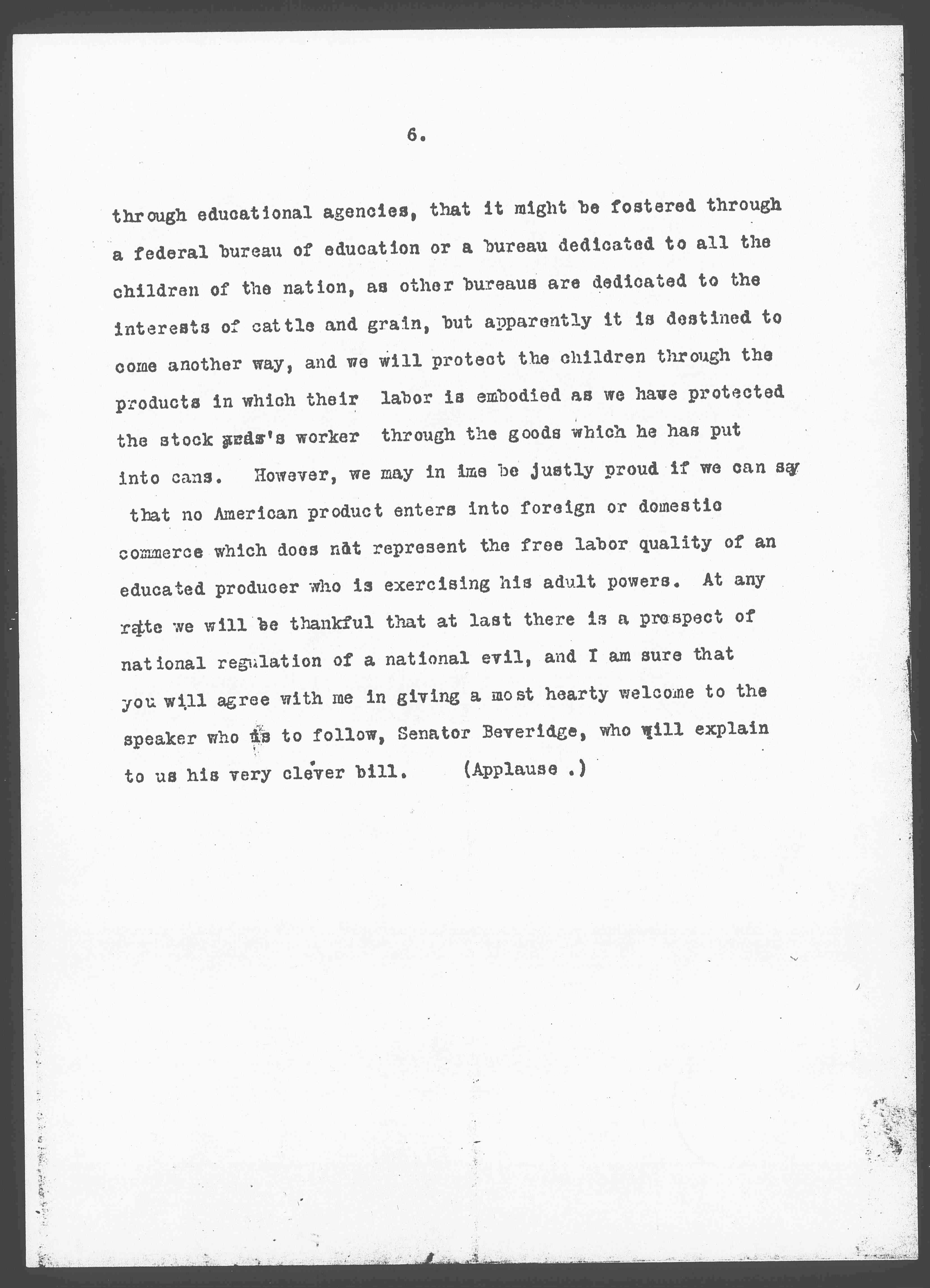 What are we most interested in in this country? Along which line does our blood and sinew and our imaginations and our hopes and our desires develop? I think that we would all agree that it is along the line of industry and commerce that American children have suffered in so far as they have been put to premature toil because our commercial and industrial life has been so ruthless and so self-centered that it has never given them a thought. To have this labor of children protected and regulated through legislation designed for solely in the interests of commercial advancement is perhaps a case of poetic justice, -- an instance of the return of the deed upon the head of the doer, -- of the punishment fitted to the crime as it were. Some of us who are members of this convention had dreamed that the regulation of the labor of children might come through [page 6] through educational agencies, that it might be fostered through a federal bureau of education or a bureau dedicated to all the children of the nation, as other bureaus are dedicated to the interests of cattle and grain, but apparently it is destined to come another way, and we will protect the children through the products in which their labor is embodied as we have protected the stock yard's worker through the goods which he has put into cans. However, we may in [time] be justly proud if we can say that no American product enters into foreign or domestic commerce which does not represent the free labor quality of an educated producer who is exercising his adult powers. At any rate we will be thankful that at last there is a prospect of national regulation of a national evil, and I am sure that you will agree with me in giving a most hearty welcome to the speaker who is to follow, Senator Beveridge, who will explain to us his very clever bill. (Applause.)