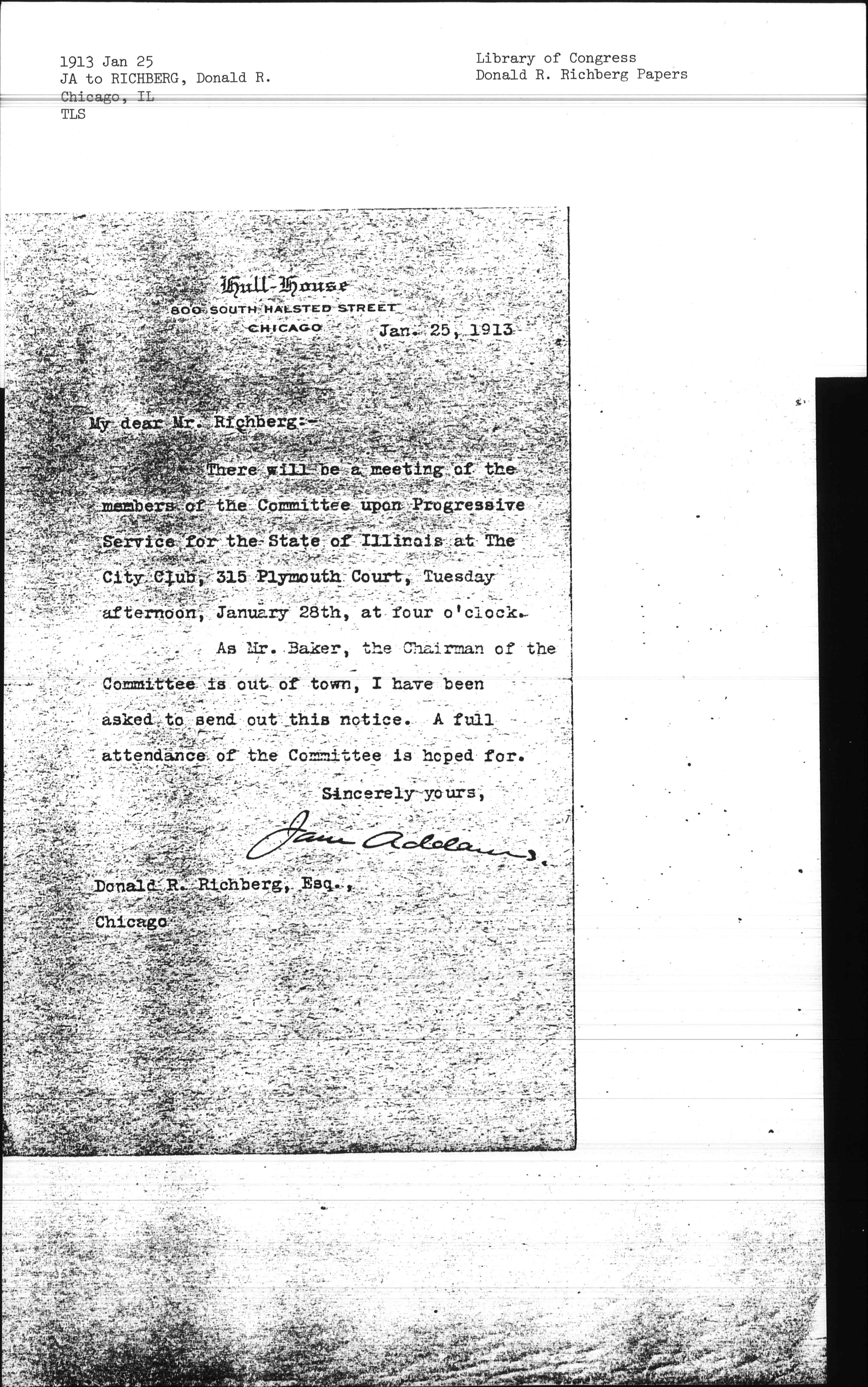 There will be a meeting of the members of the Committee upon Progressive Service for the State of Illinois at The City Club, 315 Plymouth Court, Tuesday afternoon, January 28th, at four o'clock.