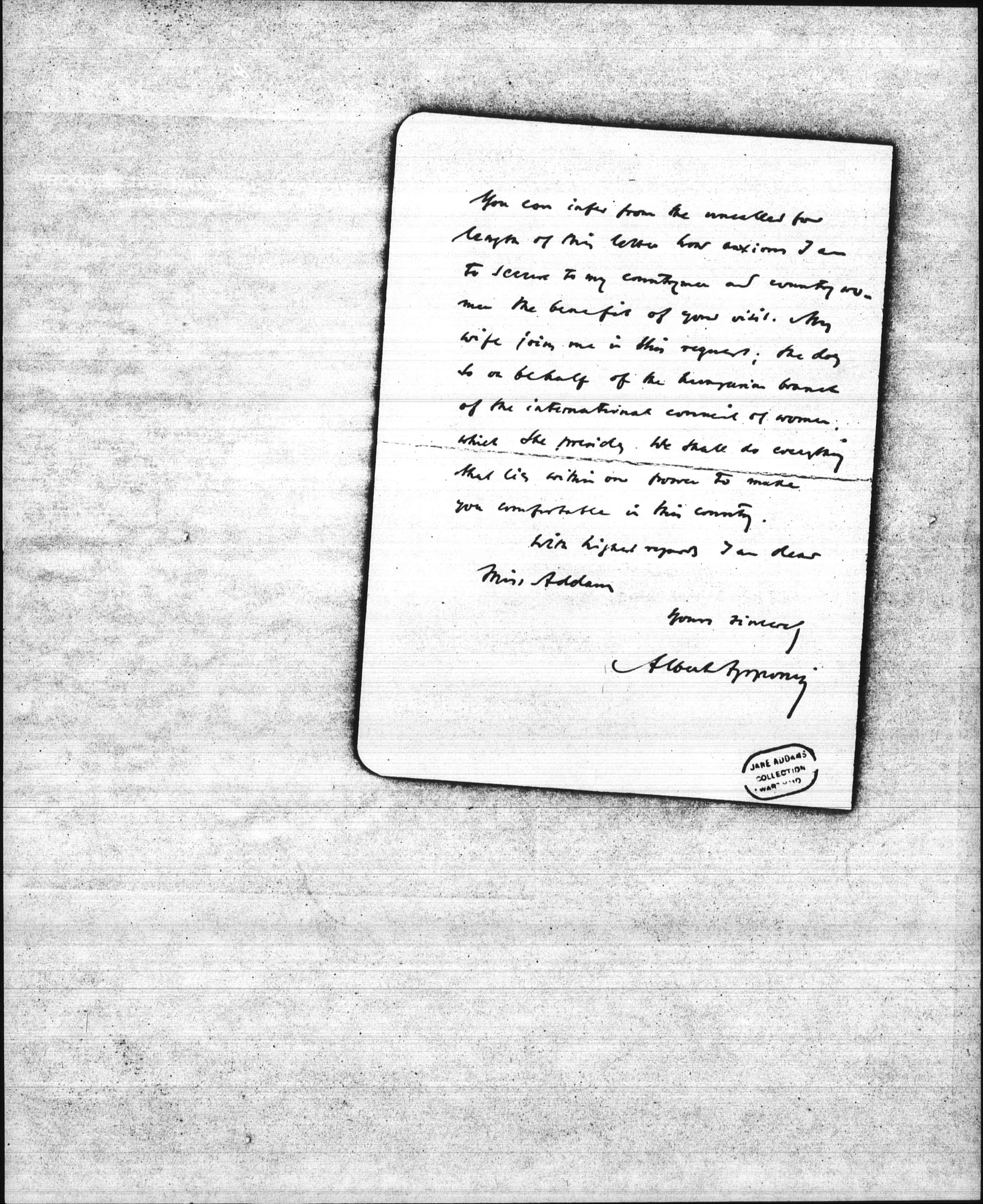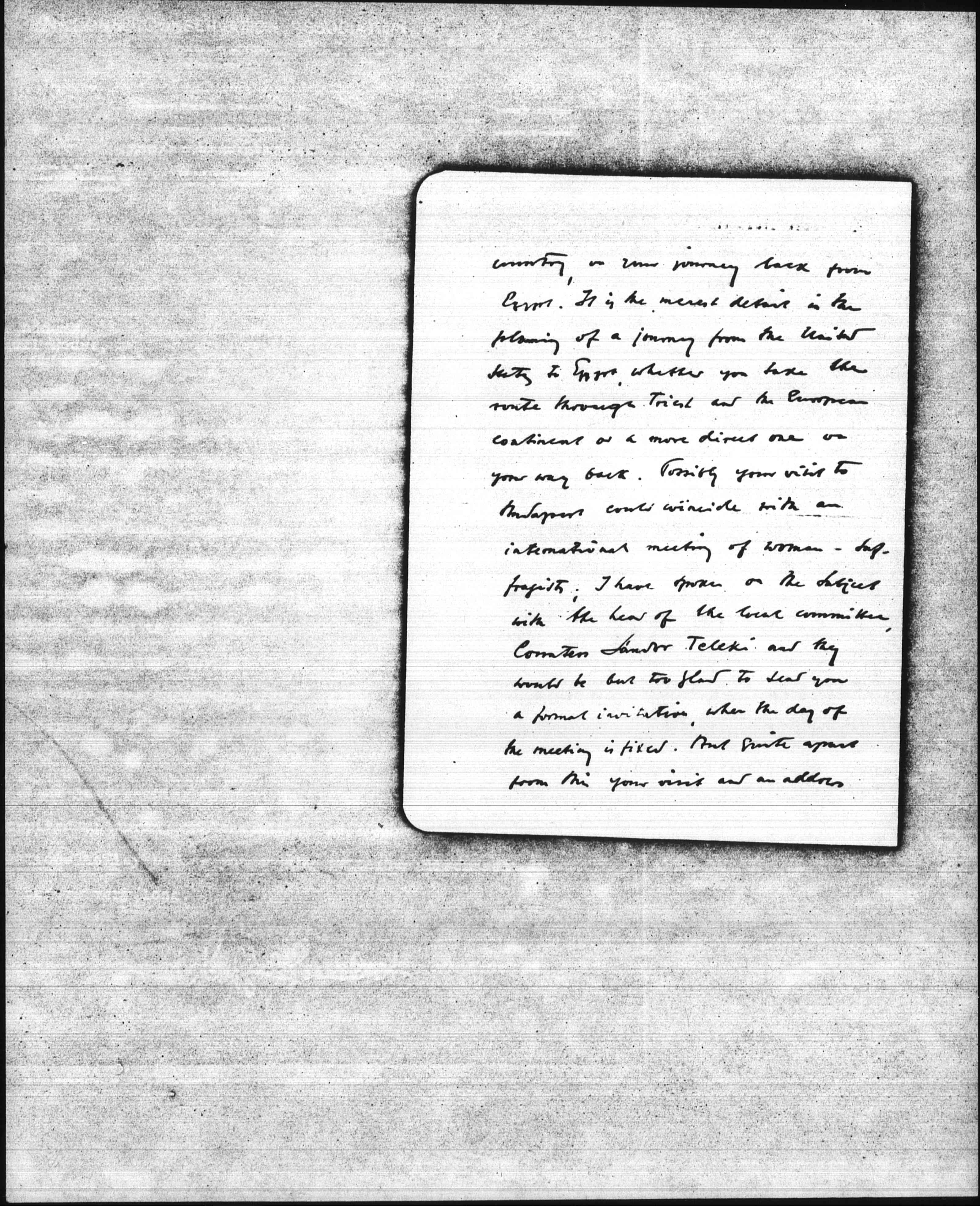 Dear Miss Addams,I really don't know whether my very superficial meeting with you, at Chicago two years ago, gives me any right to send you an invitation. It has been superficial, because at that time I was not so well acquainted with your work as I have become through reading some of your writings. Had I known it, I should certainly devoted part of the time I could spend in America to see more of it. But whatever be my own title, or want of title, I am the spokesman of many good men and women, and of great moral interests, when asking you to visit my [page 2] country, on your journey back from Egypt. It is the merest detail in the planning of a journey from the United States to Egypt, whether you take the route through [Trieste] and the European continent or a more direct one on your way back. Possibly your visit to Budapest could coincide with an international meeting of women -- Suffragists. I have spoken on the subject with the head of the local committee, Comtess Sándor Teleki and they would be but too glad to send you a formal invitation, when the day of the meeting is fixed. But quite apart from this your visit and an address [page 3] delivered by you, would infuse new life into every kind of social work, for which there is more good will than practical ability and continuing perserverance in this country. I think you could revolutionize our well-meaning ladies by words behind which stand facts and examples of self-denial. It is not my call, it is the call of good work to be done, that I ask you to follow.