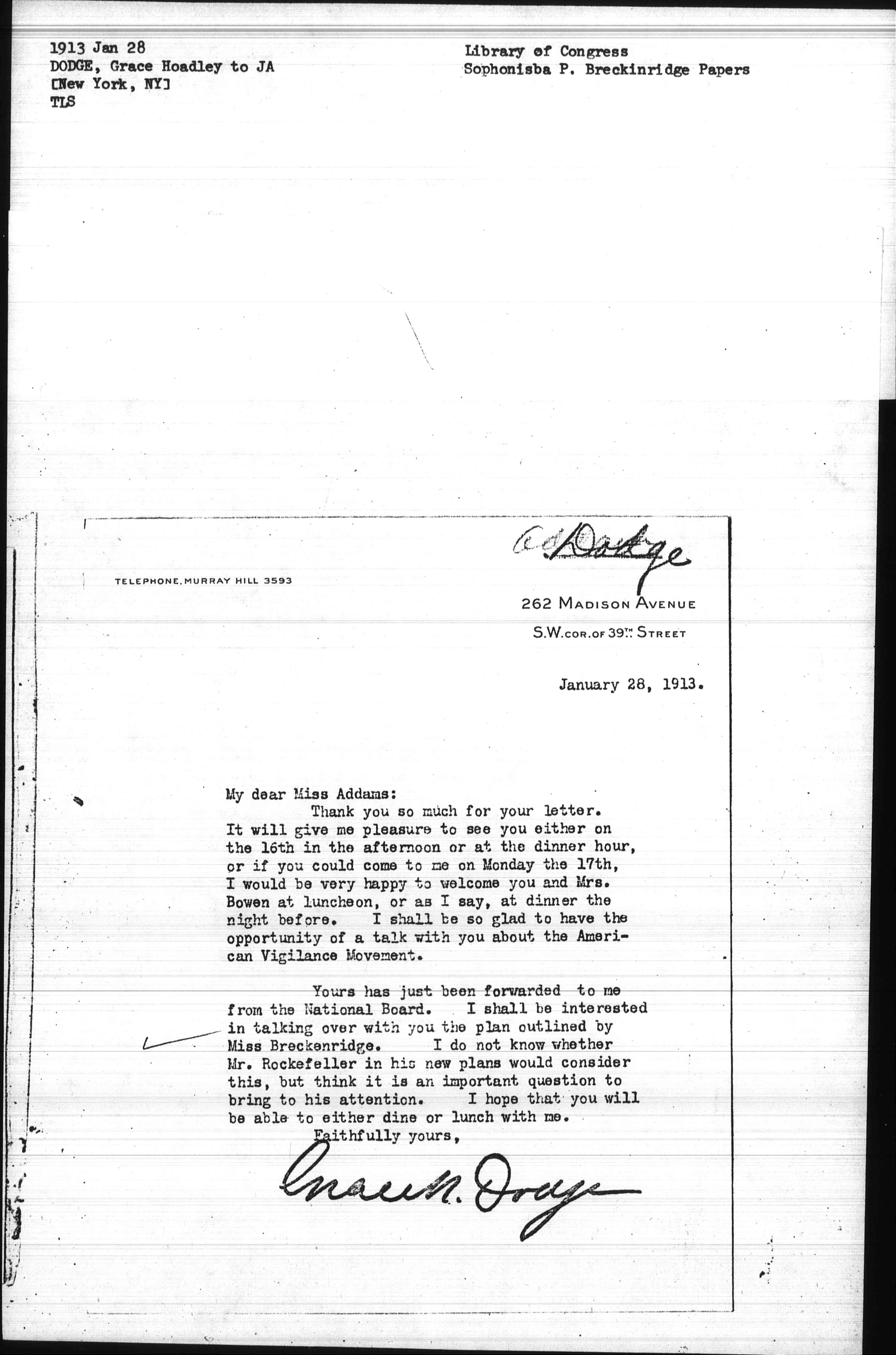 Yours has just been forwarded to me from the National Board. I shall be interested in talking over with you the plan outlined by Miss [Breckinridge]. I do not know whether Mr. Rockefeller in his new plans would consider this, but think it is an important question to bring to his attention. I hope that you will be able to either dine or lunch with me.