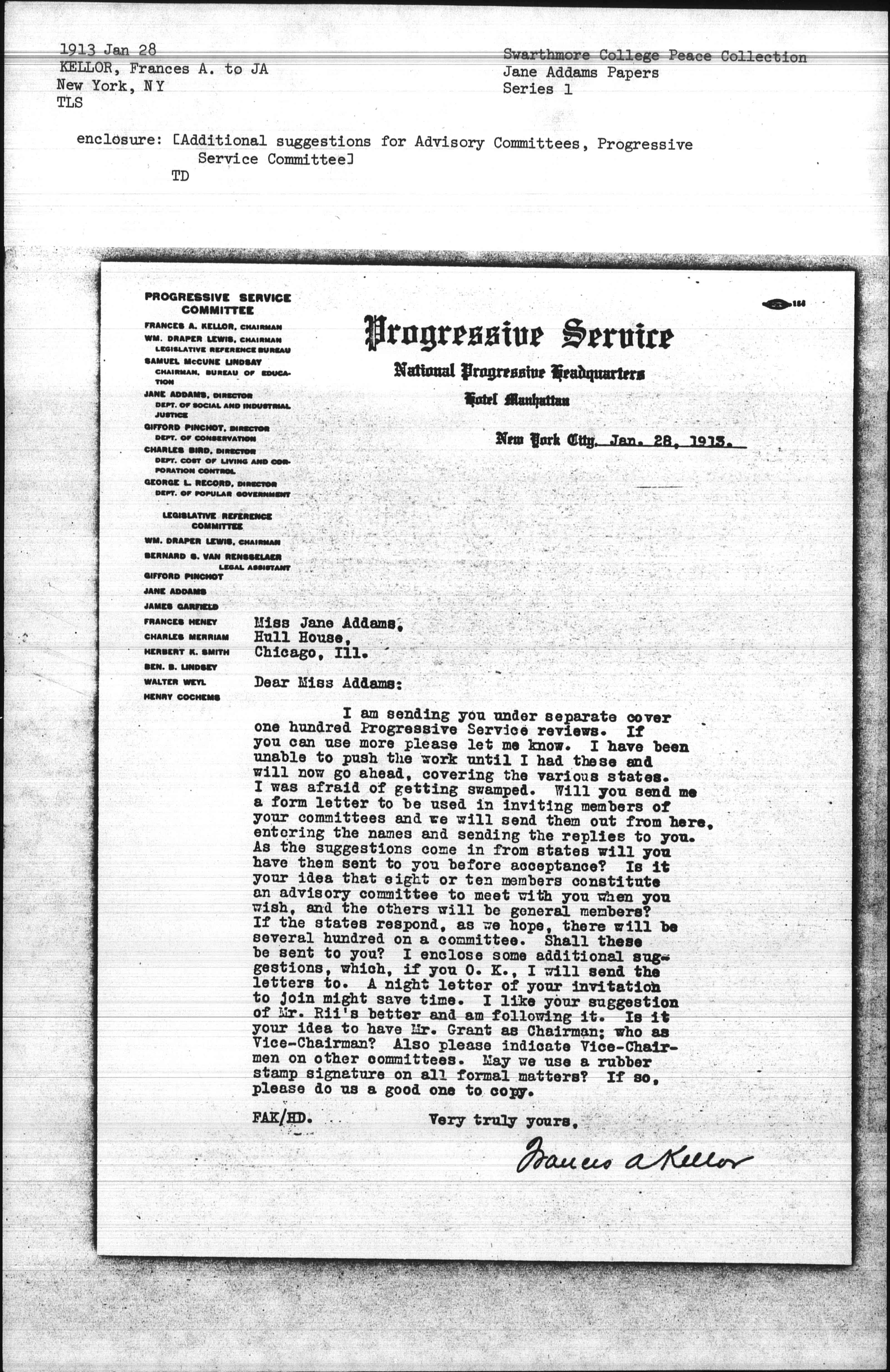 I am sending you under separate cover one hundred Progressive Service reviews. If you can use more please let me know. I have been unable to push the work until I had these and will now go ahead, covering the various states. I was afraid of getting swamped. Will you send me a form letter to be used in inviting members of your committees and we will send them out from here, entering the names and sending the replies to you. As the suggestions come in from states will you have them sent to you before acceptance? Is it your idea that eight or ten members constitute an advisory committee to meet with you when you wish, and the others will be general members? If the states respond, as we hope, there will be several hundred on a committee. Shall these be sent to you? I enclose some additional suggestions, which, if you O.K., I will send the letters to. A night letter of your invitation to join might save time. I like your suggestion of Mr. [Riis] better and am following it. Is it your idea to have Mr. Grant as Chairman; who as Vice-Chairman? Also please indicate Vice-Chairmen on other committees. May we use a rubber stamp signature on all formal matters? If so, please do us a good one to copy.