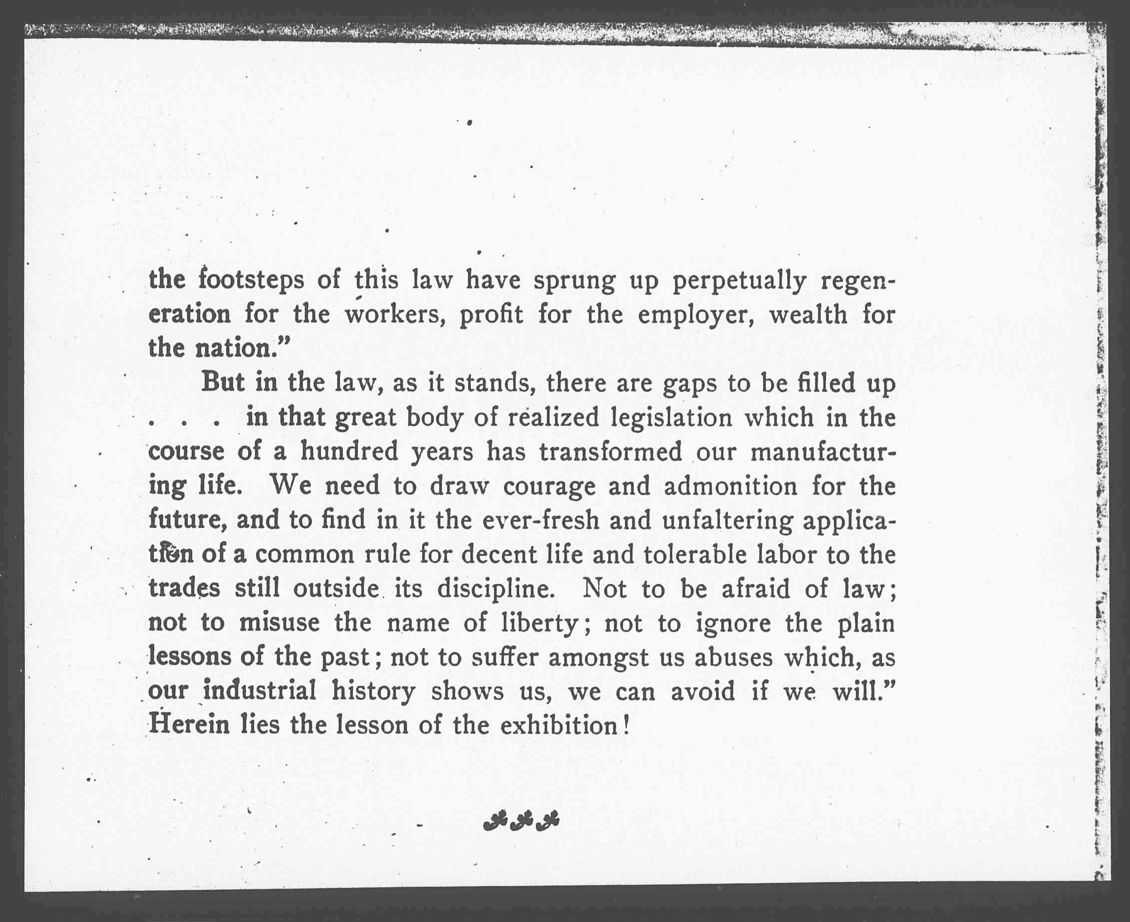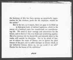 "But in the law, as it stands, there are gaps to be filled up...in that great body of realized legislation which in the course of a hundred years has transformed our manufacturing life. We need to draw courage and admonition for the future, and to find in it the ever-fresh and unfaltering application of a common rule for decent life and tolerable labor to the trades still outside its discipline. Not to be afraid of law; not to misuse the name of liberty; not to ignore the plain lessons of the past; not to suffer amongst us abuses which, as our industrial history shows us, we can avoid if we will." Herein lies the lesson of the exhibition!