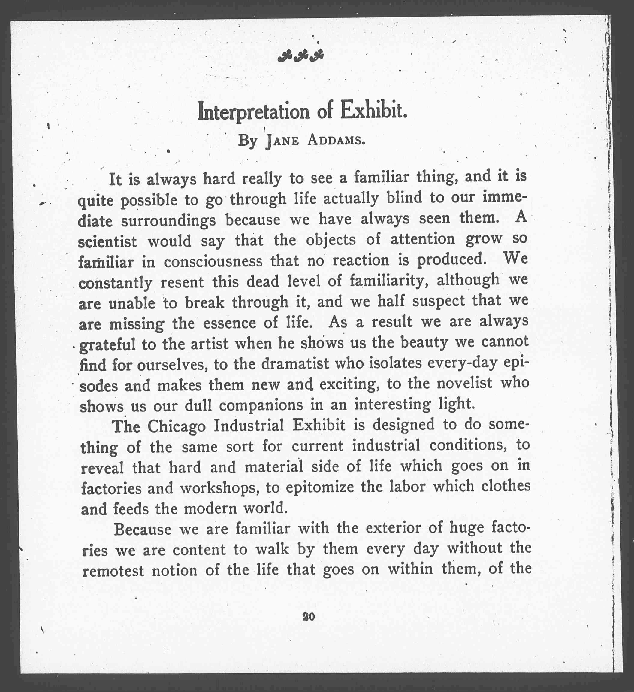 Because we are familiar with the exterior of huge factories we are content to walk by them every day without the remotest notion of the life that goes on within them, of the [page 2] complicated automatic machines which are the crown of a century of invention. We see streams of laborers filling the streets night and morning, and scarcely observe that in this stream the number of young women steadily increases and that the number of children fluctuates. Our lack of perception blurs it all. We buy the products as we may desire them, totally unconscious of the struggles of the inventor, of the dreams of the artist which the products may embody, and only a few purchasers inquire whether cheapness has been secured through an increase of speed which has put an unwarranted strain upon the nervous system of the young girls, or whether the worker has contracted disease which might have been avoided.