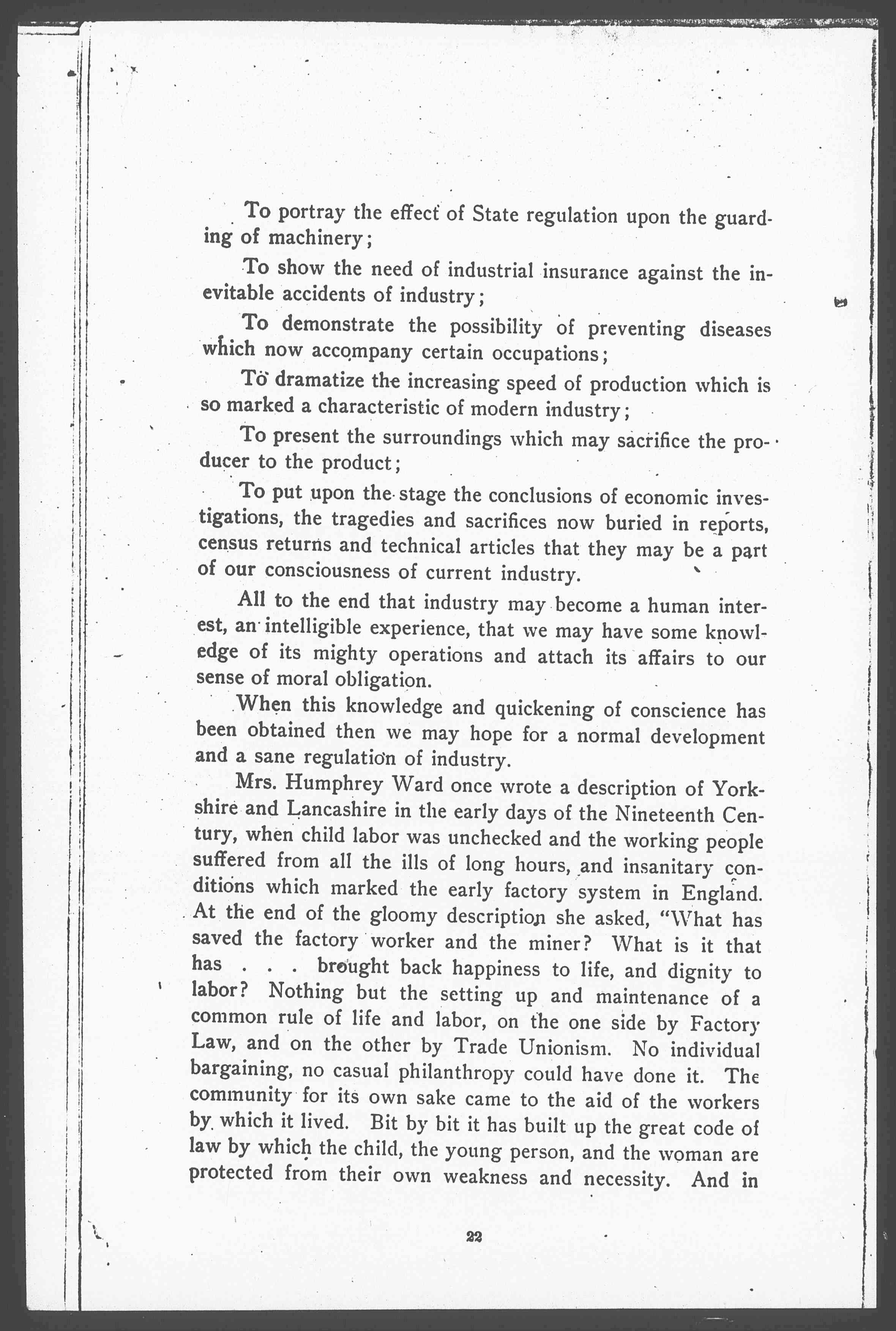 Mrs. Humphrey Ward once wrote a description of Yorkshire and Lancashire in the early days of the Nineteenth Century, when child labor was unchecked and the working people suffered from all the ills of long hours, and insanitary conditions which marked the early factory system in England. At the end of the gloomy description she asked, "What has saved the factory worker and the miner? What is it that has...brought back happiness to life, and dignity to labor? Nothing but the setting up and maintenance of a common rule of life and labor, on the one side by Factory Law, and on the other by Trade Unionism. No individual bargaining, no casual philanthropy could have done it. The community for its own sake came to the aid of the workers by which it lived. Bit by bit it has built up the great code of law by which the child, the young person, and the woman are protected from their own weakness and necessity. And in [page 4] the footsteps of this law have sprung up perpetually regeneration for the workers, profit for the employer, wealth for the nation."