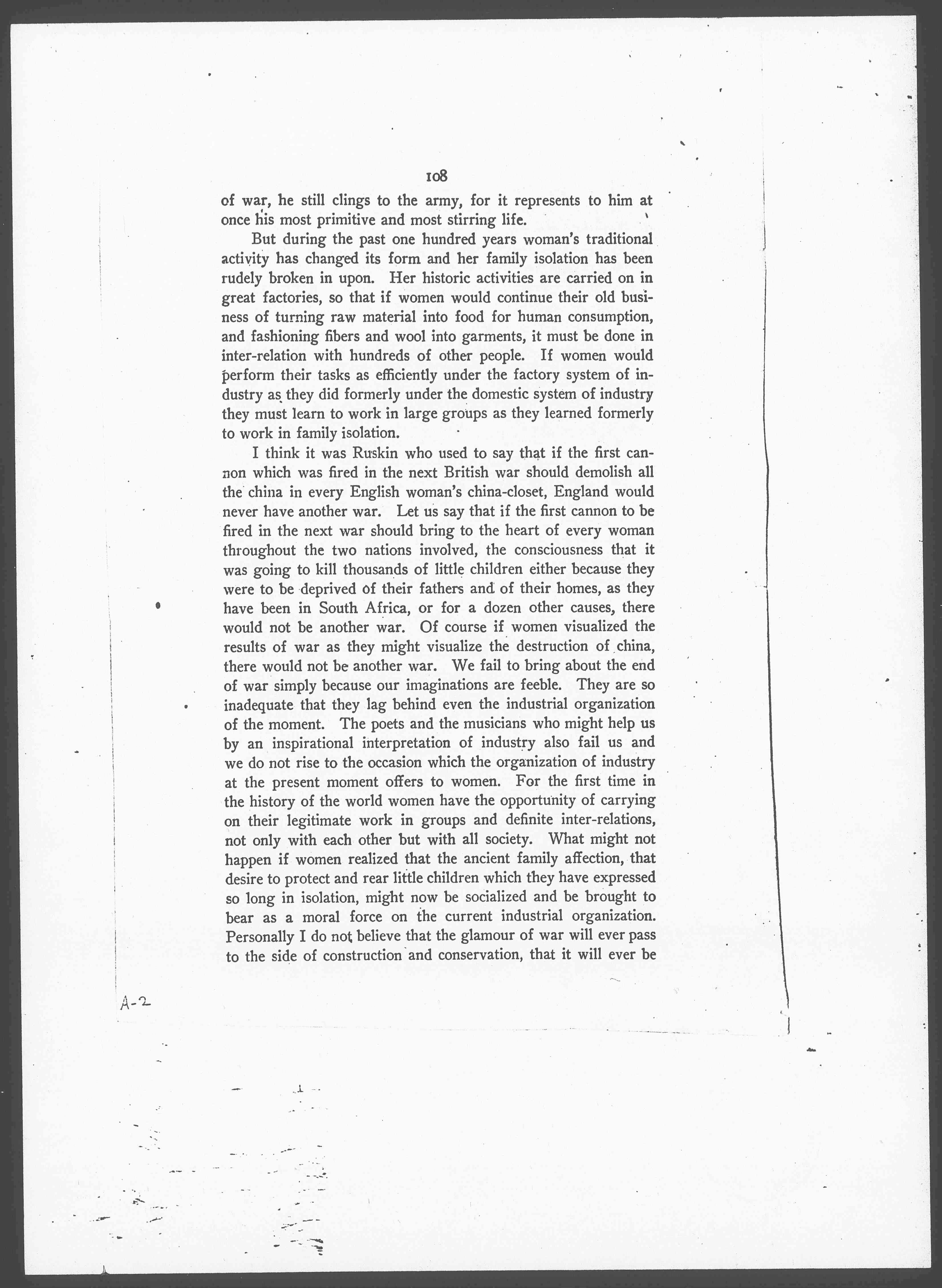 I think it was Ruskin who used to say that if the first cannon which was fired in the next British war should demolish all the china in every English woman's china-closet, England would never have another war. Let us say that if the first cannon to be fired in the next war should bring to the heart of every woman throughout the two nations involved, the consciousness that it was going to kill thousands of little children either because they were to be deprived of their fathers and of their homes, as they have been in South Africa, or for a dozen other causes, there would not be another war. Of course if women visualized the results of war as they might visualize the destruction of china, there would not be another war. We fail to bring about the end of war simply because our imaginations are feeble. They are so inadequate that they lag behind even the industrial organization of the moment. The poets and the musicians who might help us by an inspirational interpretation of industry also fail us and we do not rise to the occasion which the organization of industry at the present moment offers to women. For the first time in the history of the world women have the opportunity of carrying on their legitimate work in groups and definite inter-relations, not only with each other but with all society. What might not happen if women realized that the ancient family affection, that desire to protect and rear little children which they have expressed so long in isolation, might now be socialized and be brought to bear as a moral force on the current industrial organization. Personally I do not believe that the glamour of war will ever pass to the side of construction and conservation, that it will ever be [page 4] possible to make industry seem as heroic as war has seemed unless we can do something of this sort. Why do we not do it? Do the habits of isolation still cling to women? Do women fail to move forward together because they have lacked the training and comradeship and forward march that the army has afforded to men, or because they have failed to consider these deeper things of life in their social aspects? It may be that they are still content as they have always been, to look at life from the purely domestic point of view and when industry has changed from the domestic system to the factory system that they are morally totally unprepared to make the corresponding social advance.