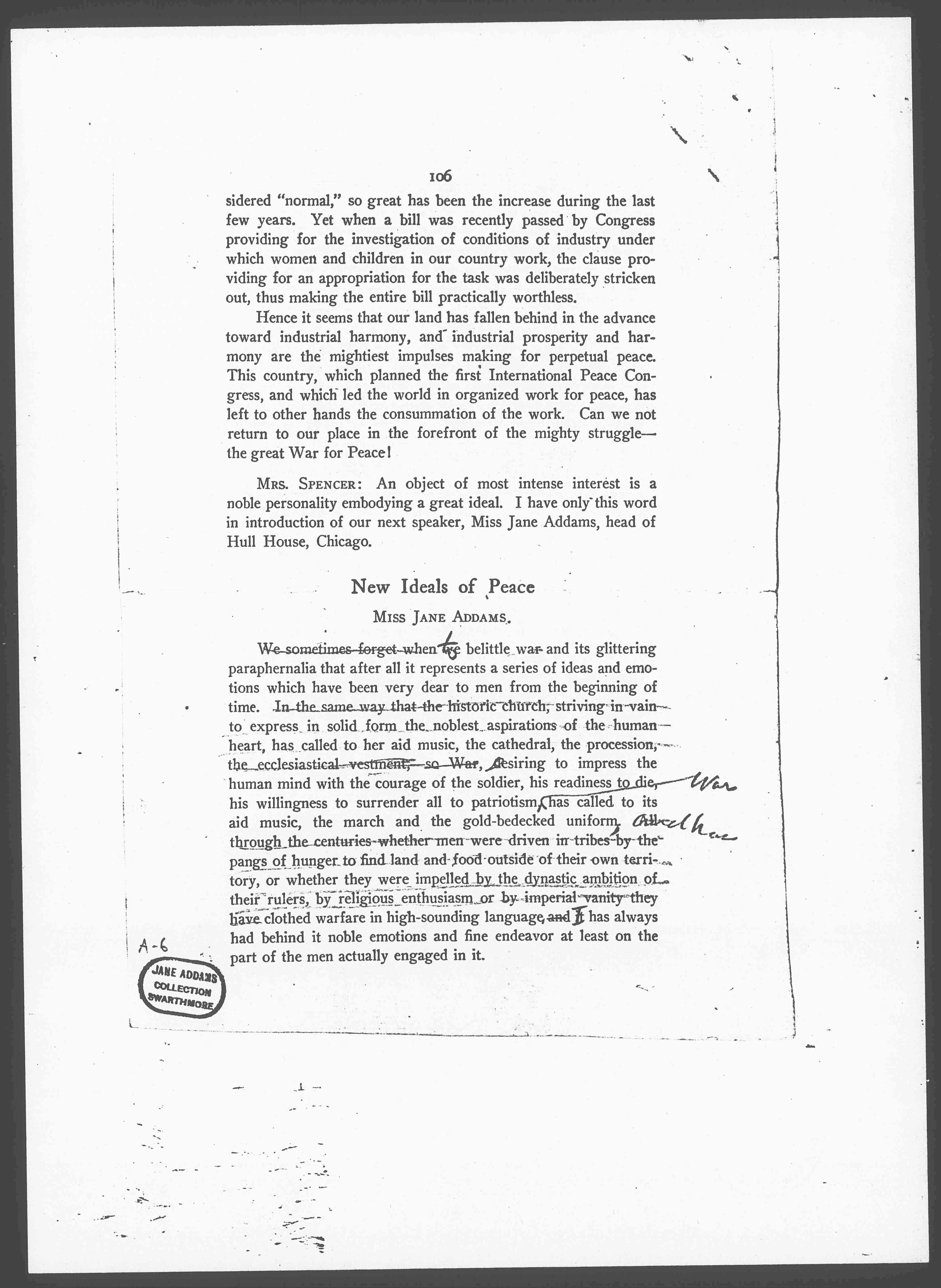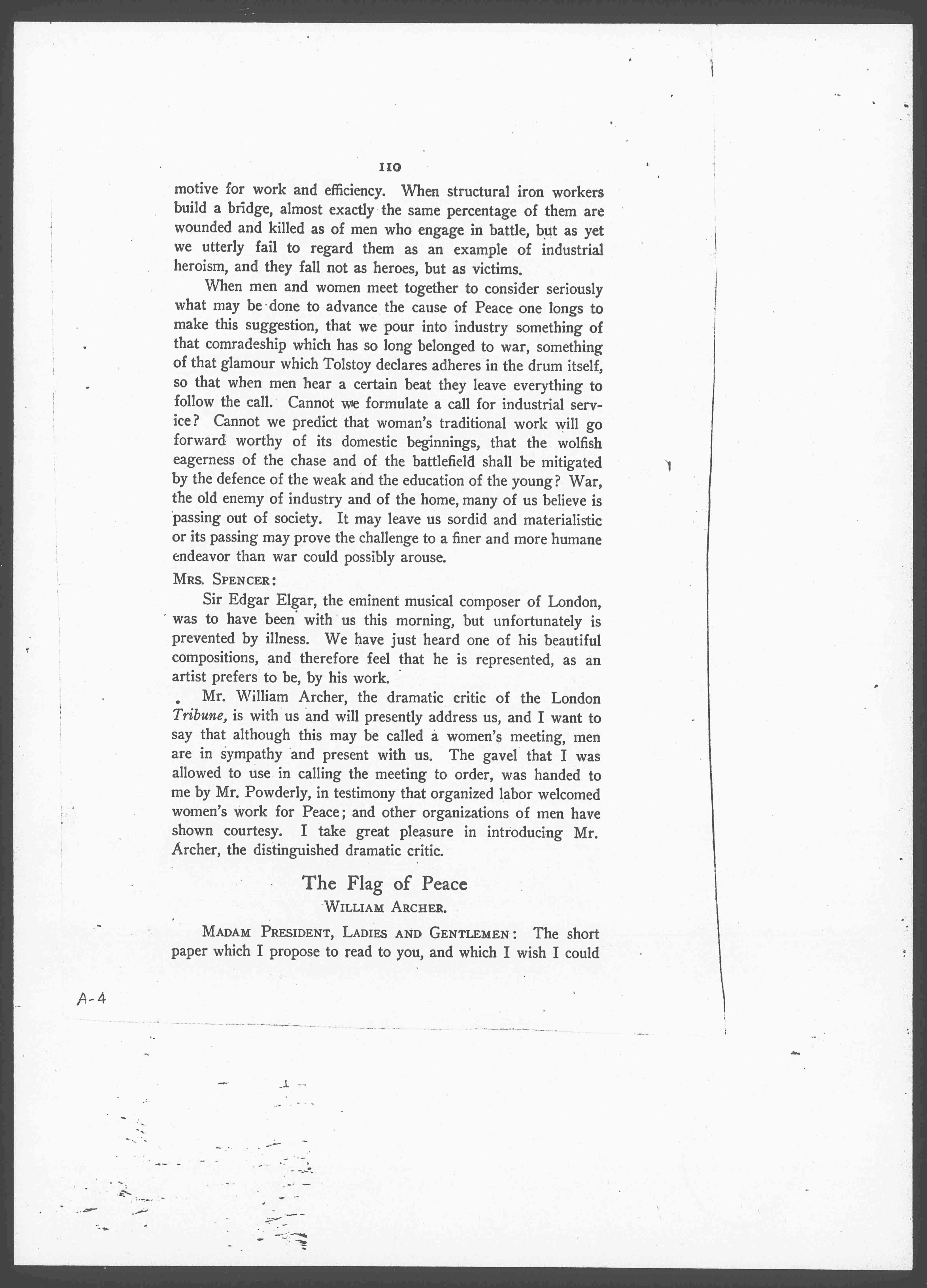 When men and women meet together to consider seriously what may be done to advance the cause of Peace one longs to make this suggestion, that we pour into industry something of that comradeship which has so long belonged to war, something of that glamour which Tolstoy declares adheres in the drum itself, so that when men hear a certain beat they leave everything to follow the call. Cannot we formulate a call for industrial service? Cannot we predict that woman's traditional work will go forward worthy of its domestic beginnings, that the wolfish eagerness of the chase and of the battlefield shall be mitigated by the [defense] of the weak and the education of the young? War, the old enemy of industry and of the home, many of us believe is passing out of society. It may leave us sordid and materialistic or its passing may prove the challenge to a finer and more humane endeavor than war could possibly arouse.