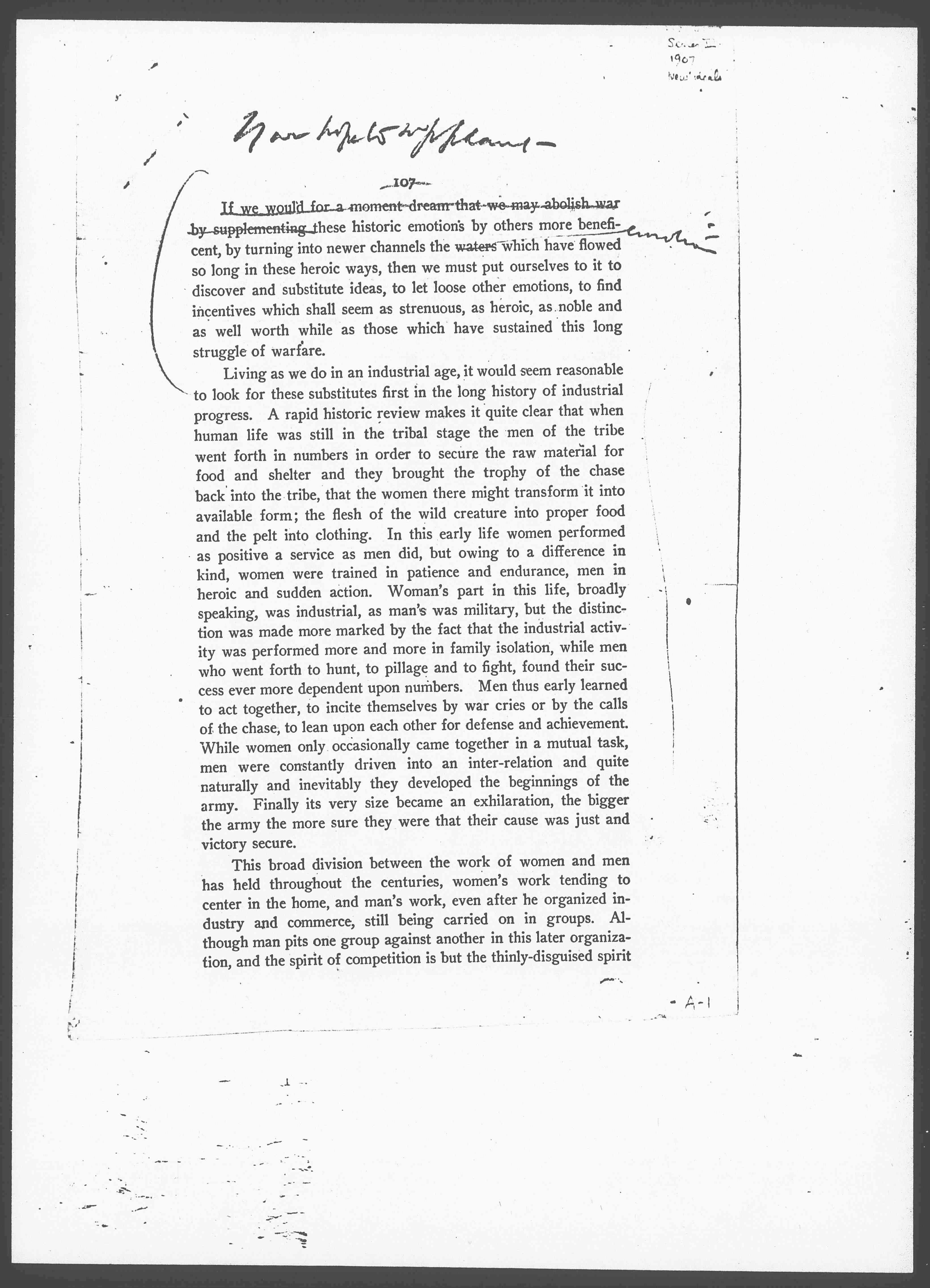 If we would for a moment dream that we may abolish war by supplementing ↑If we hope to supplant↓ these historic emotions by others more beneficent, by turning into newer channels the waters ↑emotions↓ which have flowed so long in these heroic ways, then we must put ourselves to it to discover and substitute ideas, to let loose other emotions, to find incentives which shall seem as strenuous, as heroic, as noble and as well worth while as those which have sustained this long struggle of warfare.