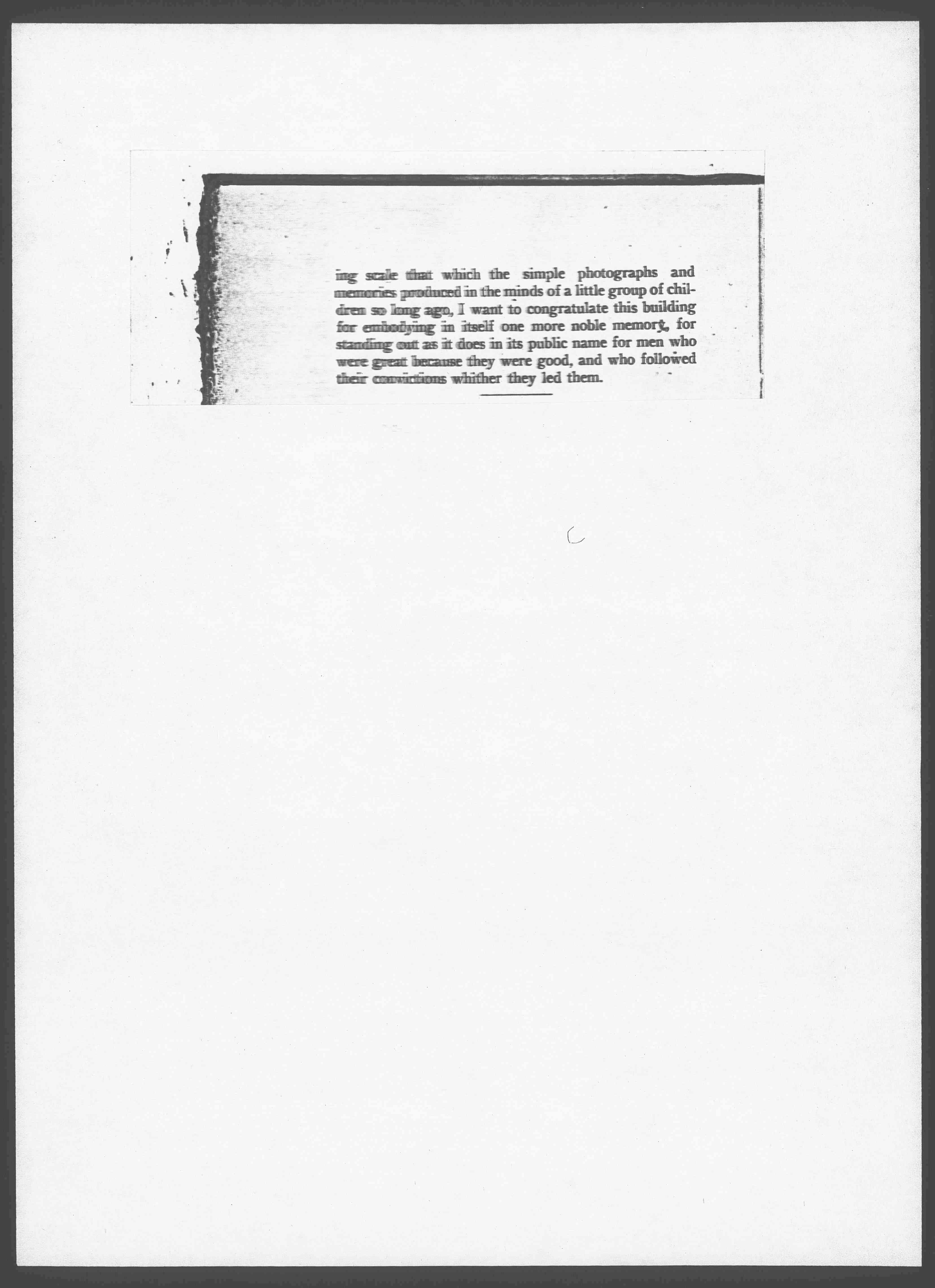 If this room which is dedicated to the name of this brave man may suggest to little children, to the growing youth who is ever eager to make the world a theater for heroic deeds, if it may stir in some of the older people who are beginning to doubt that the world is such a place and to consider it only the place for ordinary things; if this room and this name shall accomplish on a larger and more enduring [page 4] scale that which the simple photographs and memories produced in the minds of a little group of children so long ago, I want to congratulate this building for embodying in itself on more noble memory, for standing out as it does in its public name for men who were great because they were good, and who followed their convictions whither they led them.