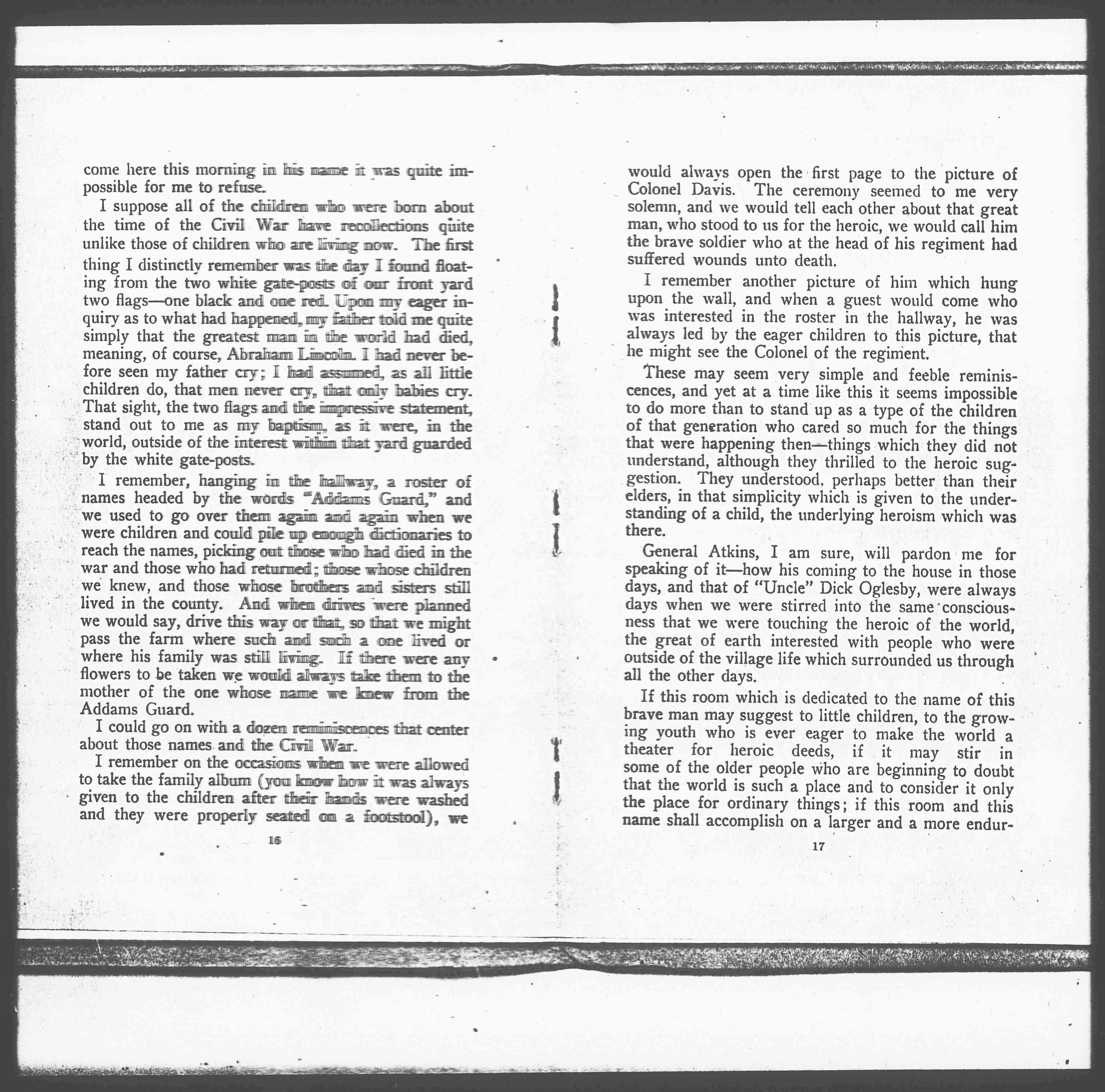 I remember, hanging in the hallway, a roster of names headed by the words "Addams Guard," and we used to go over them again and again when we were children and could pile up enough dictionaries to reach the names, picking out those who had died in the war and those who had returned; those whose children we knew, and those whose brothers and sisters still lived in the country. And when drives were planned we would say, drive this way or that, so that we might pass the farm where such and such a one lived or where his family was still living. If there were any flowers to be taken we would always take them to the mother of the one whose name we knew from the Addams Guard.