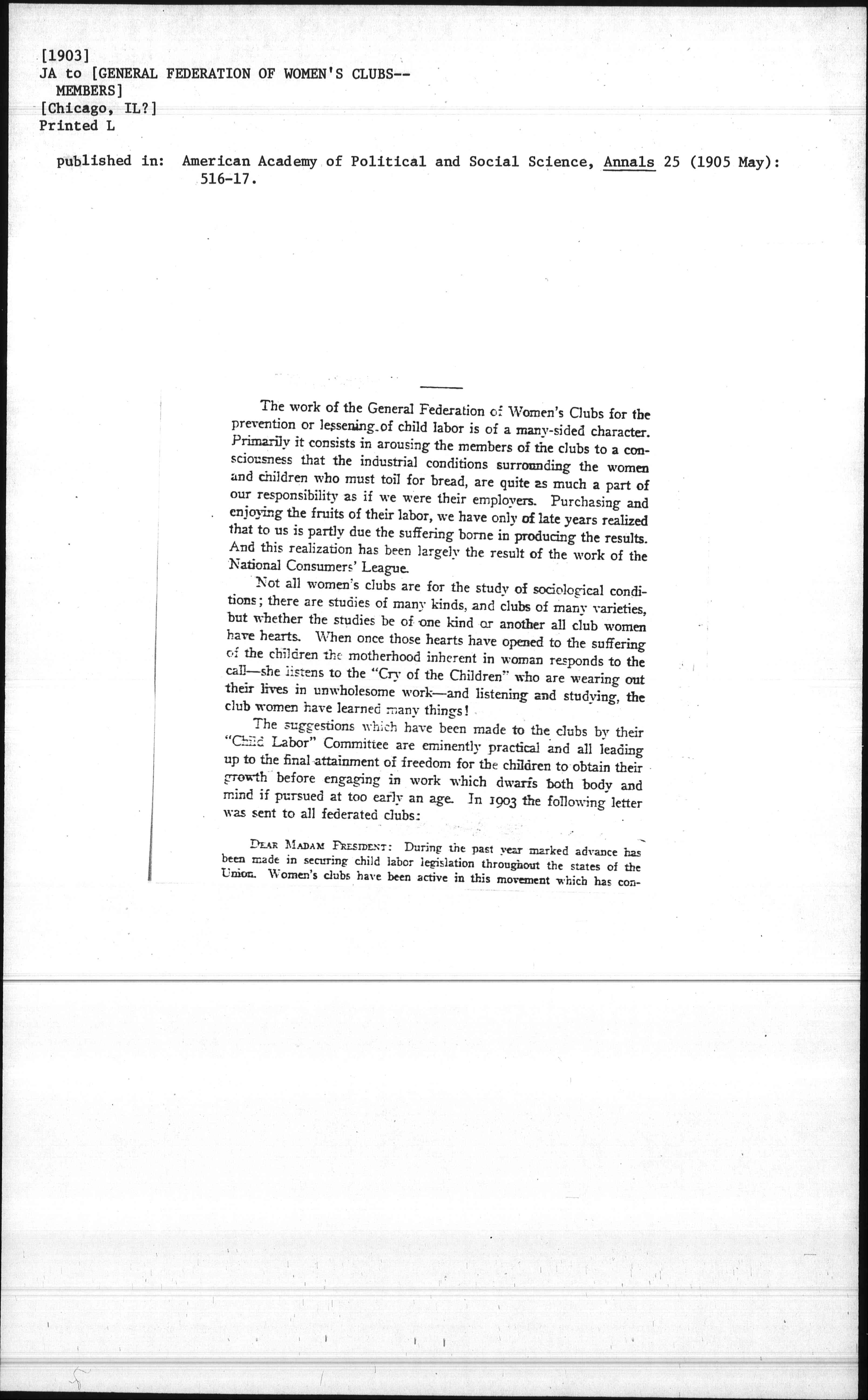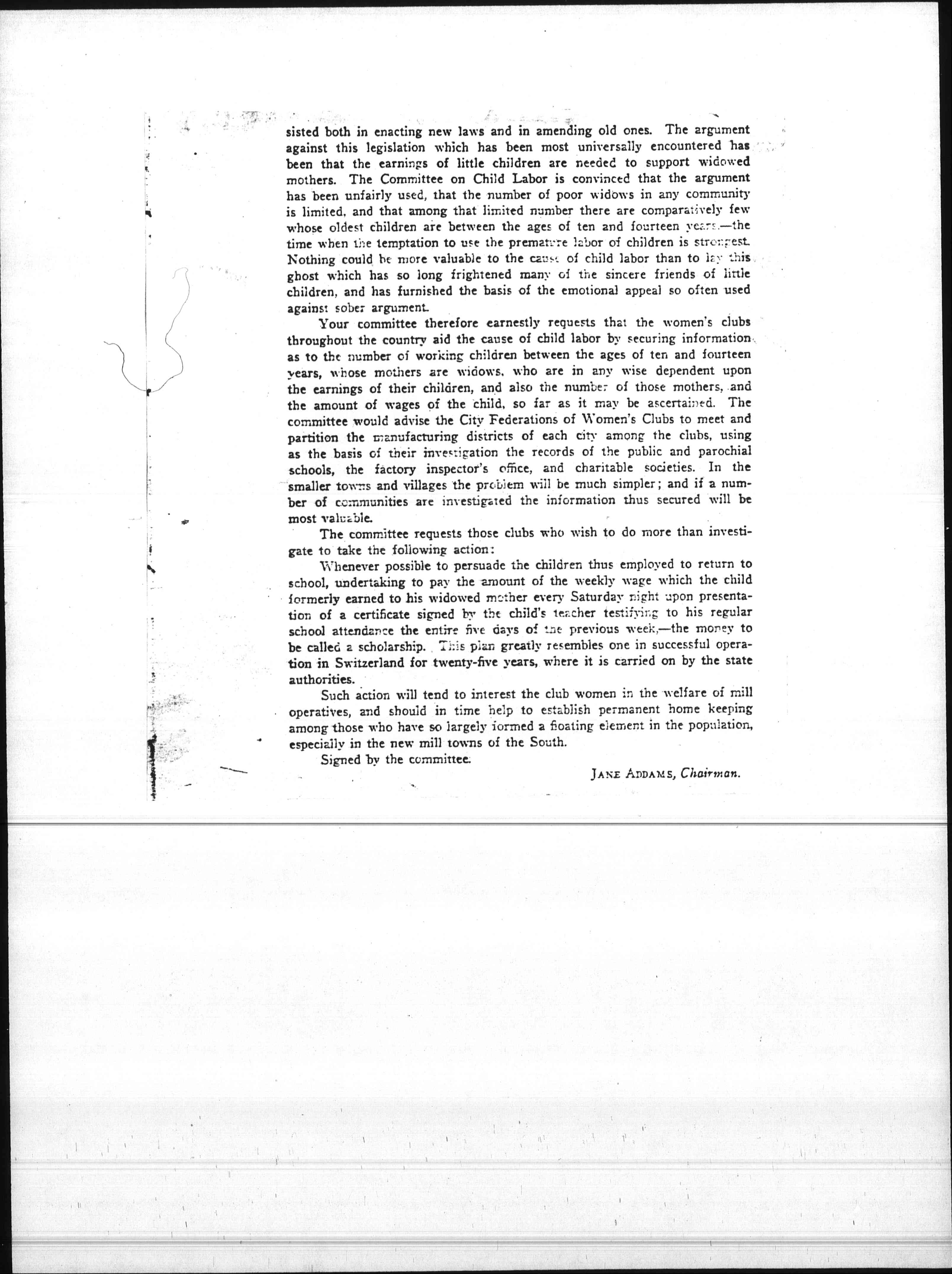 During the past year marked advance has been made in securing child labor legislation throughout the states of the Union. Women's clubs have been active in this movement which has [page 2] consisted both in enacting new laws and in amending old ones. The argument against this legislation which has been most universally encountered has been that the earnings of little children are needed to support widowed mothers. The Committee on Child Labor is convinced that the argument has been unfairly used, that the number of poor widows in any community is limited, and that among that limited number there are comparatively few whose oldest children are between the ages of ten and fourteen years -- the time when the temptation to use the premature labor of children is strongest. Nothing could be more valuable to the cause of child labor than to lay this ghost which has so long frightened many of the sincere friends of little children, and has furnished the basis of the emotional appeal so often used against sober argument.