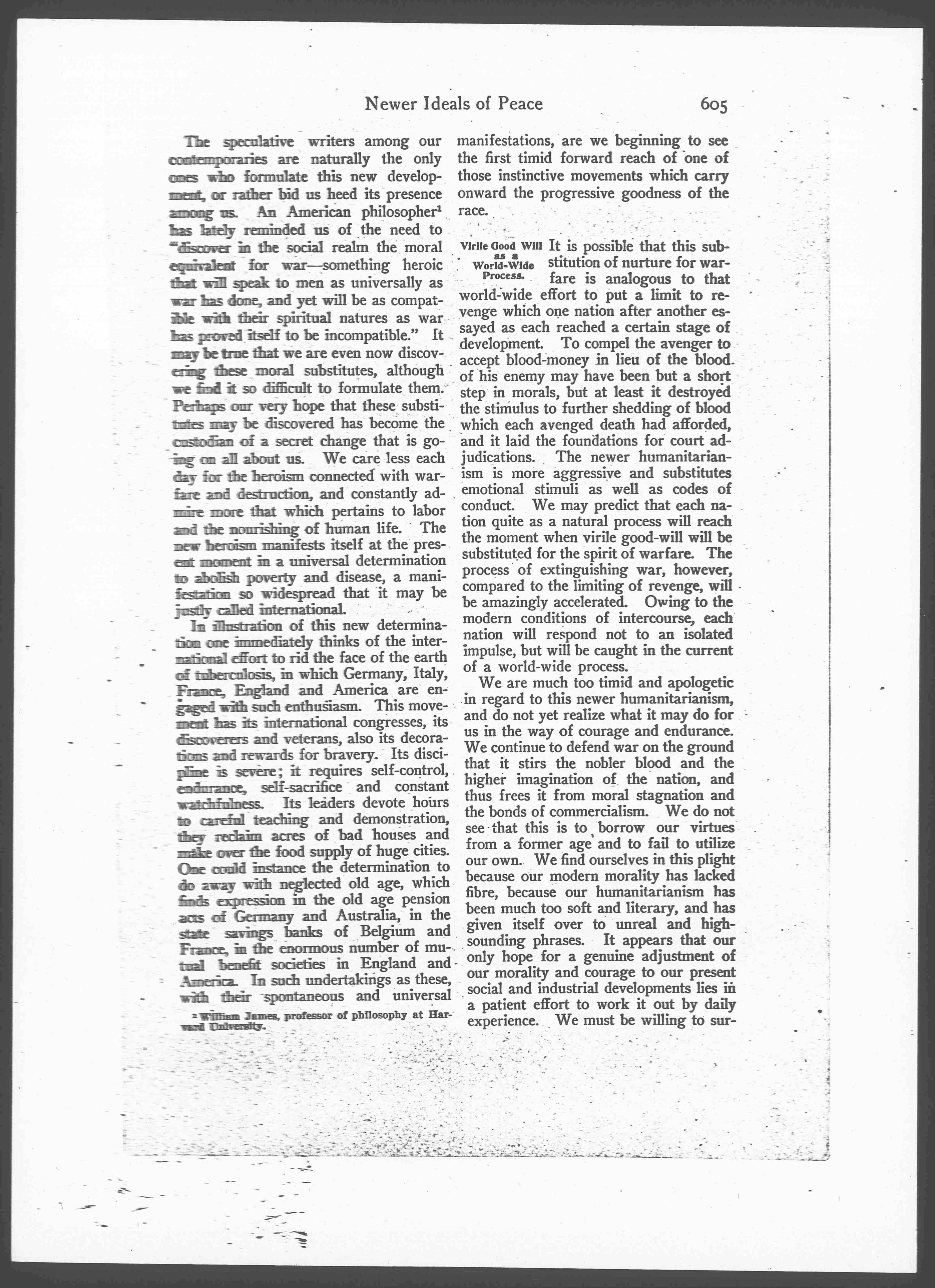 Primitive Dynamics of the Newer Peace. It is difficult to formulate the newer, dynamic peace, embodying the later humanism, as over against the old dogmatic peace. The word "non-resistance" is misleading, because it is much too feeble and inadequate. It suggests passivity, the goody-goody attitude of ineffectiveness. The words "overcoming," "substituting," "re-creating," "readjusting moral values," "forming new centers of spiritual energy," carry much more of the meaning implied. For it is not merely the desire for a conscience at rest, for a sense of justice no longer outraged, that would pull us into new paths where there would be no more war nor preparations for war. There are still more strenuous forces at work reaching down to impulses and experiences as primitive and profound as are those of struggle itself. That "ancient kindliness which sat beside the cradle of the race," and which is ever ready to assert itself against ambition and greed and the desire for achievement, is manifesting itself now with unusual force, and for the first time presents international aspects.