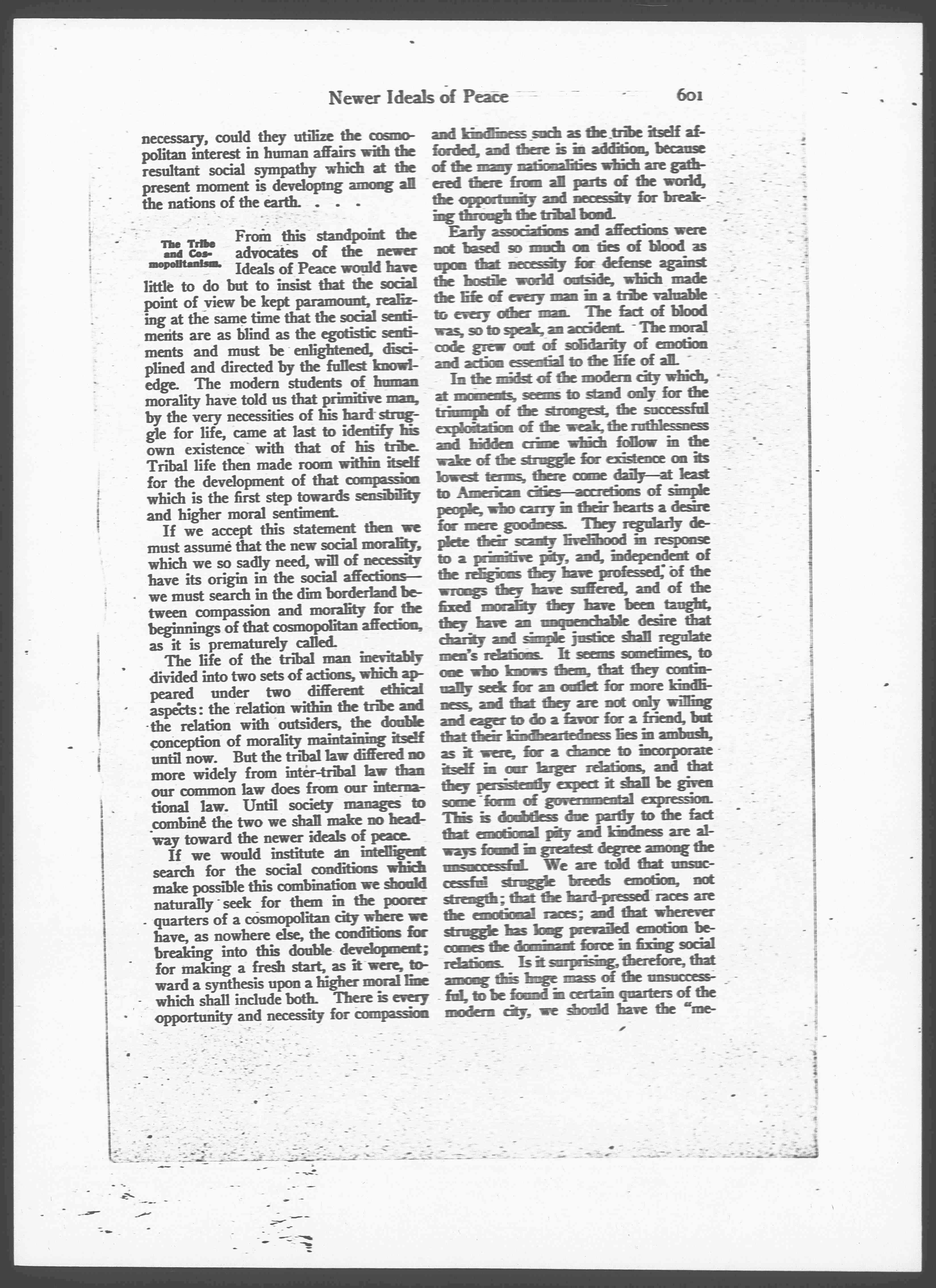 The Tribe and Cosmopolitanism. From this standpoint the advocates of the newer Ideals of Peace would have little to do but to insist that the social point of view be kept paramount, realizing at the same time that the social sentiments are as blind as the egotistic sentiments and must be enlightened, disciplined and directed by the fullest knowledge. The modern students of human morality have told us that primitive man, by the very necessities of his hard struggle for life, came at last to identify his own existence with that of his tribe. Tribal life then made room within itself for the development of that compassion which is the first step towards sensibility and higher moral sentiment.