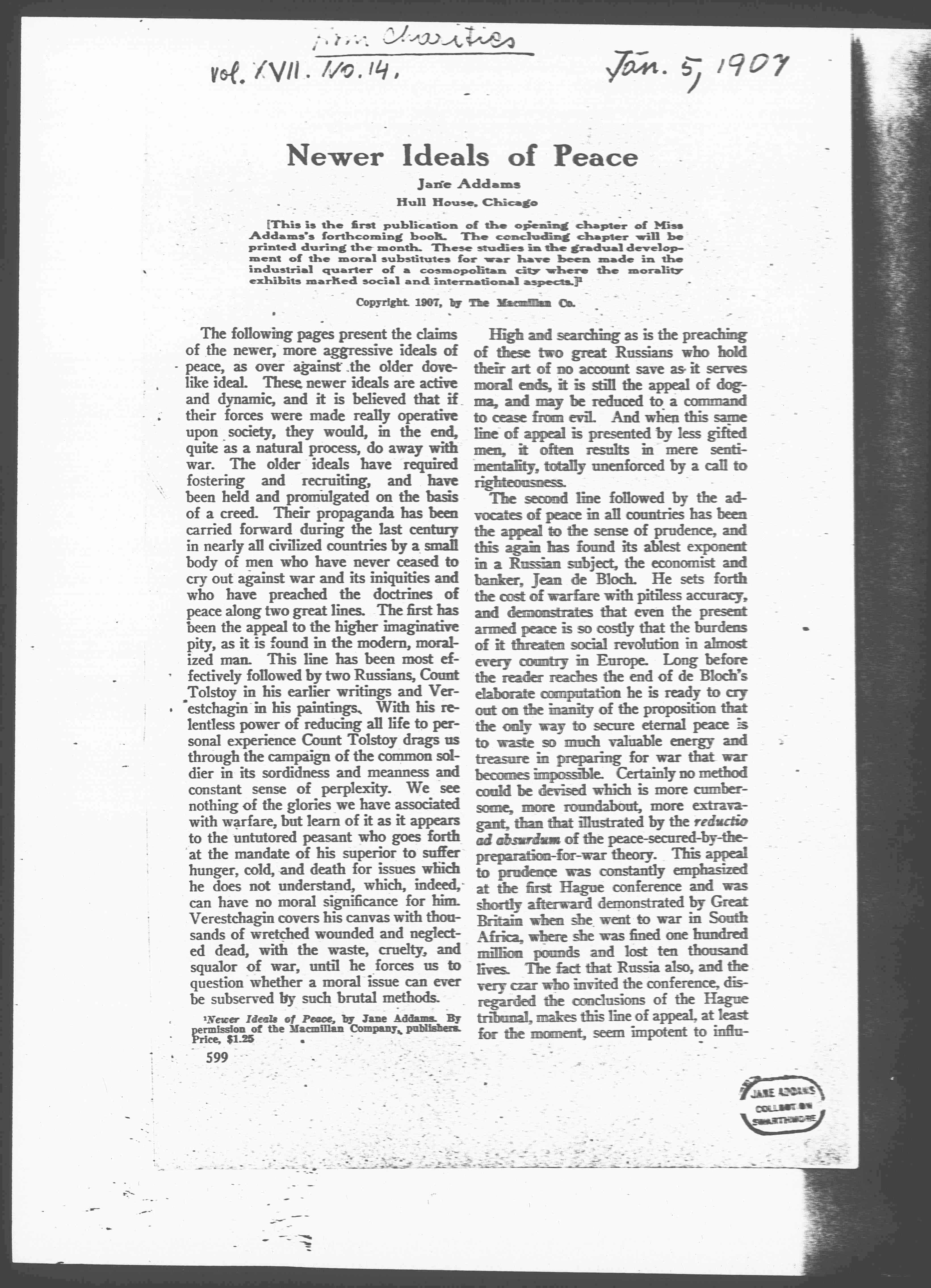 [1] Newer Ideals of Peace, by Jane Addams. By permission of the Macmillan Company, publishers. Price, $1.25