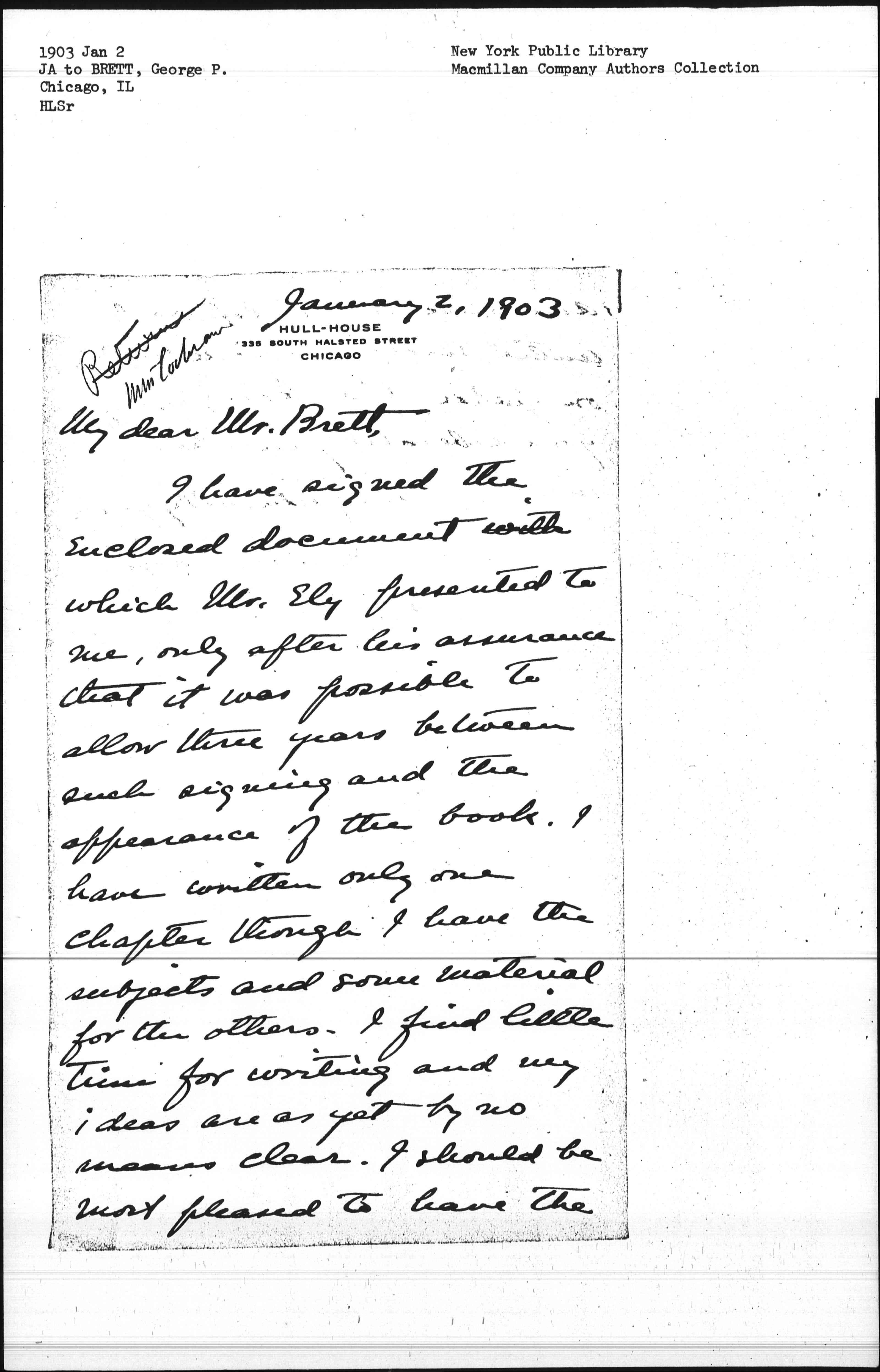 I have signed the enclosed document with which Mr. Ely presented to me, only after his assurance that it was possible to allow three years between such signing and the appearance of the book. I have written only one chapter though I have the subjects and some material for the others. I find little time for writing and my ideas are as yet by no means clear. I should be most pleased to have the [page 2] announcement deferred until more of the <book> is actually on paper. Thanking you for your liberality in the matter. I am faithfully yoursÂ