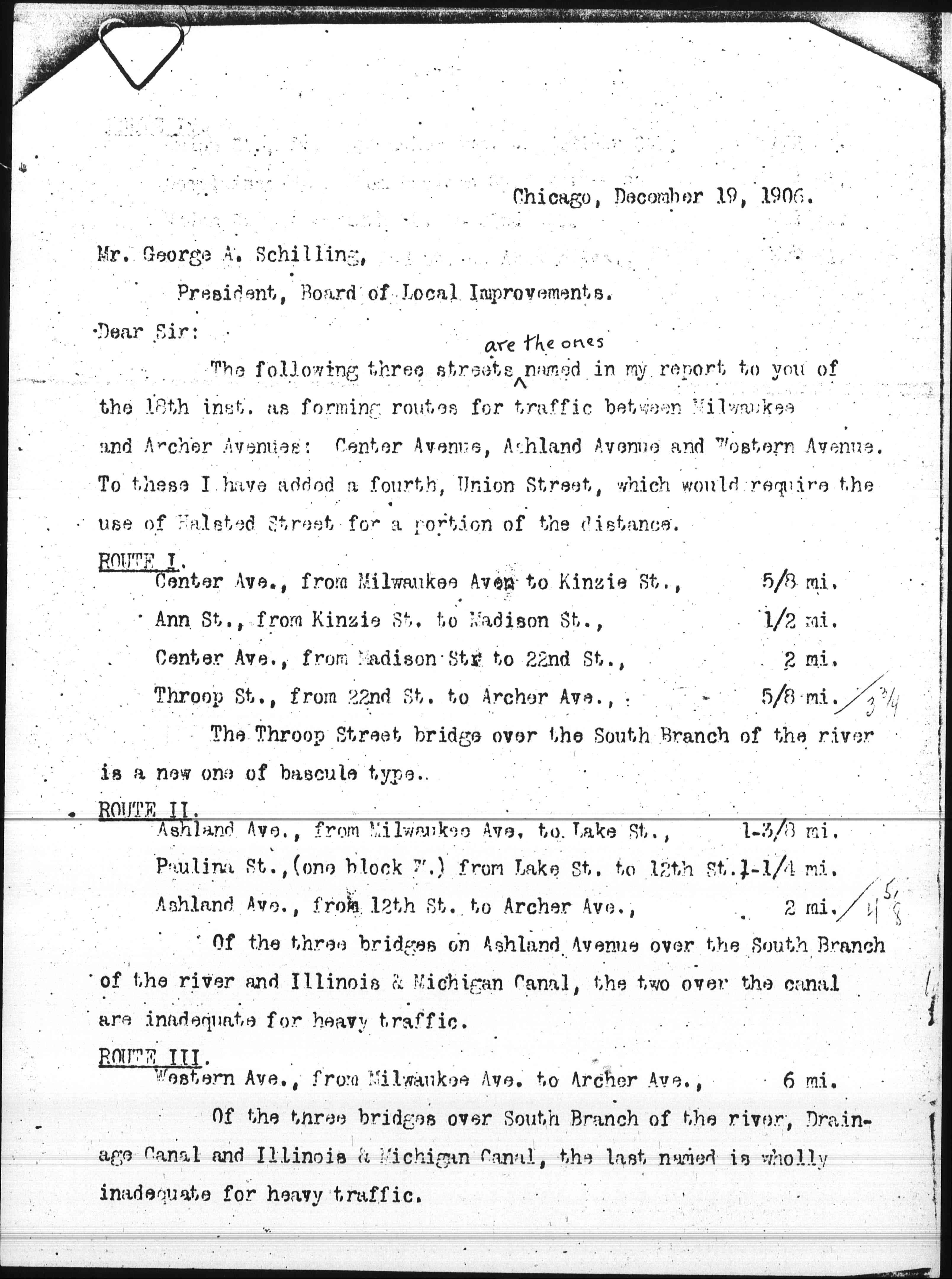 The following three streets ↑are the ones↓ named in my report to you of the 18th inst. as forming routes for traffic between Milwaukee and Archer Avenues: Center Avenue, Ashland Avenue and Western Avenue. To these I have added a fourth, Union Street, which would require the use of Halsted Street for a portion of the distance.