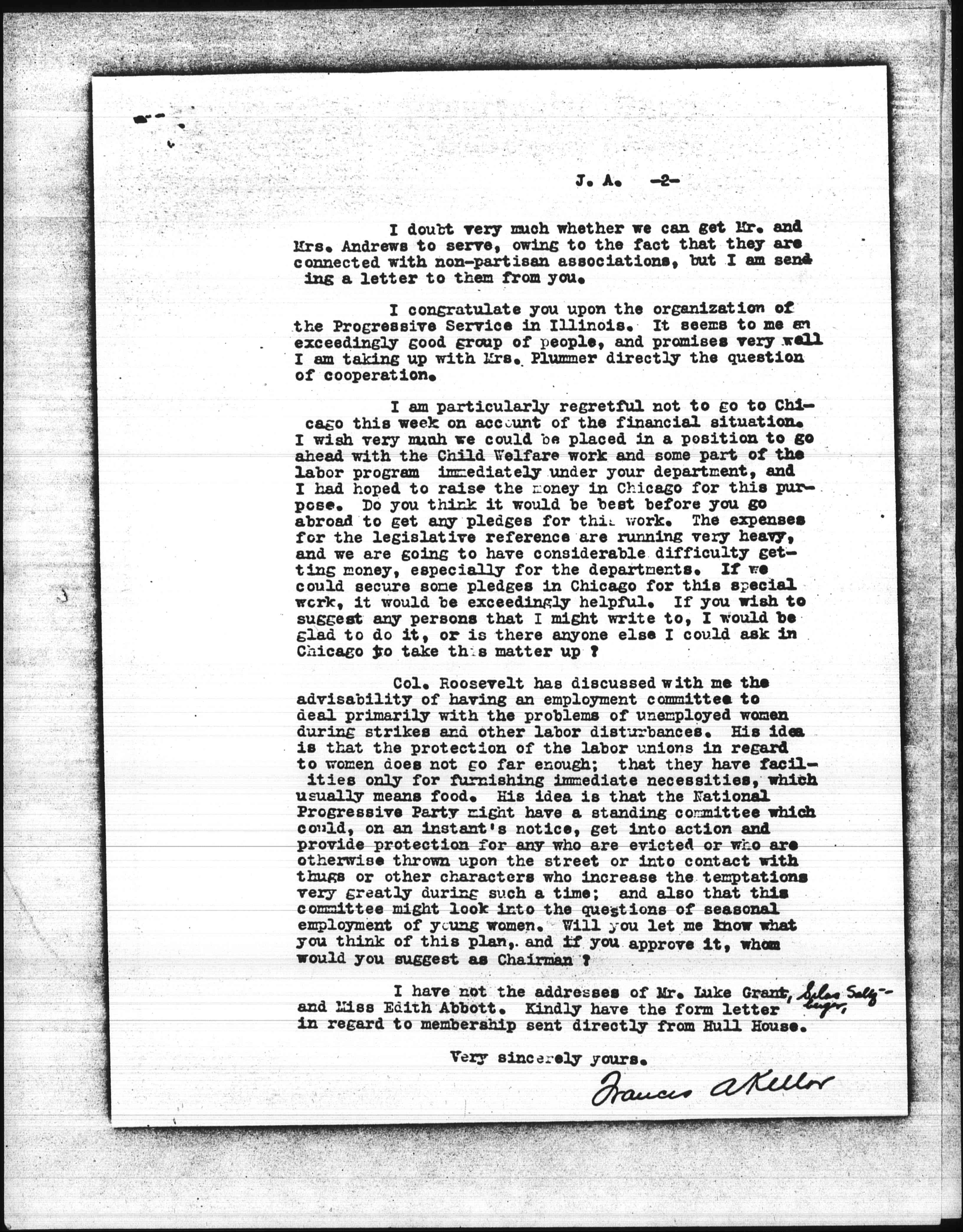 I have not the addresses of Mr. Luke Grant, <Silas Saltzberger,> and Miss Edith Abbott. Kindly have the form letter in regard to membership sent directly from Hull House.