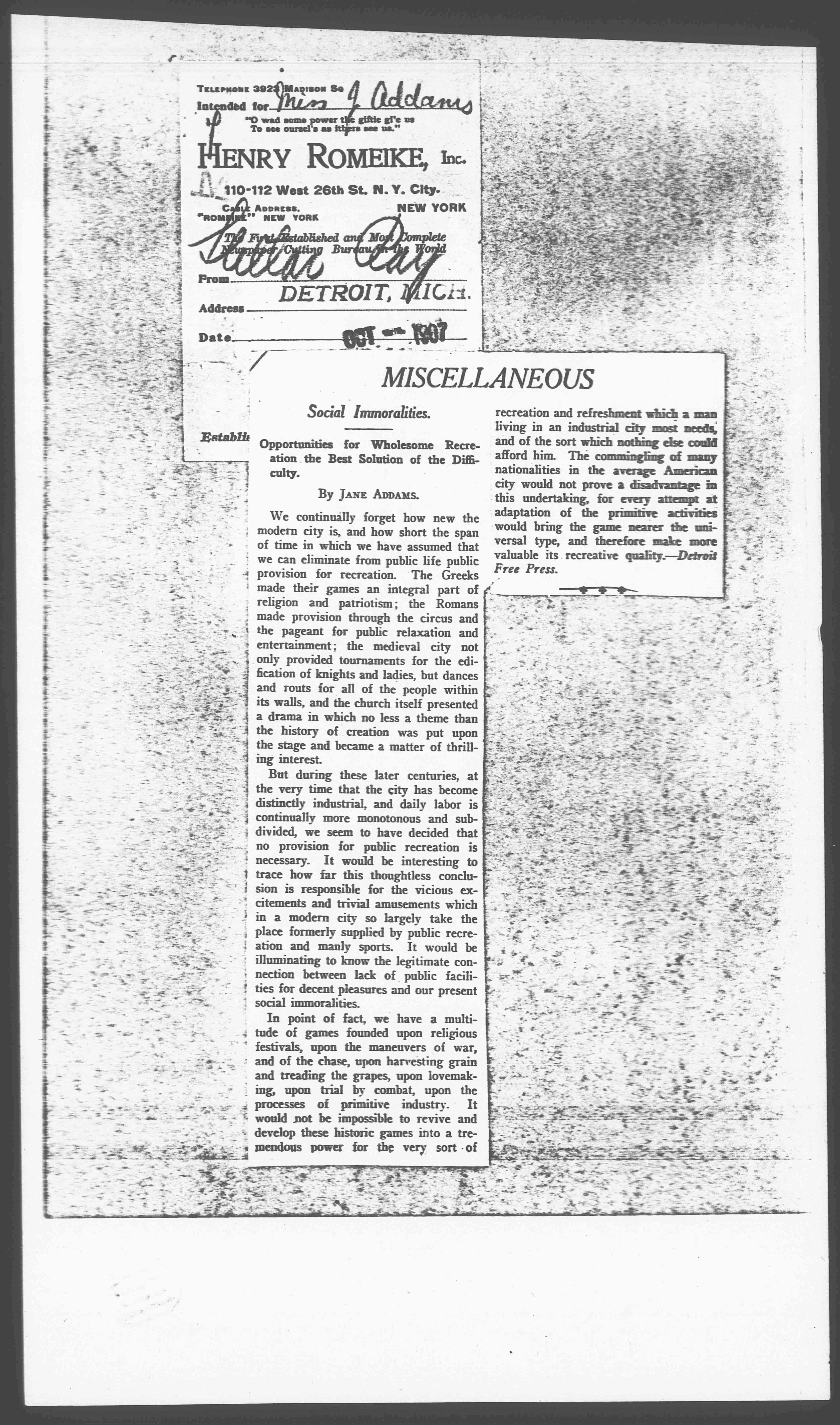 We continually forget how new the modern city is, and how short the span of time in which we have assumed that we can eliminate from public life public provision for recreation. The Greeks made their games an integral part of religion and patriotism; the Romans made provision through the circus and the pageant for public relaxation and entertainment; the medieval city not only provided tournaments for the edification of knights and ladies, but dances and routs for all of the people within its walls, and the church itself presented a drama in which no less a theme than the history of creation was put upon the stage and became a matter of thrilling interest.