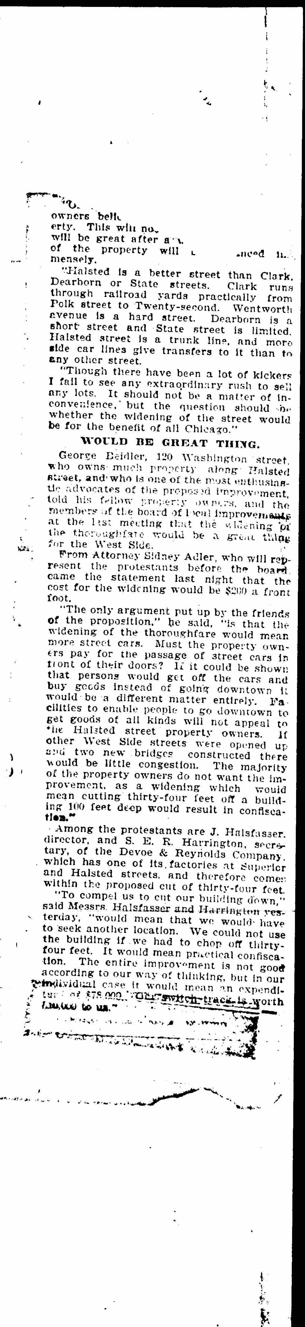 George Beidler, 120 Washington street, who owns much property along Halsted street, and who is one of the most enthusiastic advocates of the proposed improvement, told his fellow property owners, and the members of the board of local improvements at the last meeting that the widening of the thoroughfare would be a great thing for the West Side.