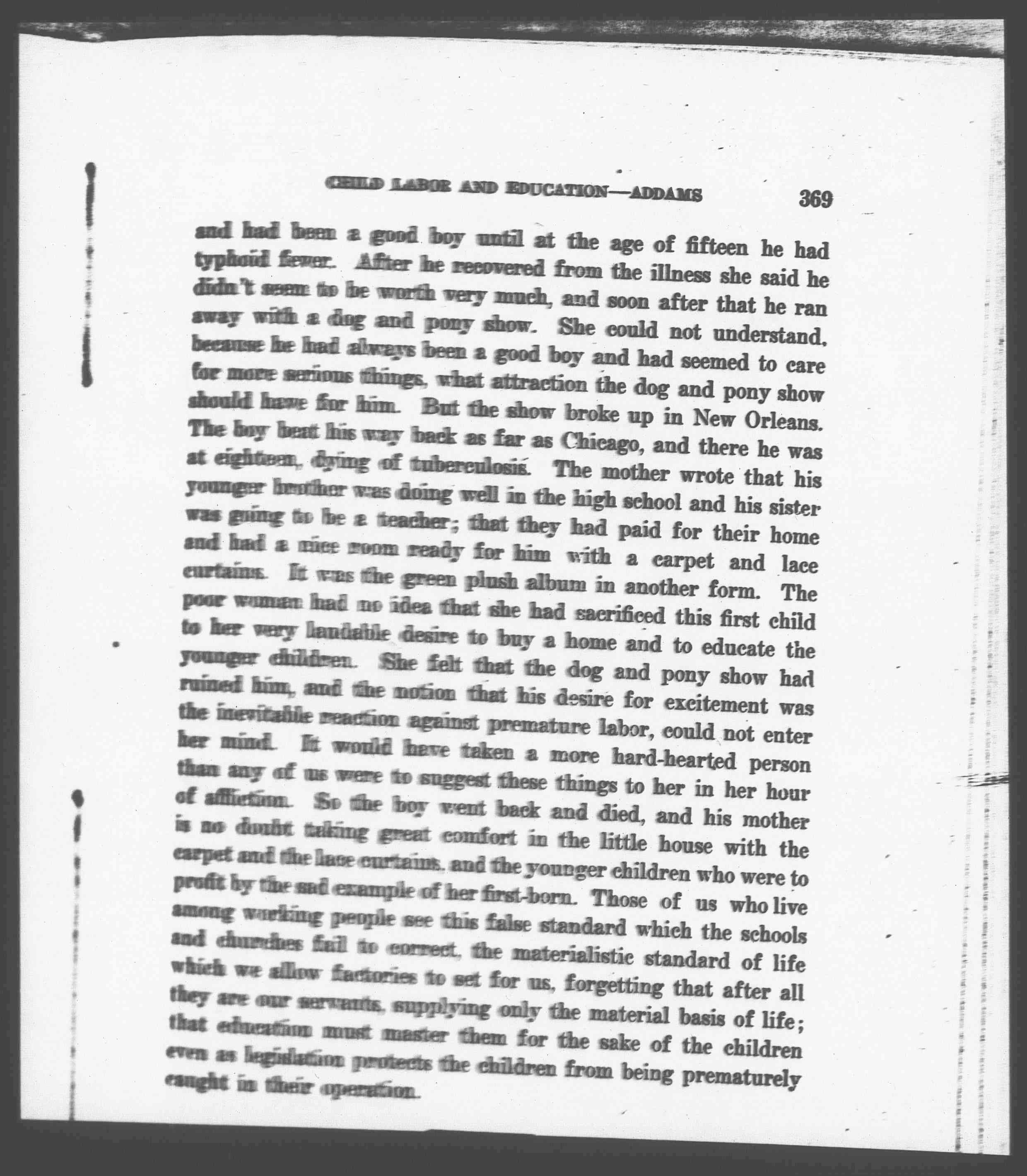 The story that Miss Gordon told about the children who are sacrificed to the green plush album, reminded me of an experience we had in a lodging house in Chicago. A boy of eighteen came there dying of tuberculosis. We wrote to his mother in Pittsburg, and she sent some money that we might send him home, and with the money was a long letter expressing her disappointment in this boy, stating that he had gone to work in a glass factory at nine, where he stayed three years; then he went with his father into one of the large foundries in Pittsburg [page 6] and had been a good boy until at the age of fifteen he had typhoid fever. After he recovered from the illness she said he didn't seem to be worth very much, and soon after that he ran away with a dog and pony show. She could not understand, because he had always been a good boy and had seemed to care for more serious things, what attraction the dog and pony show should have for him. But the show broke up in New Orleans. The boy beat his way back as far as Chicago, and there he was at eighteen, dying of tuberculosis. The mother wrote that this younger brother was doing well in the high school and his sister was going to be a teacher; that they had paid for their home and had a nice room ready for him with a carpet and lace curtains. It was the green plush album in another form. The poor woman had no idea that she had sacrificed this first child to her very laudable desire to buy a home and to educate the younger children. She felt that the dog and pony show had ruined him, and the notion that his desire for excitement was the inevitable reaction against premature labor, could not enter her mind. It would have taken a more hard-hearted person than any of us were to suggest these things to her in her hour of affliction. So the boy went back and died, and his mother is no doubt taking great comfort in the little house with the carpet and the lace curtains, and the younger children who were to profit by the sad example of her first-born. Those of us who live among working people see this false standard which the schools and churches fail to correct, the materialistic standard of life which we allow factories to set for us, forgetting that after all they are our servants, supplying only the material basis of life; that education must master them for the sake of the children even as legislation protects the children from being prematurely caught in their operation.