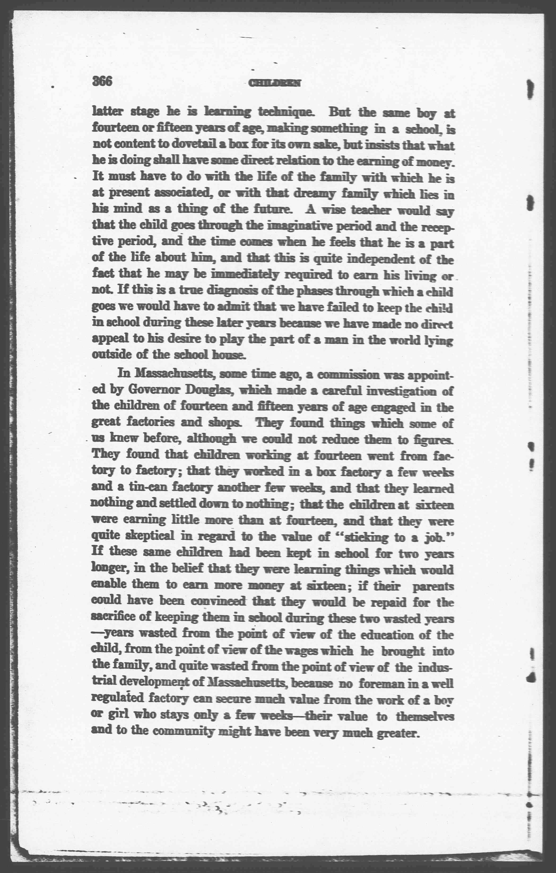 In Massachusetts, some time ago, a commission was appointed by Governor Douglas, which made a careful investigation of the children of fourteen and fifteen years of age engaged in the great factories and shops. They found things which some of us knew before, although we could not reduce them to figures. They found that children working at fourteen went from factory to factory; that they worked in a box factory a few weeks and a tin-can factory another few weeks, and that they learned nothing and settled down to nothing; that the children at sixteen were earning little more than at fourteen, and that they were quite skeptical in regard to the value of "sticking to a job." If these same children had been kept in school for two years longer, in the belief that they were learning things which would enable them to earn more money at sixteen; if their parents could have been convinced that they would be repaid for the sacrifice of keeping them in school during these two wasted years -- years wasted from the point of view of the education of the child, from the point of view of the wages which he brought into the family, and quite wasted from the point of view of the industrial development of Massachusetts, because no foreman in a well regulated factory can secure much value from the work of a boy or girl who stays only a few weeks -- their value to themselves and to the community might have been very much greater. [page 4]
