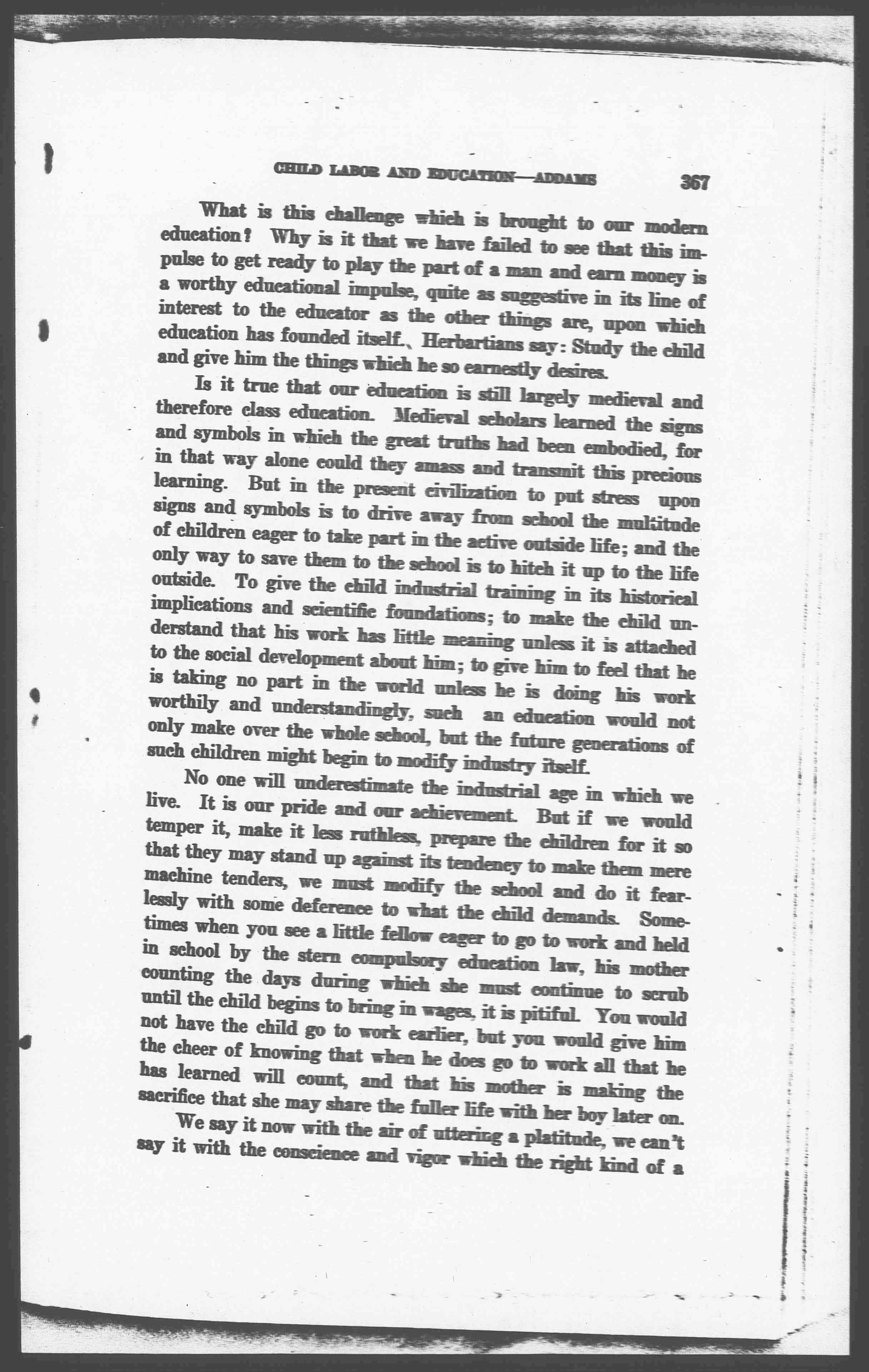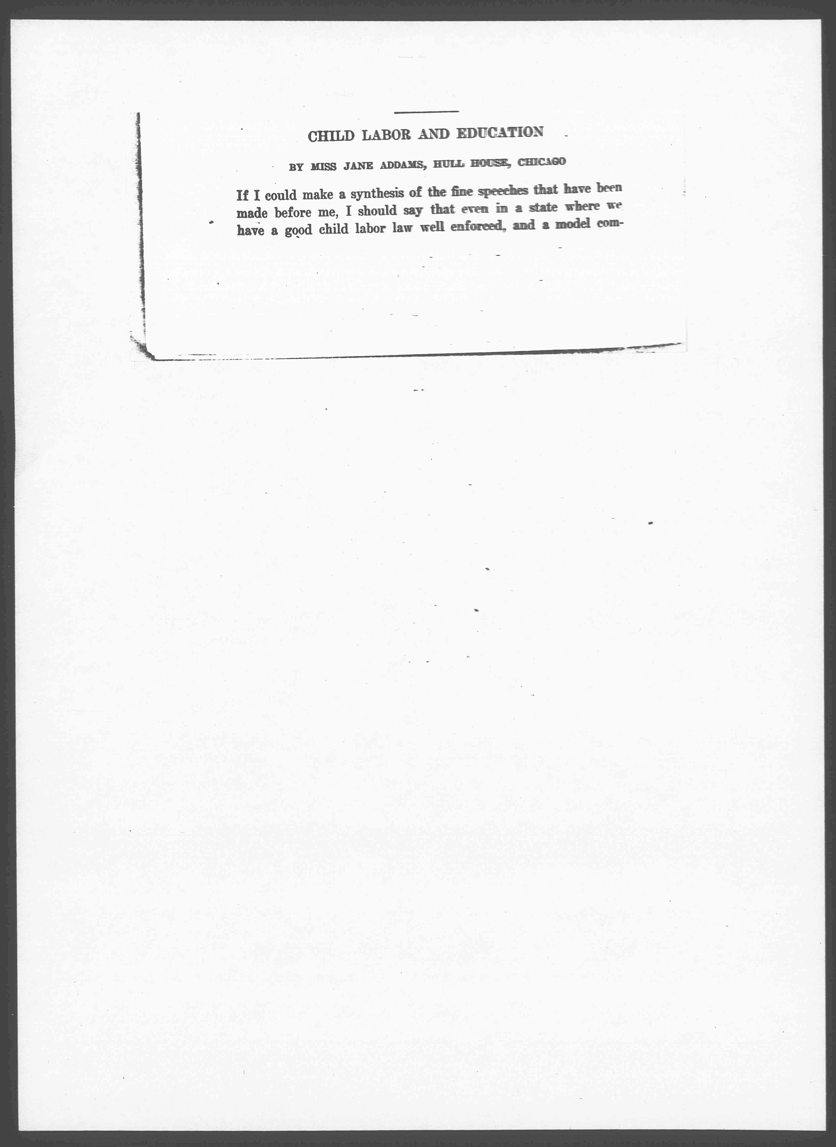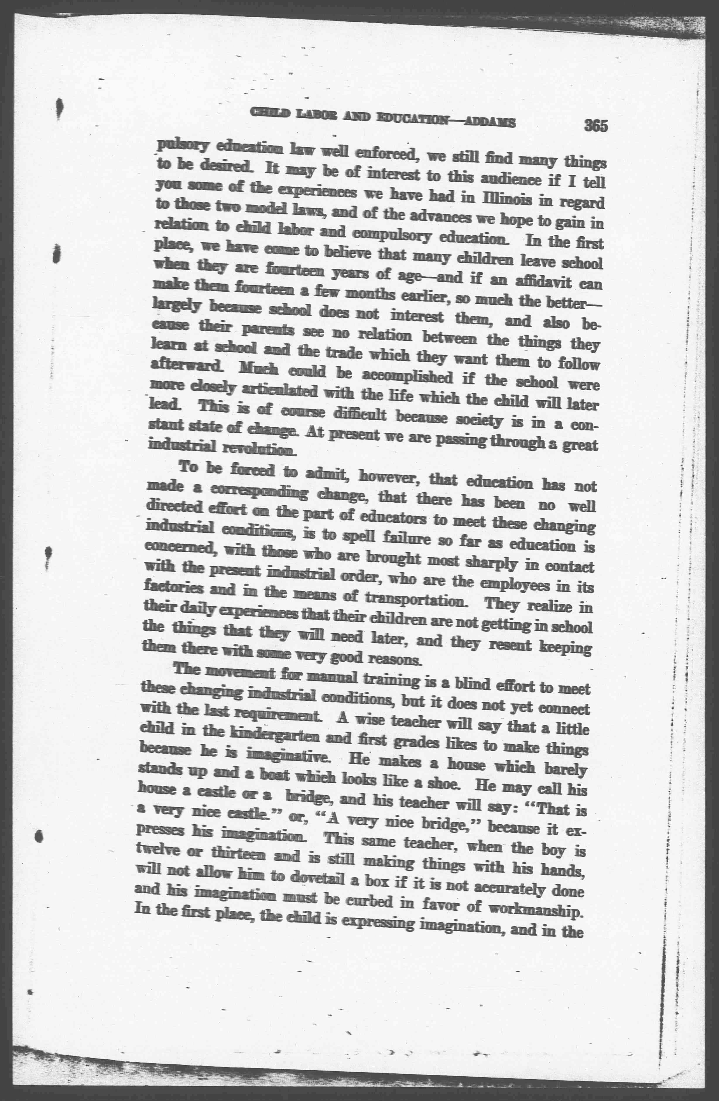 If I could make a synthesis of the fine speeches that have been made before me, I should say that even in a state where we have a good child labor law well enforced, and a model compulsory [page 2] education law well enforced, we still find many things to be desired. It may be of interest to this audience if I tell you some of the experiences we have had in Illinois in regard to those two model laws, and of the advances we hope to gain in relation to child labor and compulsory education. In the first place, we have come to believe that many children leave school when they are fourteen years of age -- and if an affidavit can make them fourteen a few months earlier, so much the better -- largely because school does not interest them, and also because their parents see no relation between the things they learn at school and the trade which they want them to follow afterward. Much could be accomplished if the school were more closely articulated with the life which the child will later lead. This is of course difficult because society is in a constant state of change. At present we are passing through a great industrial revolution.