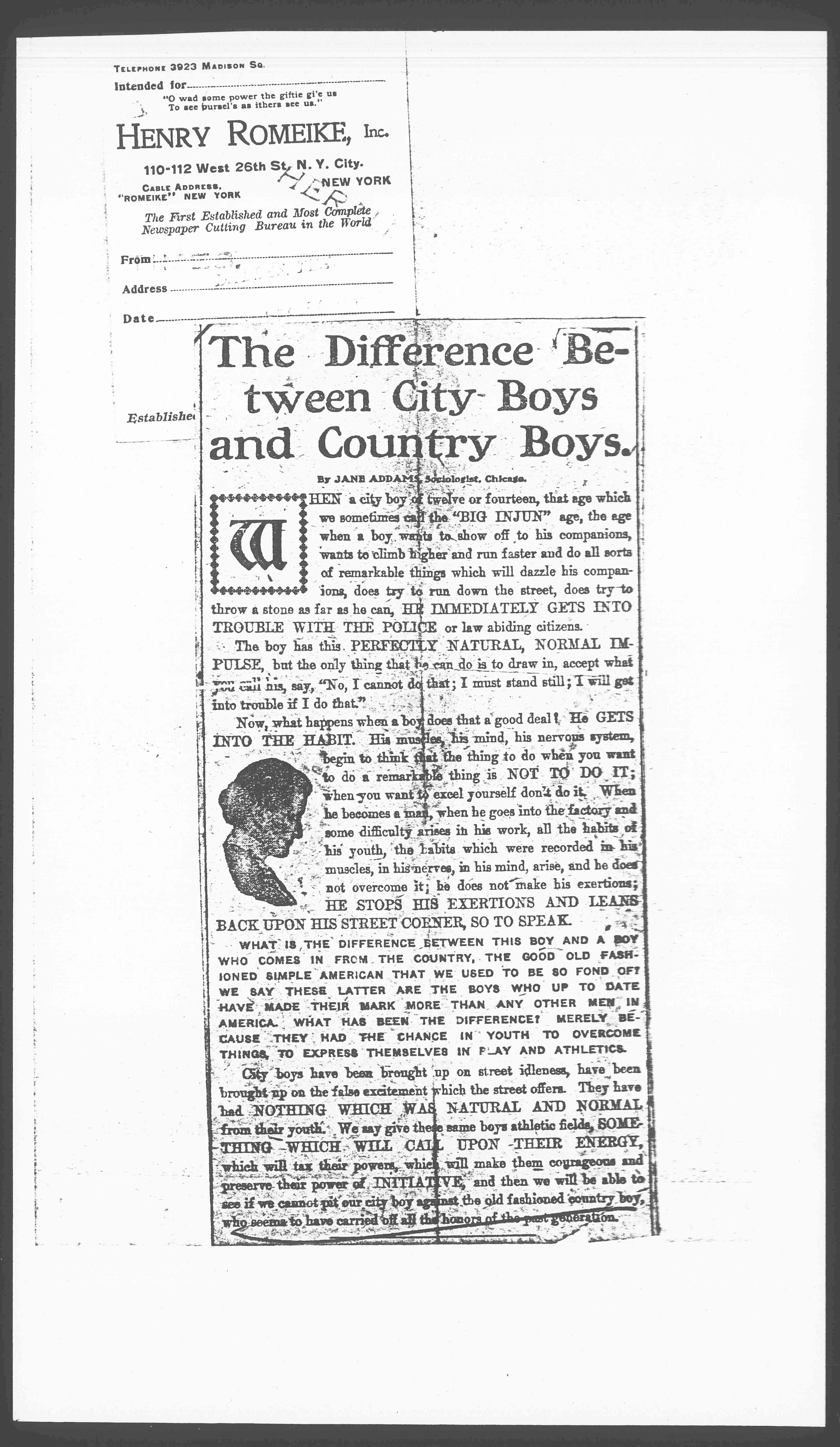 WHAT IS THE DIFFERENCE BETWEEN THIS BOY AND A BOY WHO COMES IN FROM THE COUNTRY, THE GOOD OLD FASHIONED SIMPLE AMERICAN THAT WE USED TO BE SO FOND OF? WE SAY THESE LATTER ARE THE BOYS WHO UP TO DATE HAVE MADE THEIR MARK MORE THAN ANY OTHER MEN IN AMERICA. WHAT HAS BEEN THE DIFFERENCE? MERELY BECAUSE THEY HAD THE CHANCE IN YOUTH TO OVERCOME THINGS, TO EXPRESS THEMSELVES IN PLAY AND ATHLETICS.